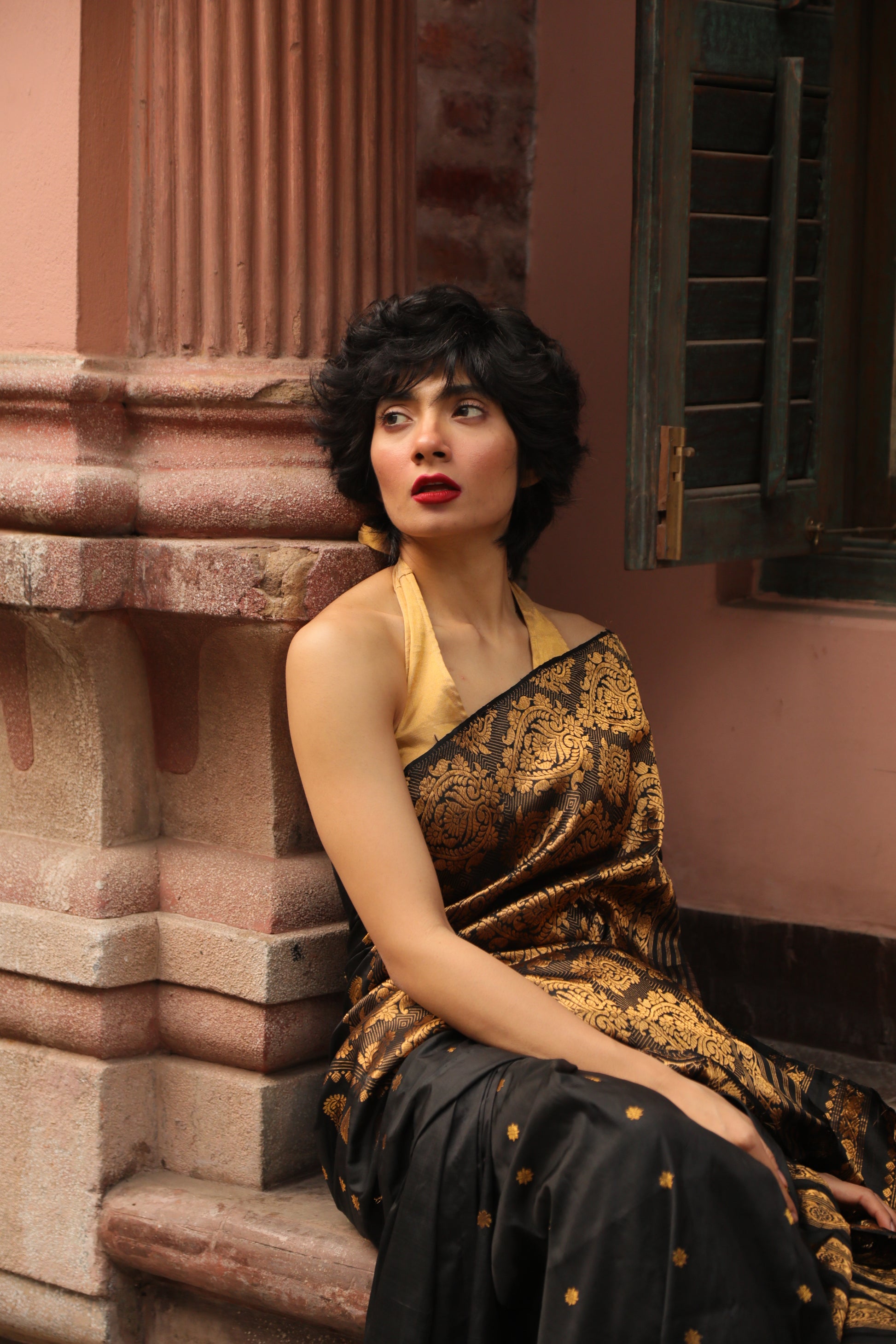 Our Black Mulberry Silk Saree handwoven with pure gold zari brocade work in aanchal/pallu with small zari buta work on entire body of the saree is a timeless beauty that never fades.