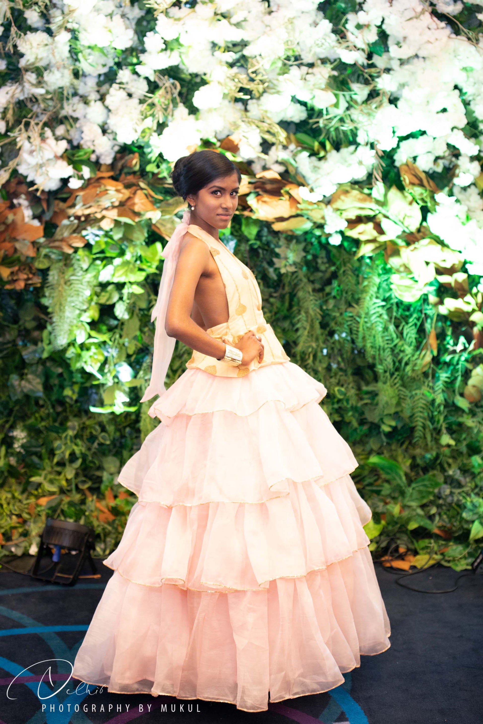 Dreams become reality with our divine hand-embroidered evening gown adorned with sequins. Tradition and trend come together in our kesa paat Assam Paat (Silk) dress with Xingkhap buta and dainty gold embroidery. Hand-embroidered sequins at the edge of blush organza layers make our evening dress the perfect pick for an elegant evening.