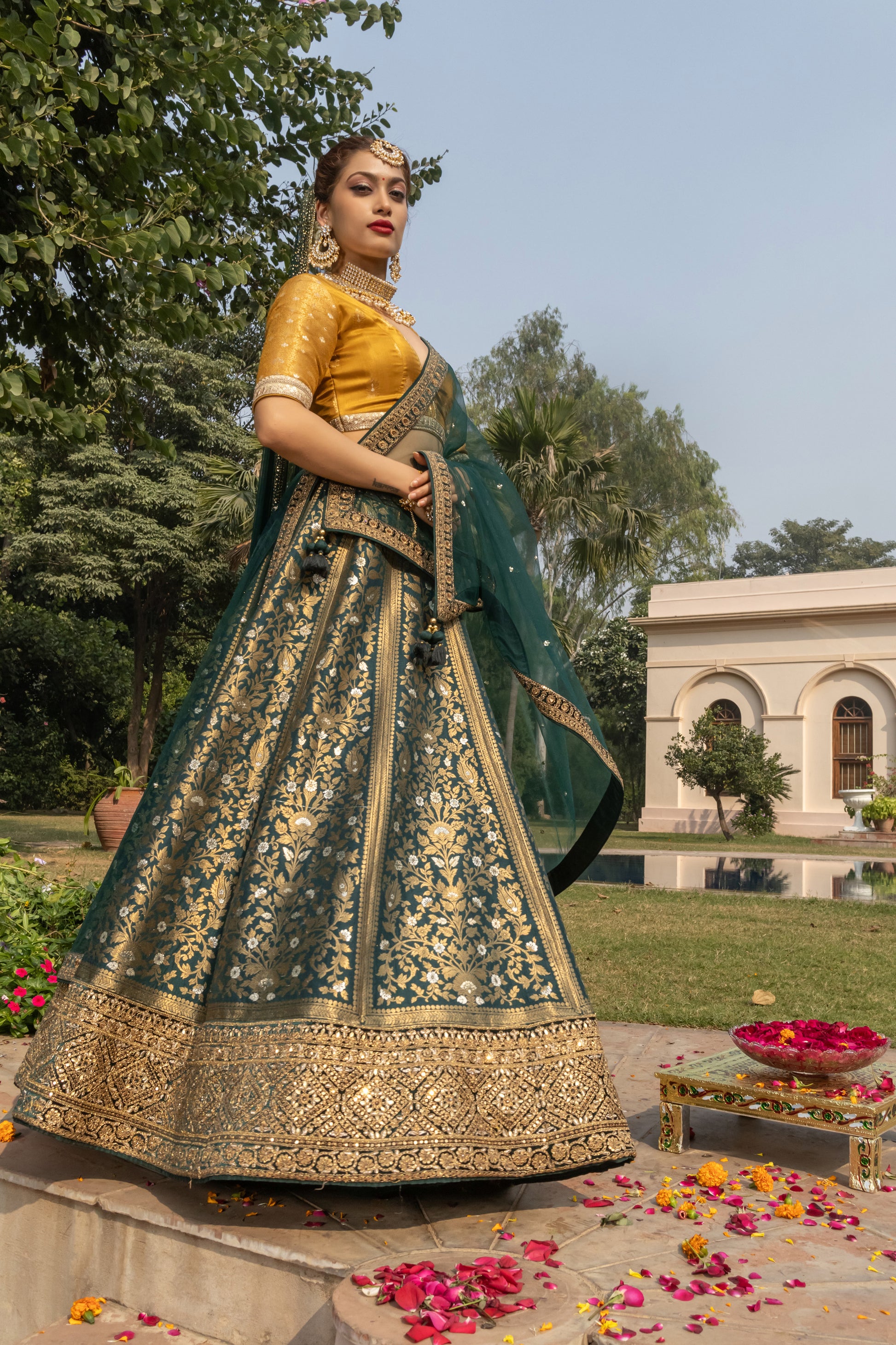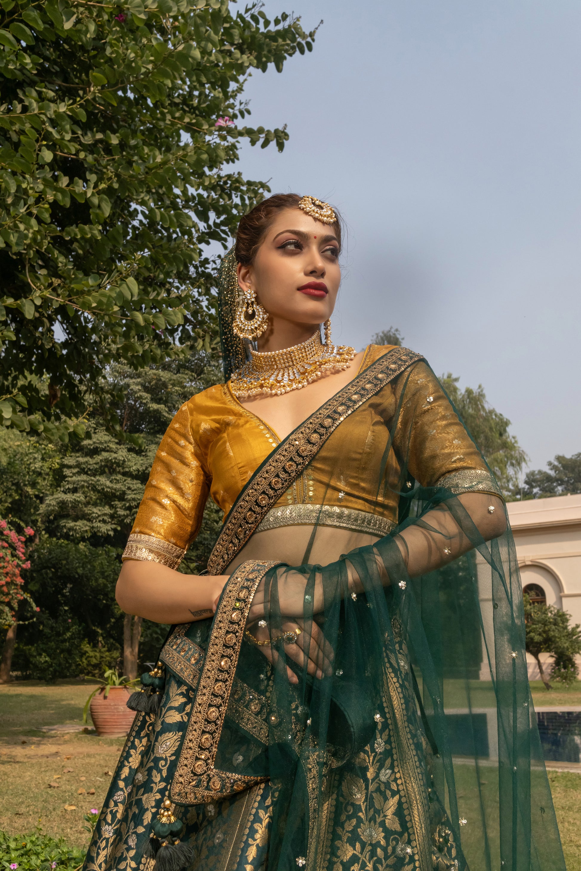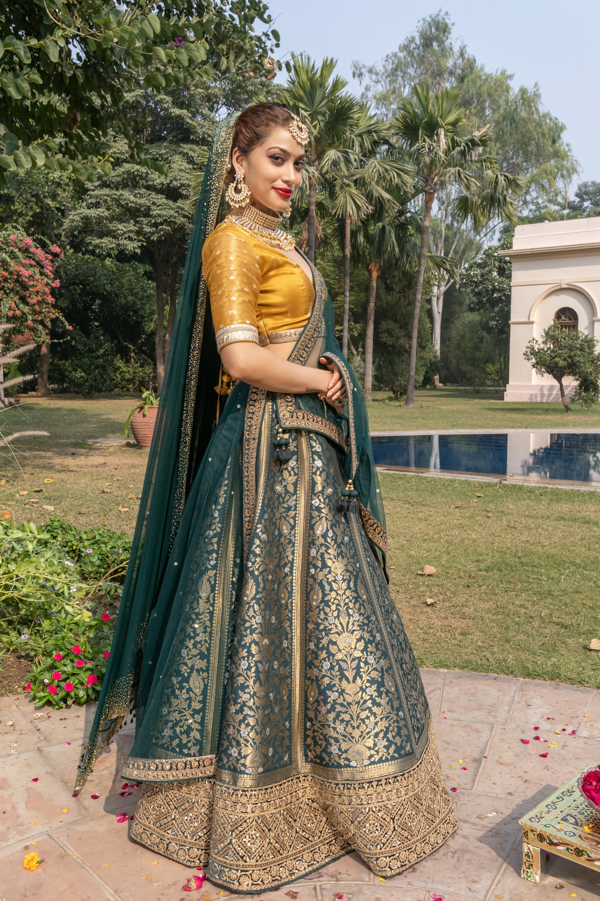 A timeless ode to tradition, this pine green banarasi brocade lehenga is woven from luxurious silk, featuring intricate motifs that capture the richness of age-old craft. Paired with a contrasting mustard yellow blouse, it brings together bold colour play and regal structure.