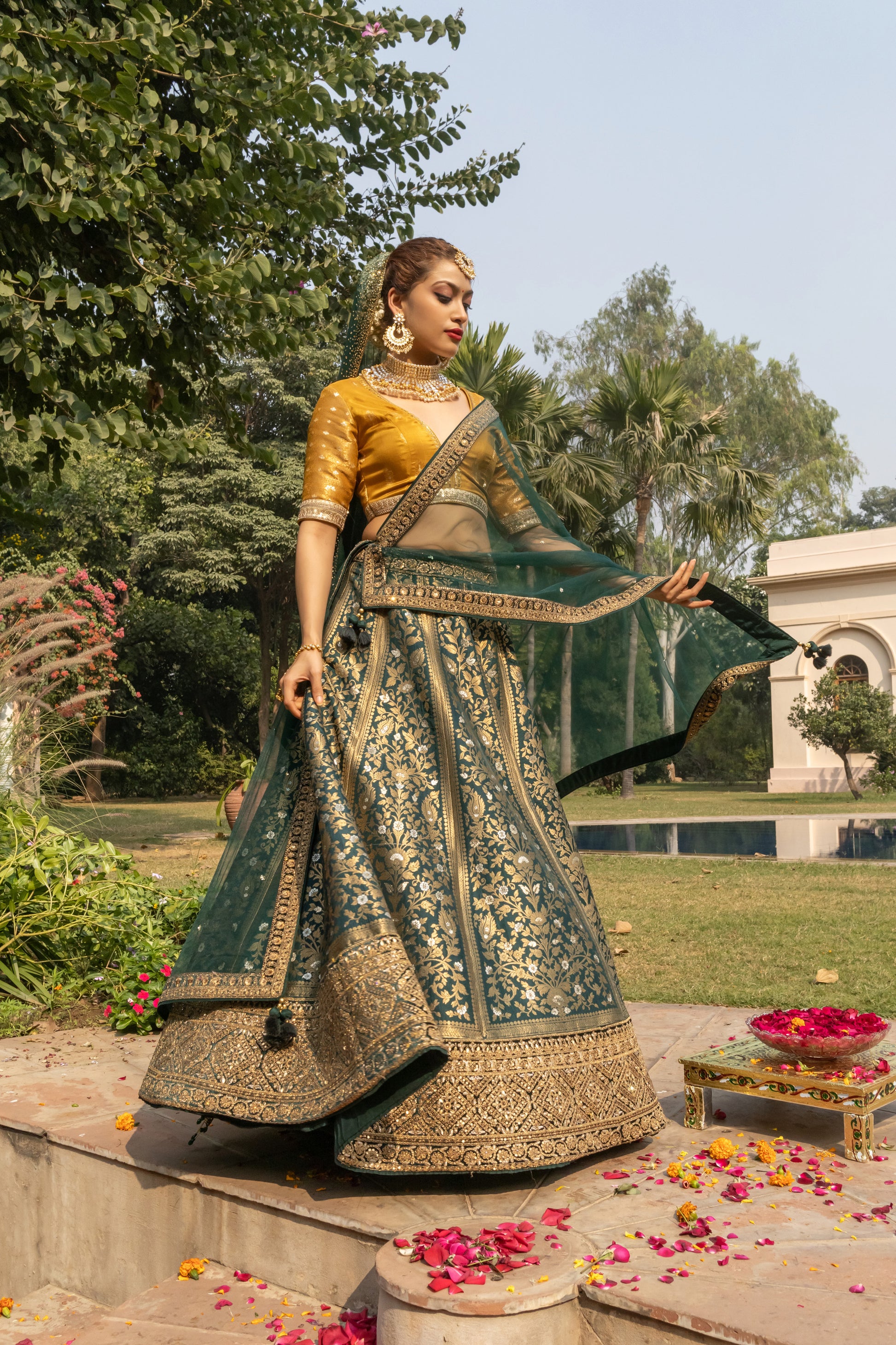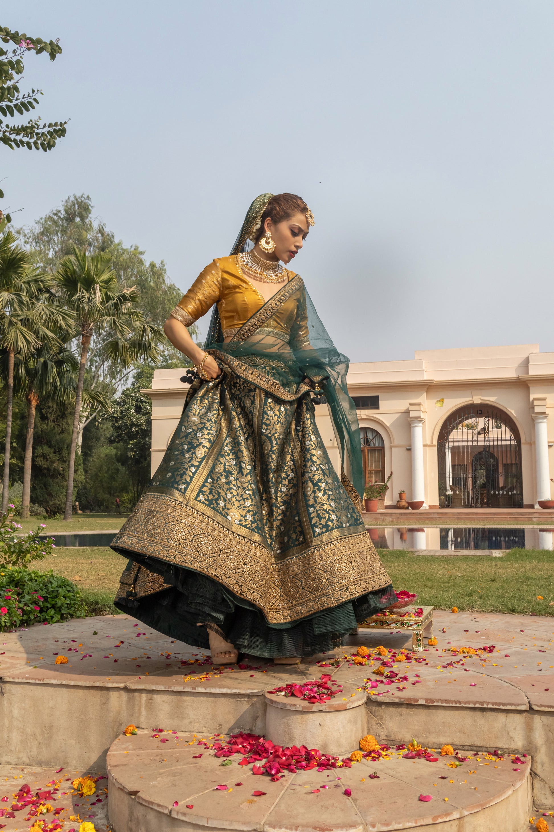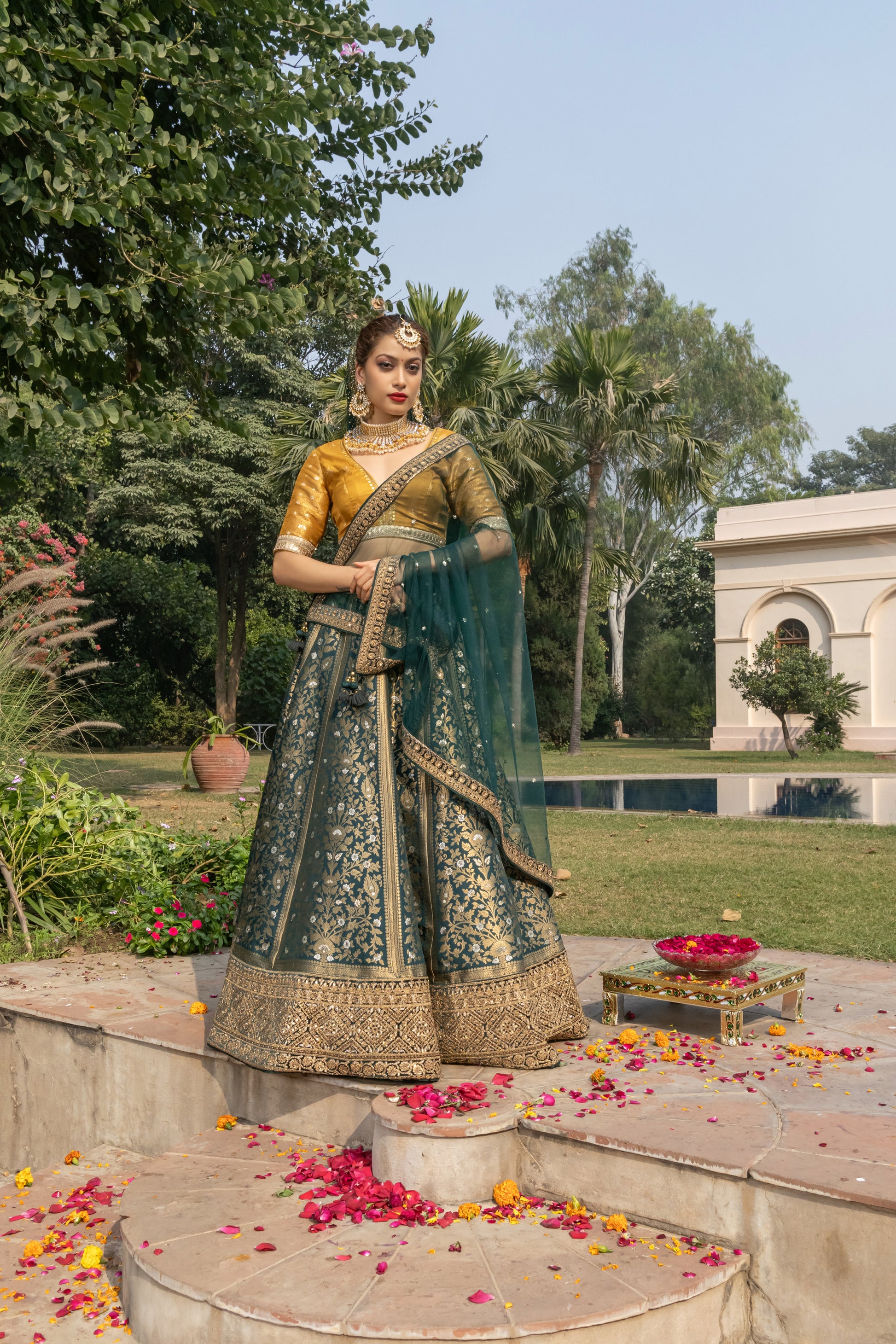 A timeless ode to tradition, this pine green banarasi brocade lehenga is woven from luxurious silk, featuring intricate motifs that capture the richness of age-old craft. Paired with a contrasting mustard yellow blouse, it brings together bold colour play and regal structure.