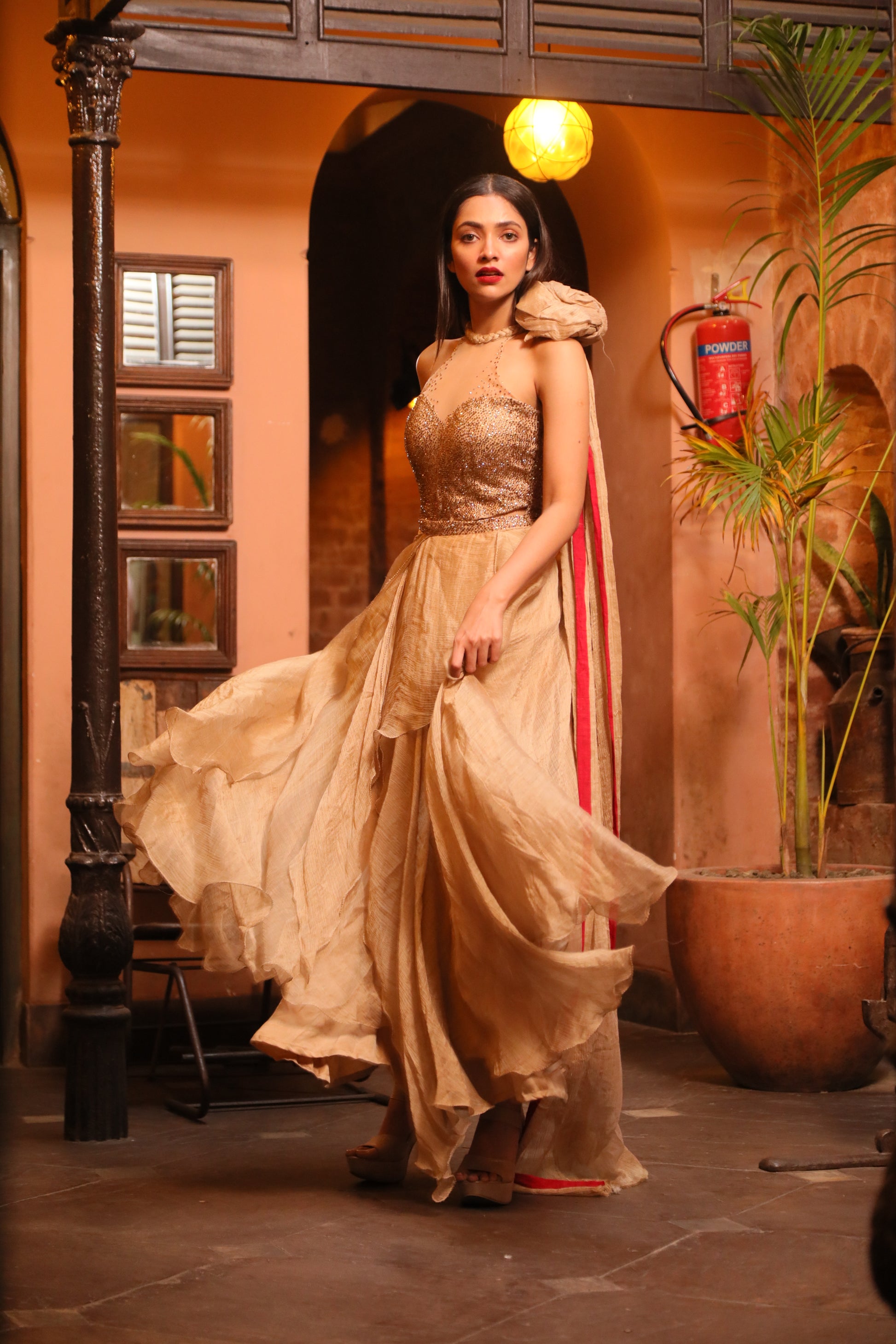Flaunt your beauty in our rare Golden Silk Evening Dress. This golden pure Muga Silk Blend has a subtle shine and an intricate work of pure Swarovski crystals along with a stunning draped rose on the side of the neck.
