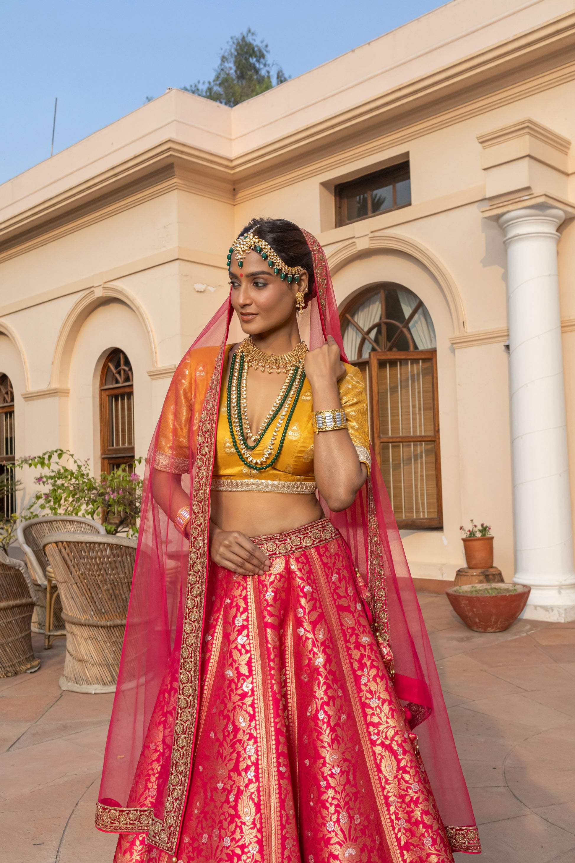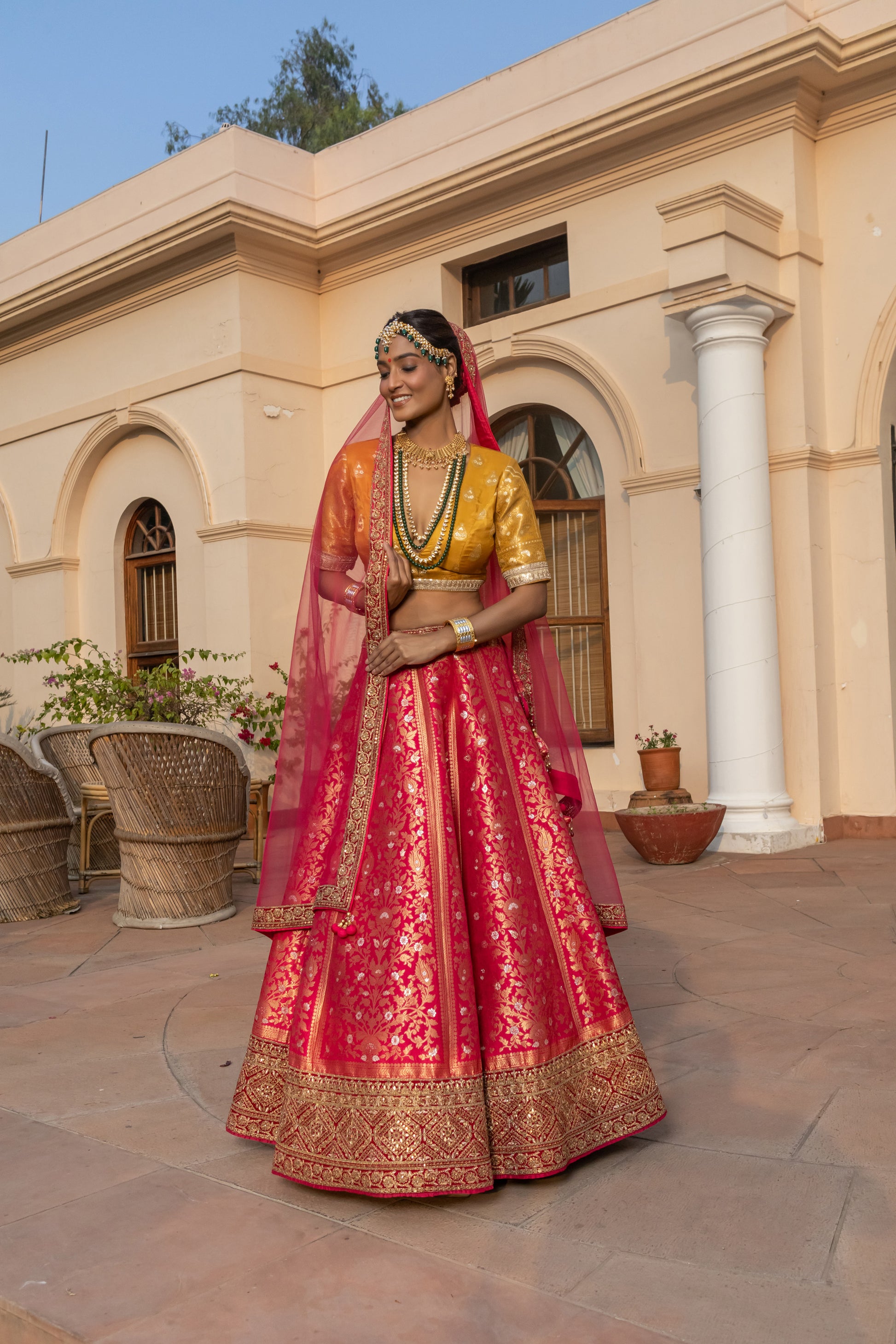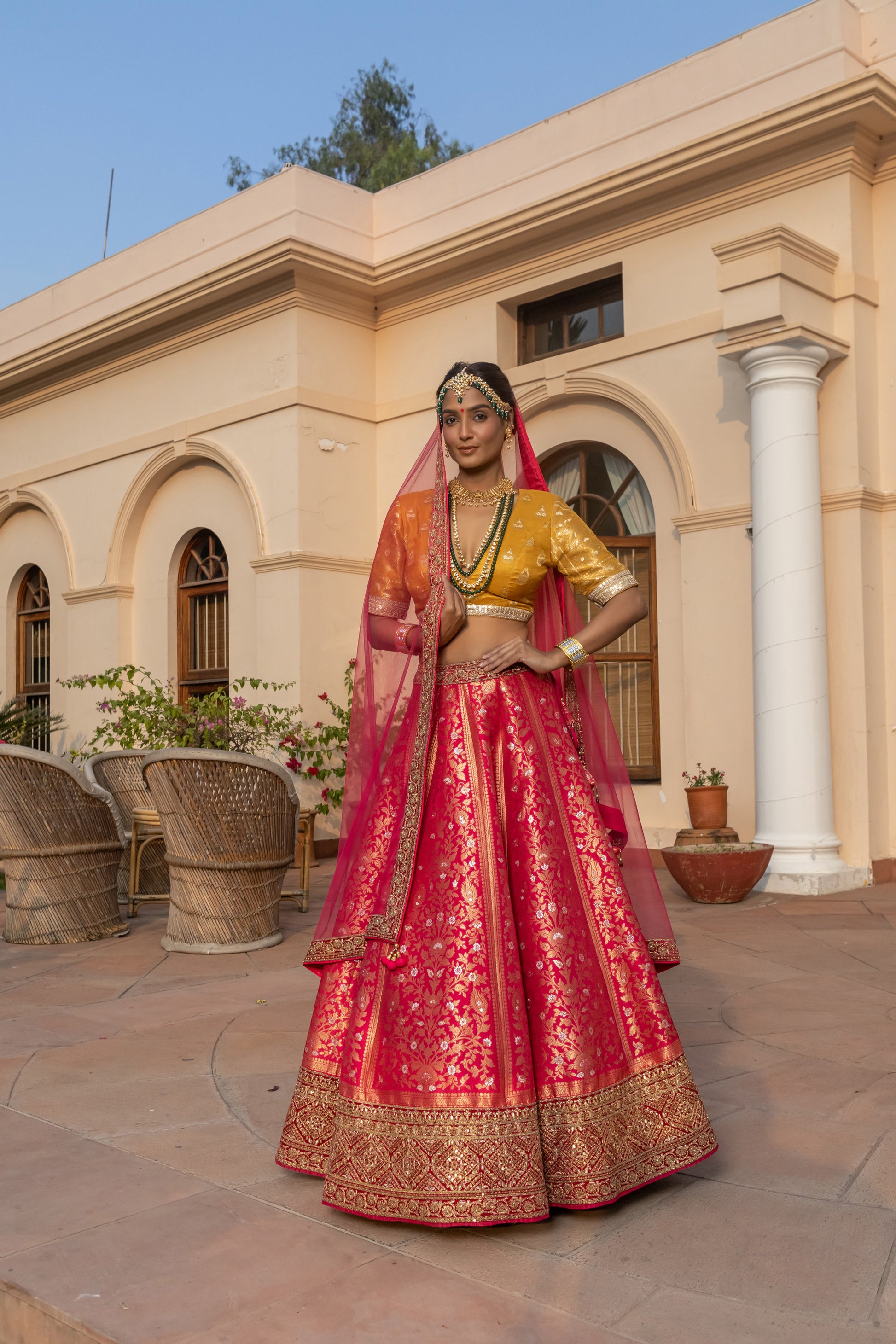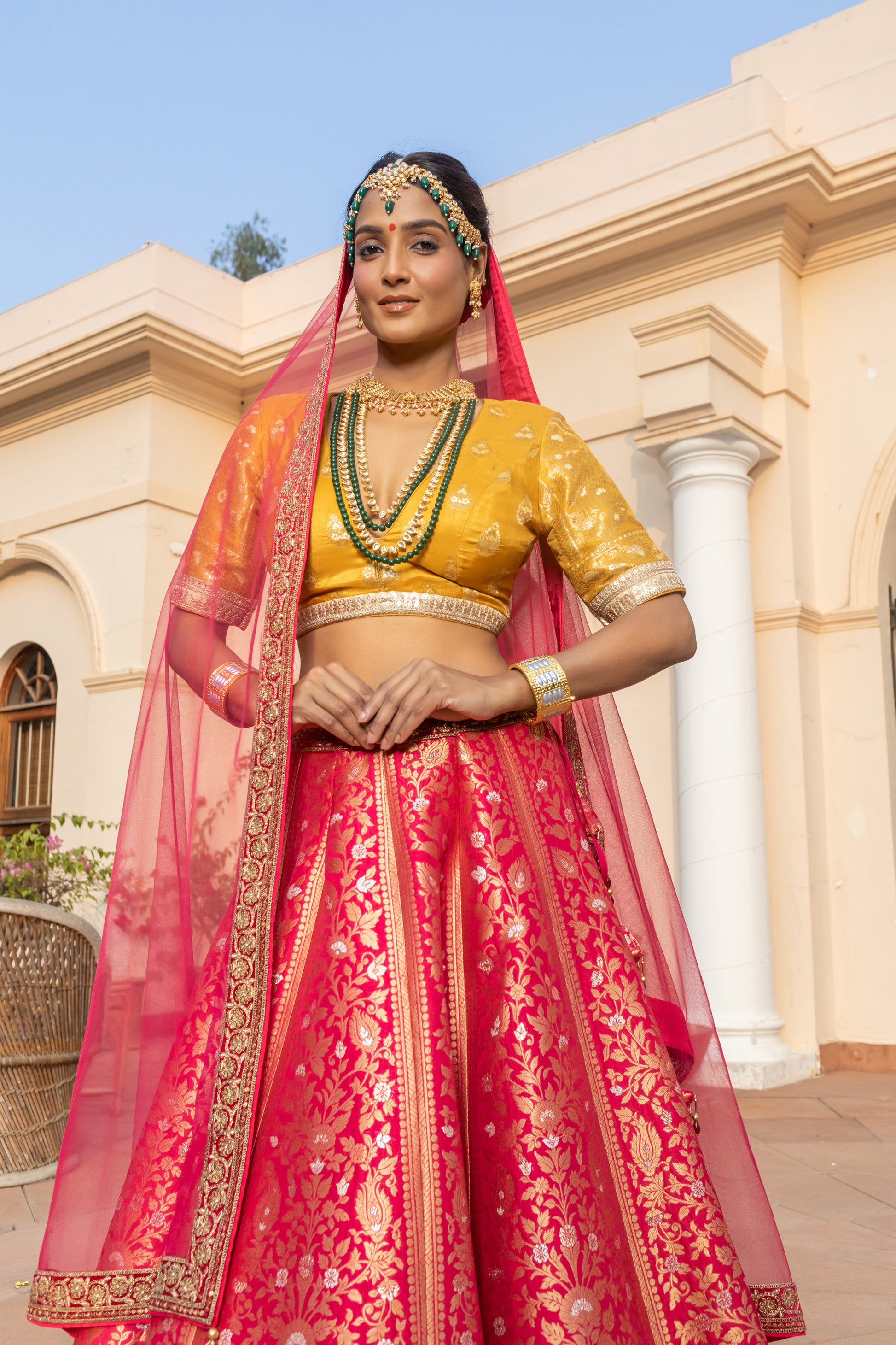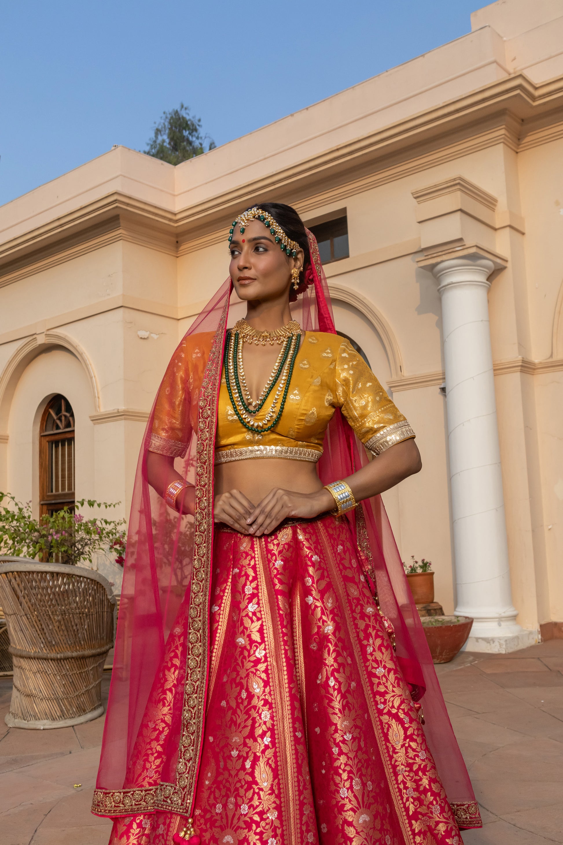 Vivid, festive, and rich in tradition — this red banarasi lehenga is crafted in pure silk, showcasing intricate brocade weaving that glimmers with every move. Paired with a contrasting mustard yellow blouse, it creates a bold, joyous palette rooted in cultural elegance.