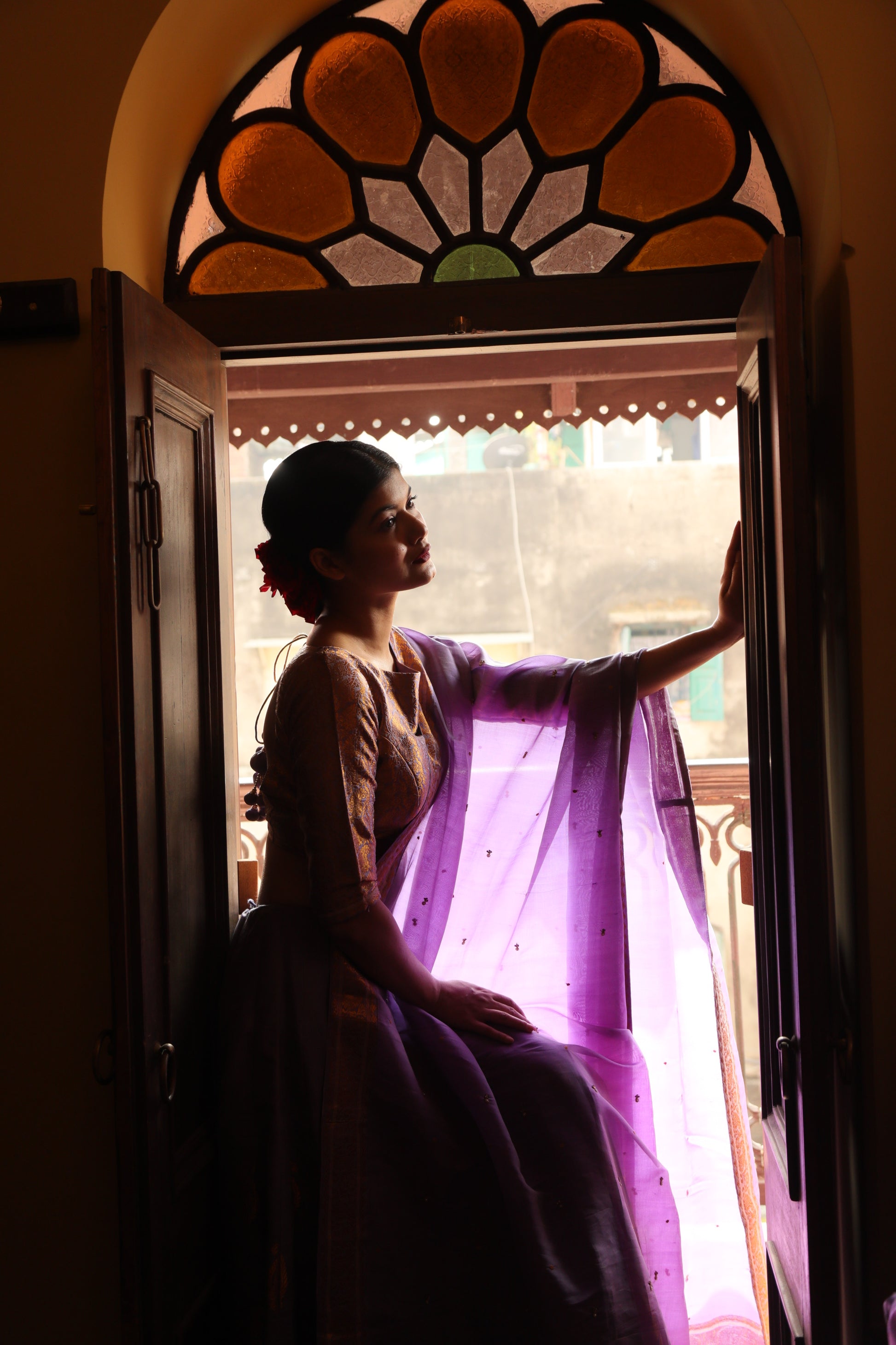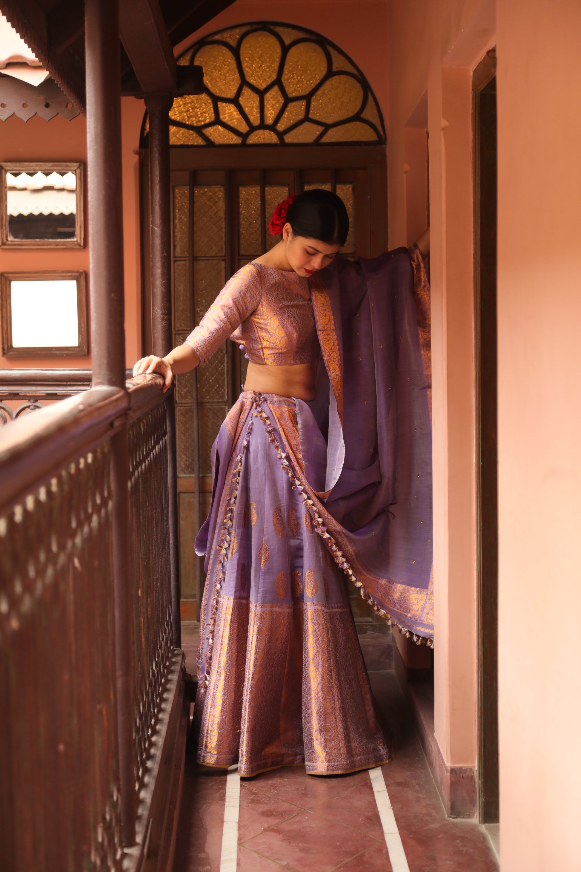 Look radiant in our Lavender Assam Paat (Silk) Lehenga woven with century-old motif and a heavy brocade choli/blouse coupled with an exuberant hand-embroidered lavender sheer paat dupatta.