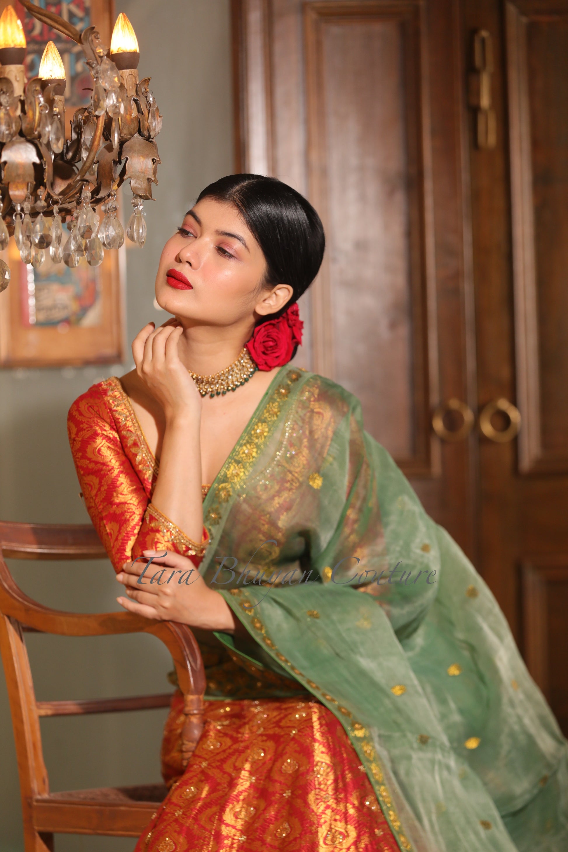 This Bridal Lehenga is handwoven in Assam silk with intricate brocade work of ancient old traditional motif. The lehenga and the brocade choli/blouse are highlighted with Kardana embossed handwork. The full Bridal dupatta is in emerald green Assam Paat (silk) and highlighted with Swarovski and kardana work.
