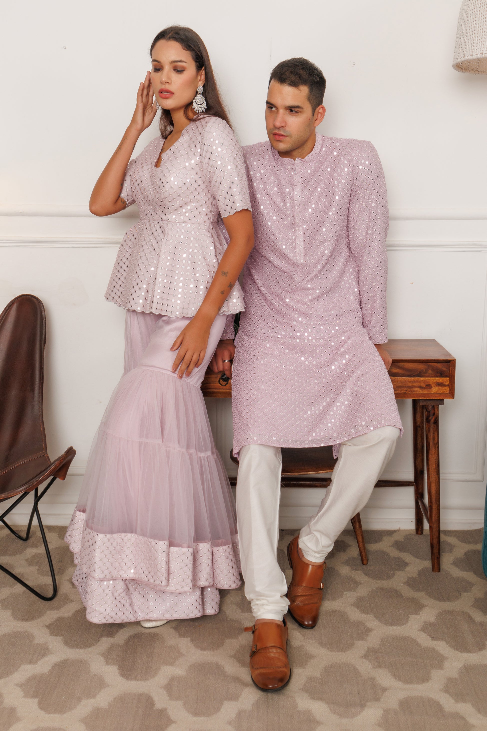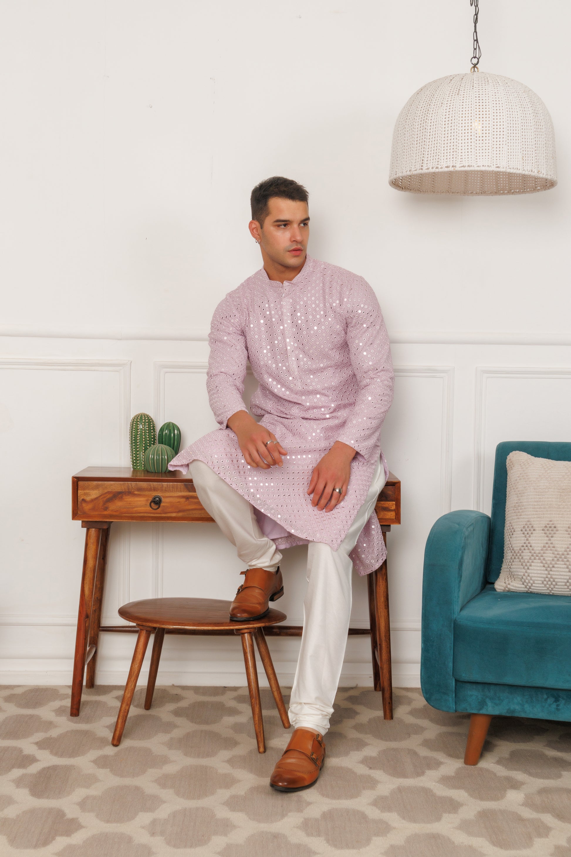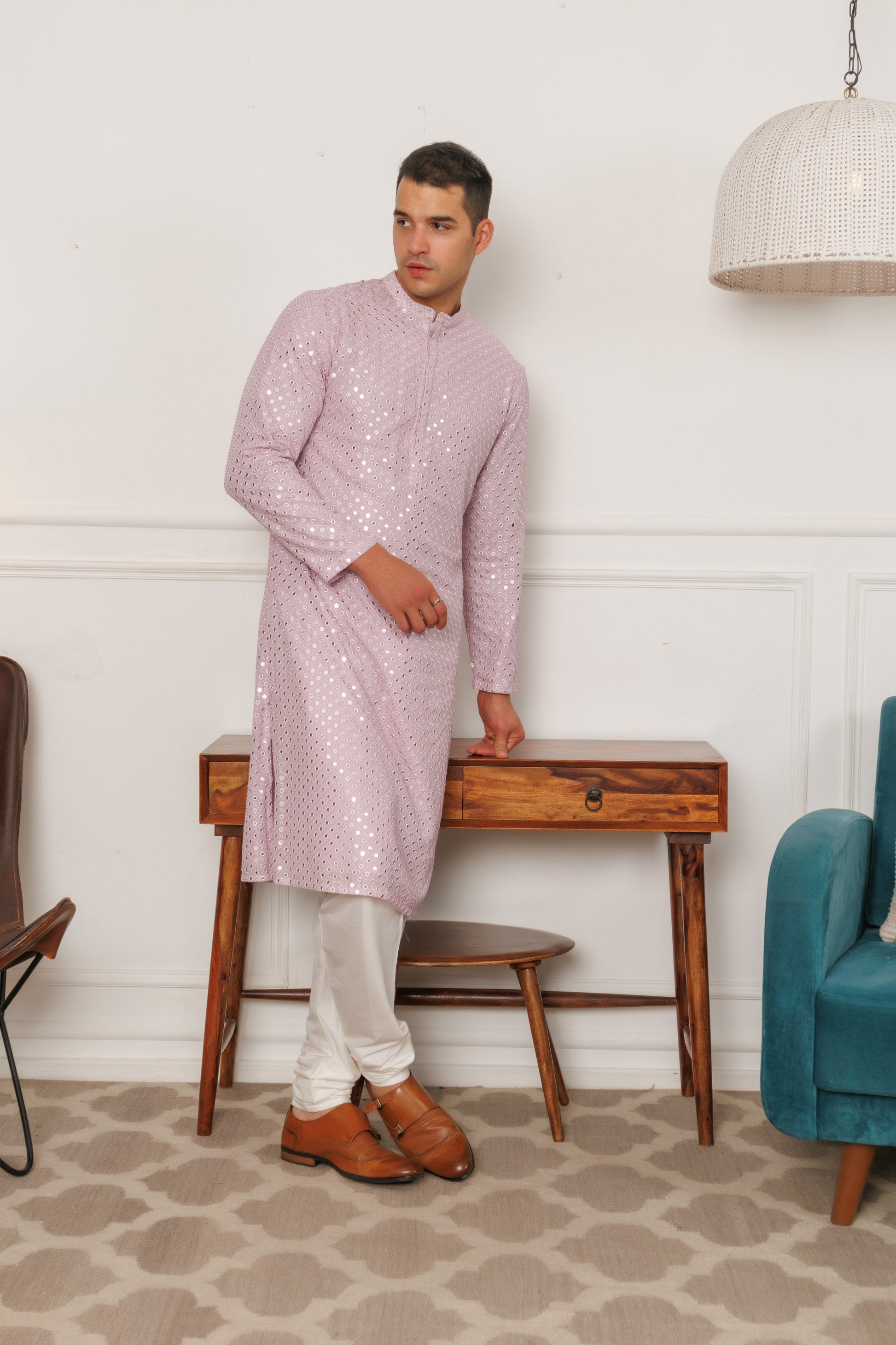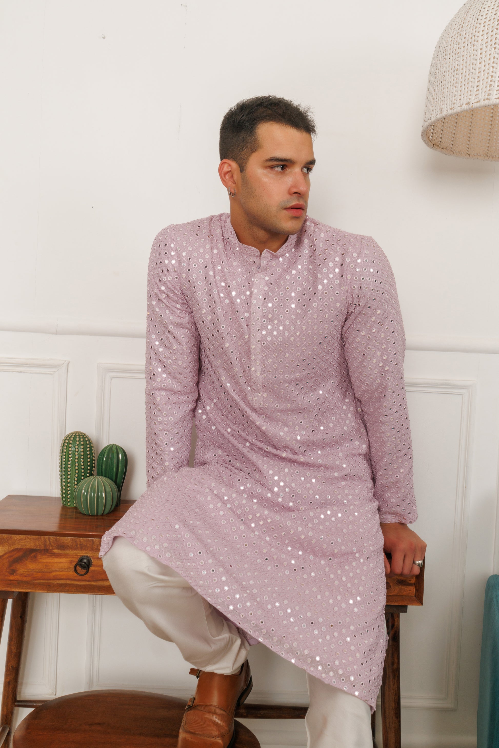 This long kurta comes in the most stunning shade of lavender. Made from a gorgeous mirror work fabric, the kurta is a perfect choice for your festive and wedding events and can be paired with a versatile array of bottoms. We recommend pairing with a silk churidar as seen in the pictures.