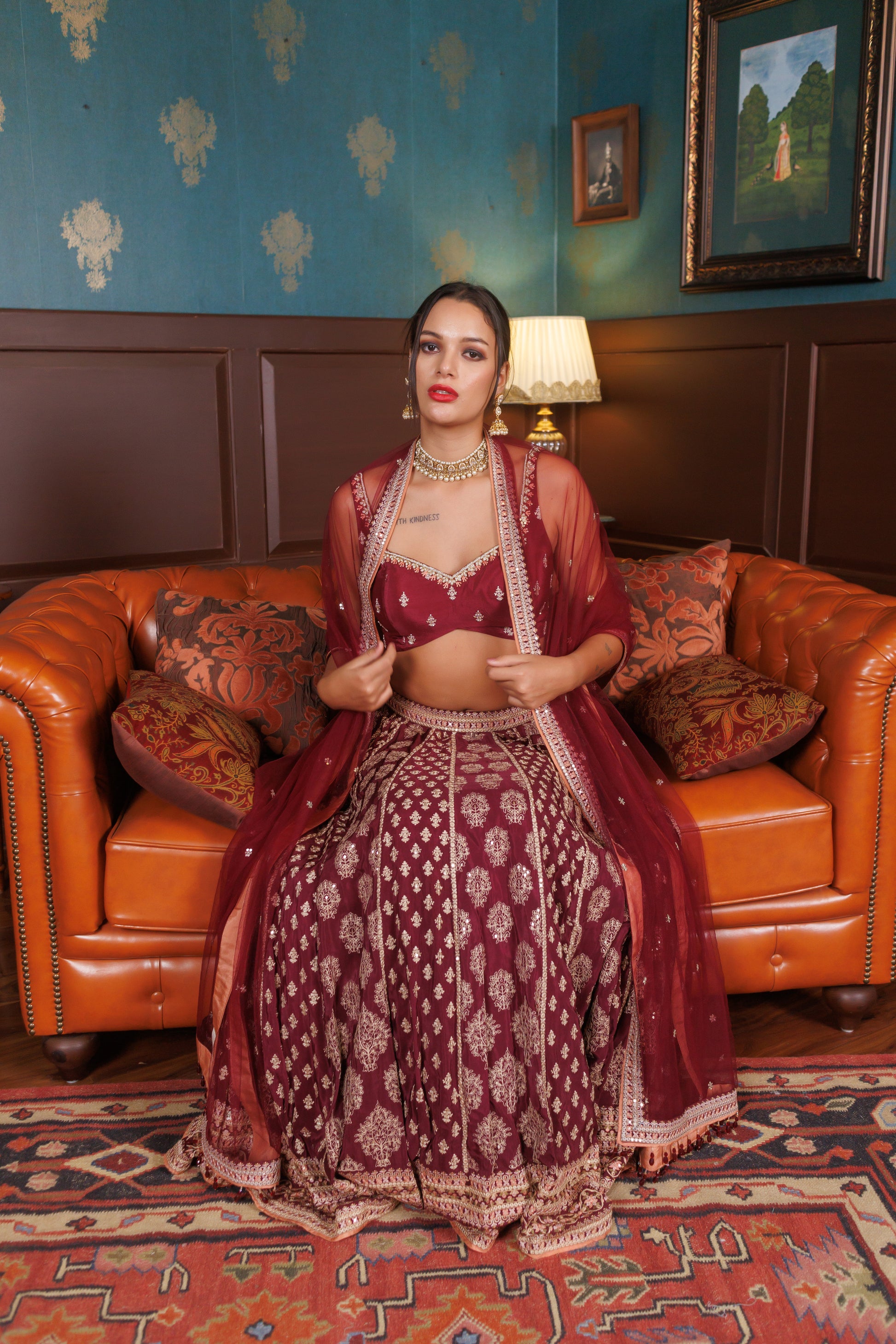 Our take on the traditional bridal ensemble, this lehenga choli set in a deep burgundy colour is made for the modern bride. Made from silk and finished with intricate zardozi work in gold and silver zari, beads and sequins. Paired with a net dupatta with an embellished border.