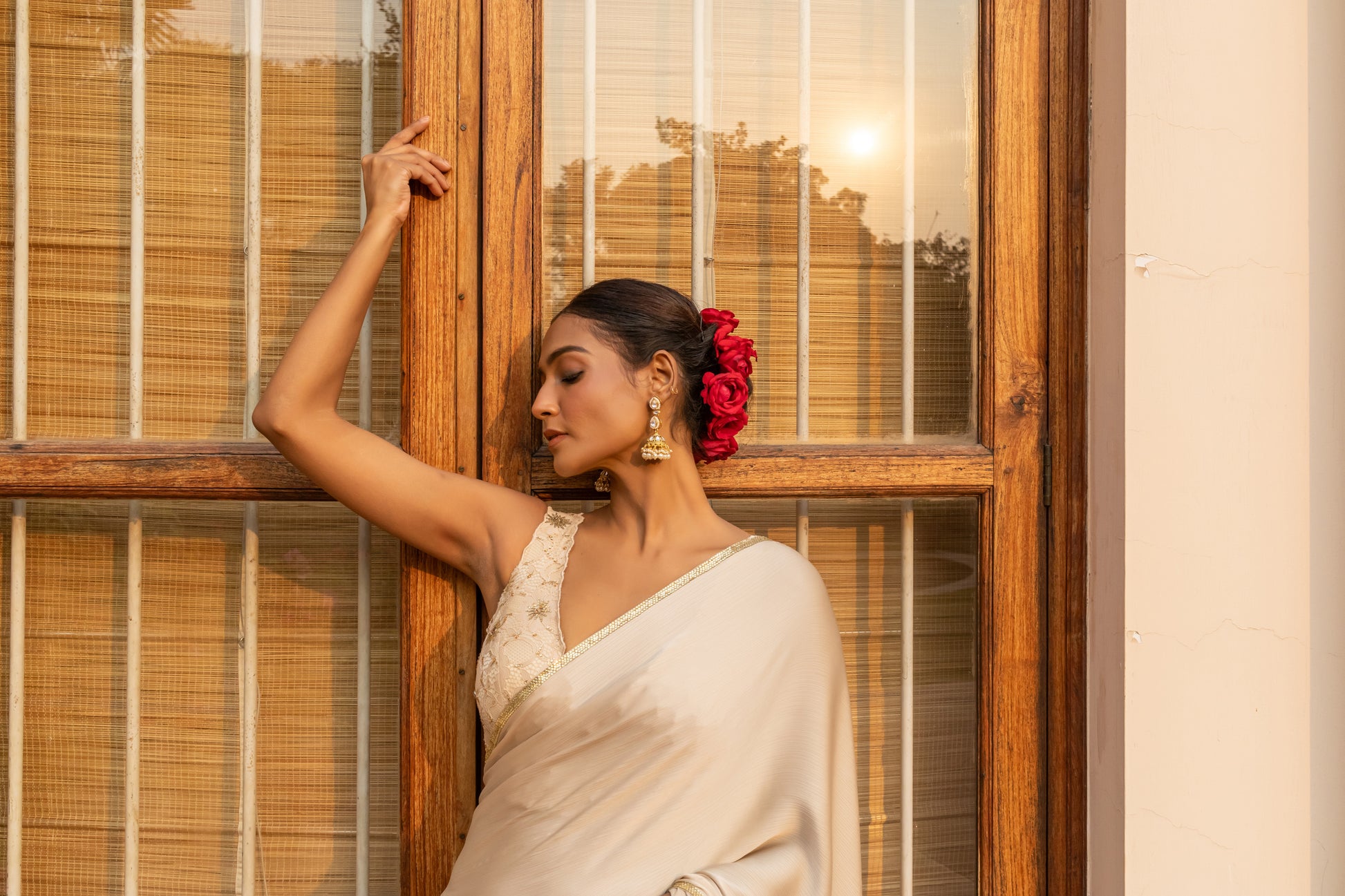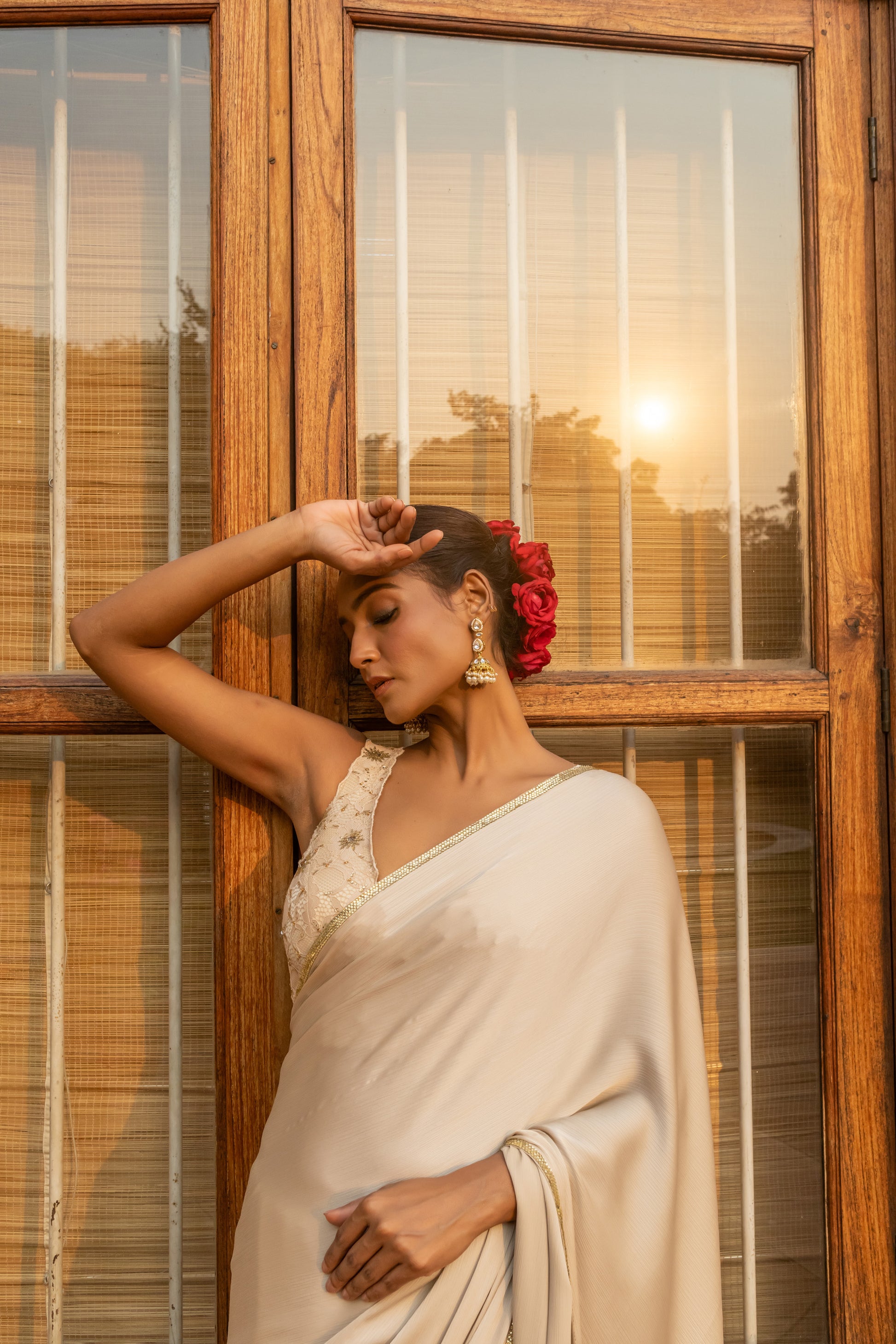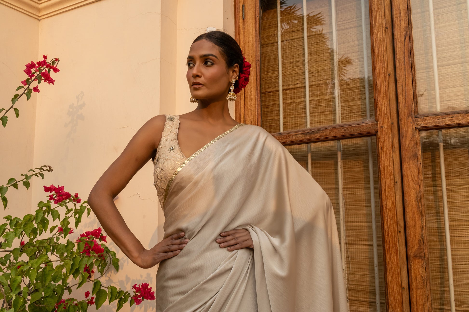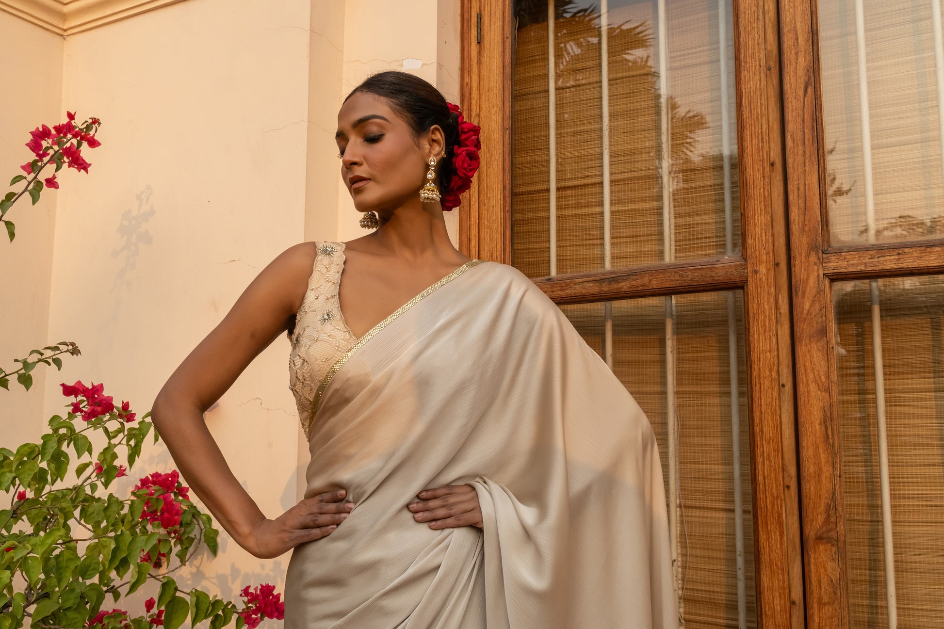A soft symphony of sheen and shimmer, this nude beige satin silk saree glides effortlessly in a pre-stitched silhouette, perfect for the contemporary woman seeking ease without compromising on elegance. The look is elevated with a Swarovski-studded golden border. Paired with a chantily champagne gold toned blouse, highlighted with delicate hand embroidery, the ensemble is ideal for bridesmaids, cocktail evenings, or minimalist wedding looks. Graceful, luminous, and fuss-free — this is effortless sophistication in motion.