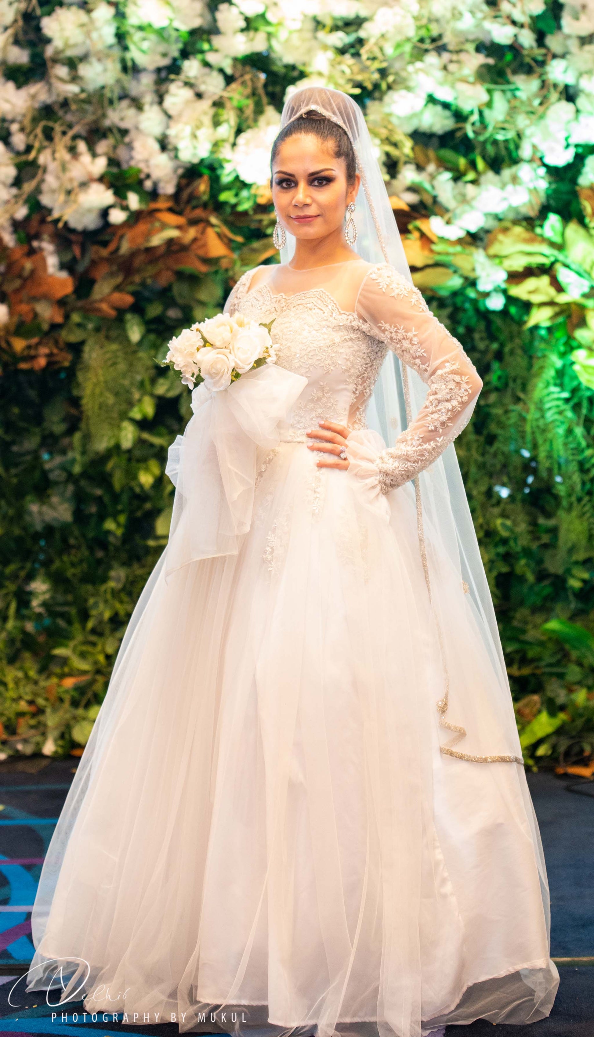 Elegant White Bridal Gown intricately hand-embroidered with tone on tone pure sequin and kardana work on Assam Sheer Paat (Silk) with small pure silver zari buta. This gown is complemented by a long butterfly-net Veil with silver and tone and tone sequin and kardana handwork.