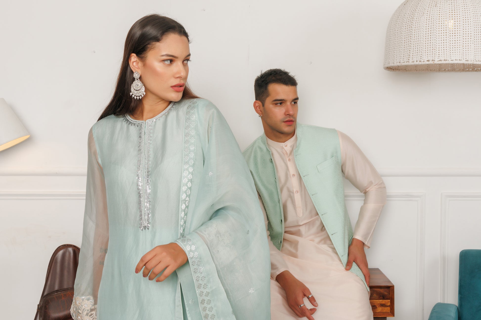 An ethereal ice blue organza suit set, featuring intricate floral embroidery on the sleeves, shimmering sequin work on the yoke and hand finished with thread work and beaded tassels. Paired with matching pants, and a graceful pure Assam Silk dupatta.