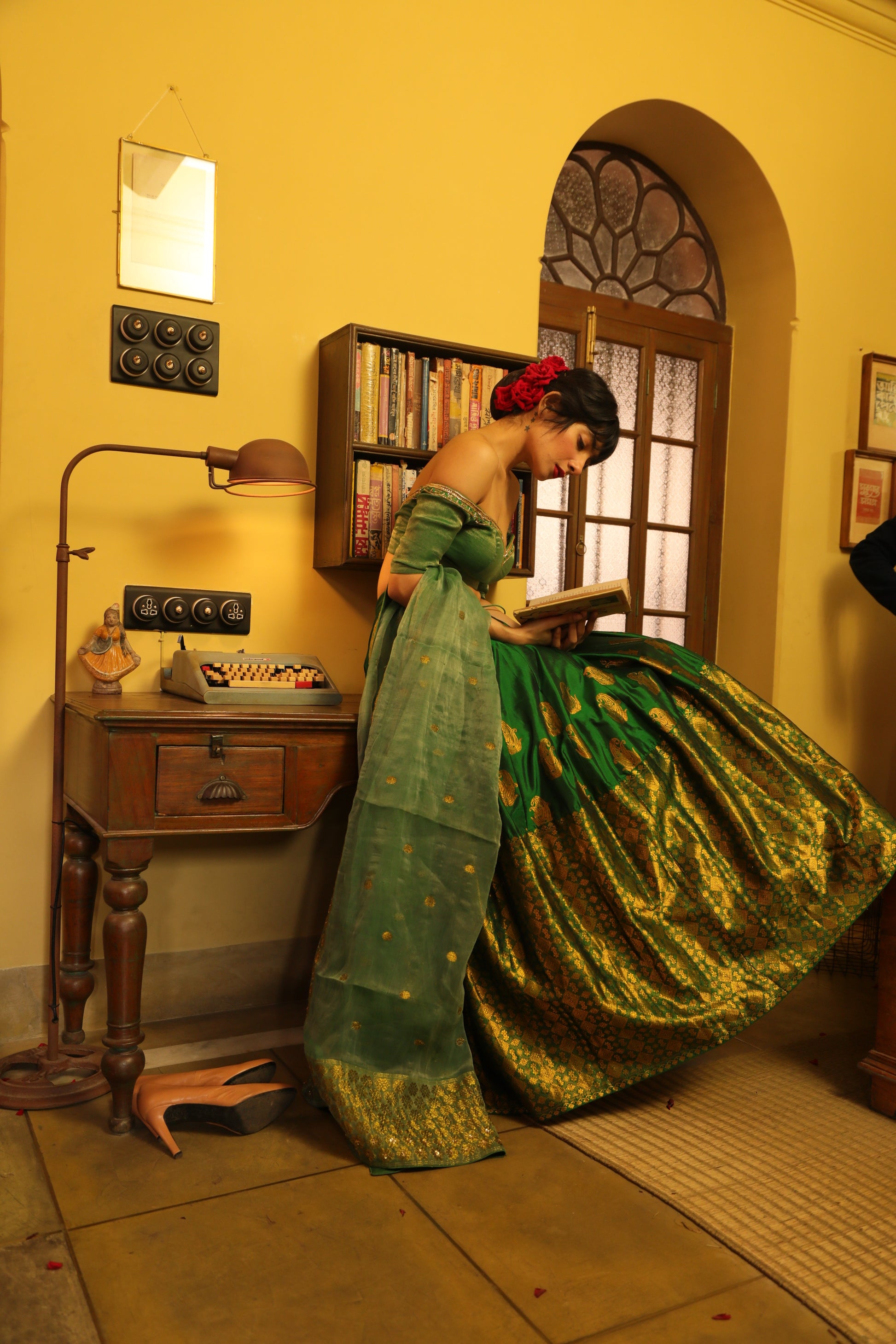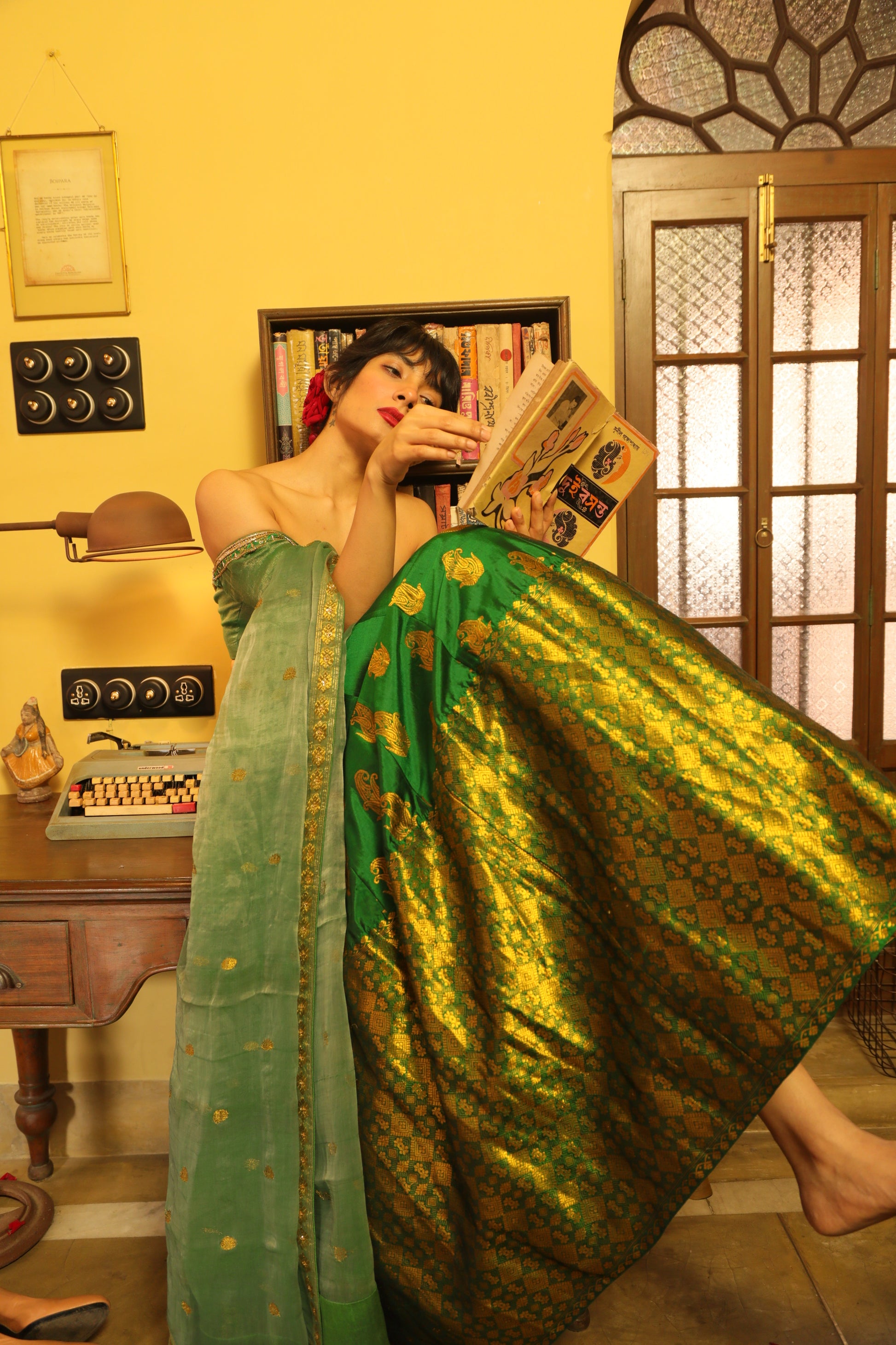 Emerald Green Assam Paat (Silk) Bridal Lehenga has a heavy pure zari brocade border with a traditional paisley/kalka zari motif all over. The lehenga and the brocade choli/blouse have intricate zardozi work. This elegant bridal wear is complemented by a sheer Assam paat blend emerald green dupatta embossed with Kardana and pure Swarovski.