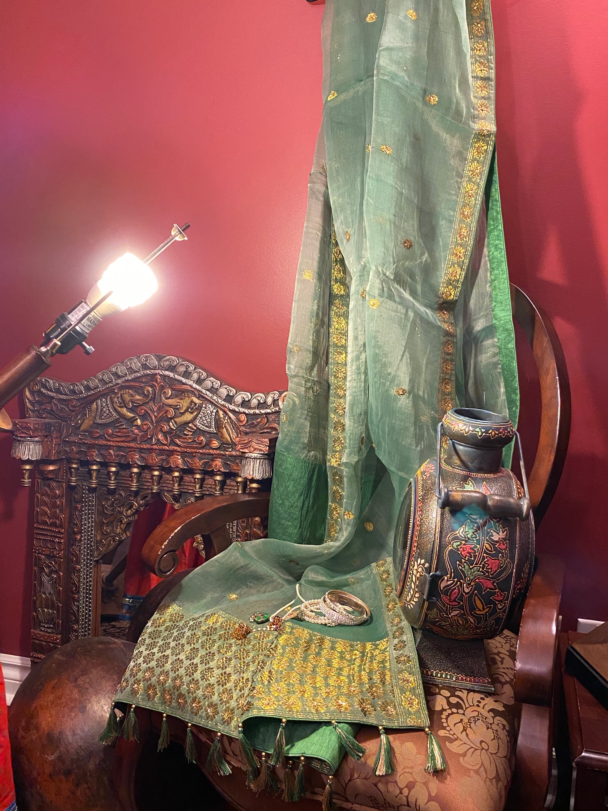 Our Emerald Green Nunni Paat (Silk) dupatta hand woven with zari buta all over and brocade pallu/aanchal, highlighted with swarovski crystals and katdana work on aanchal and border is an elegance that never fades.