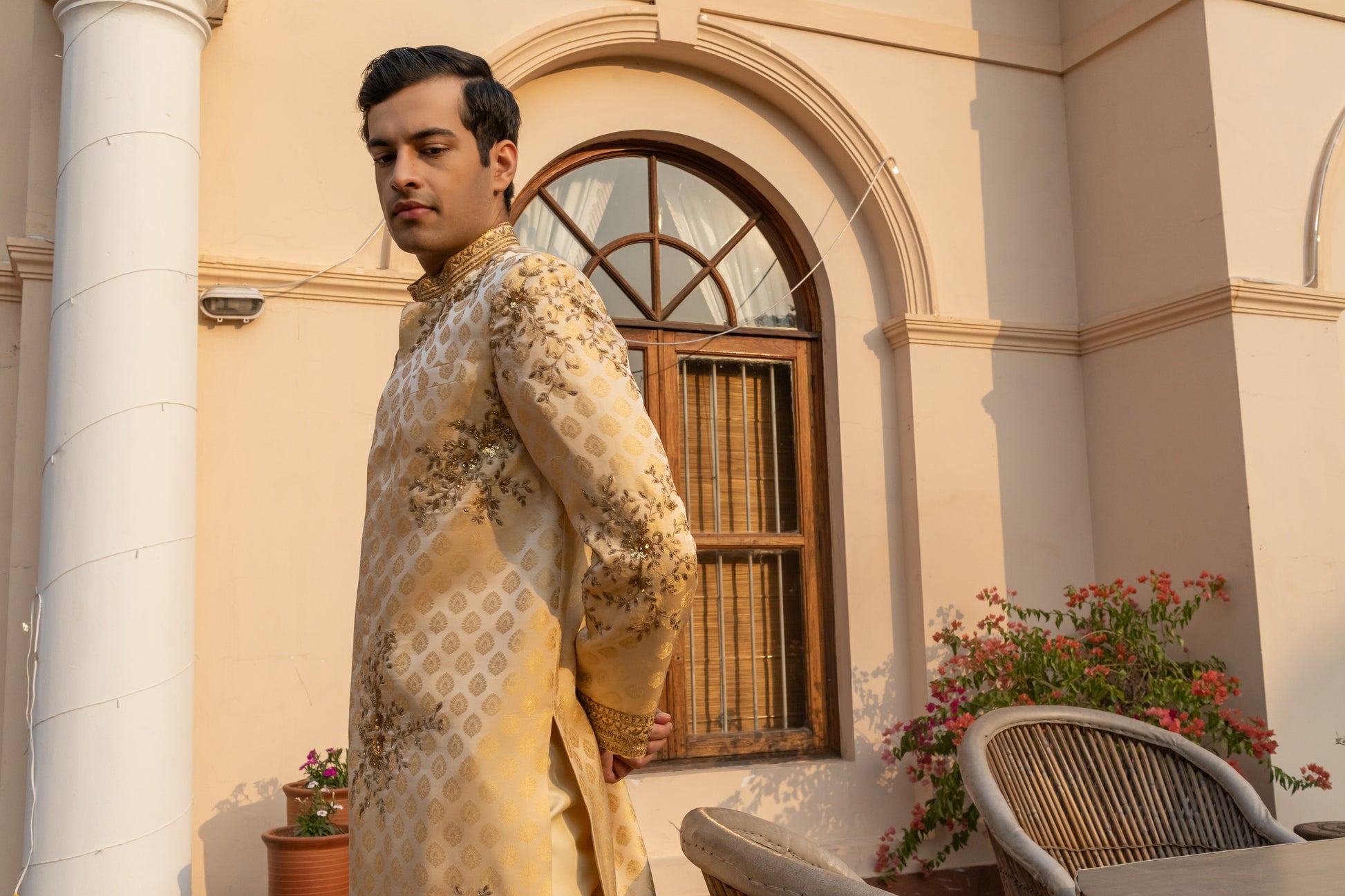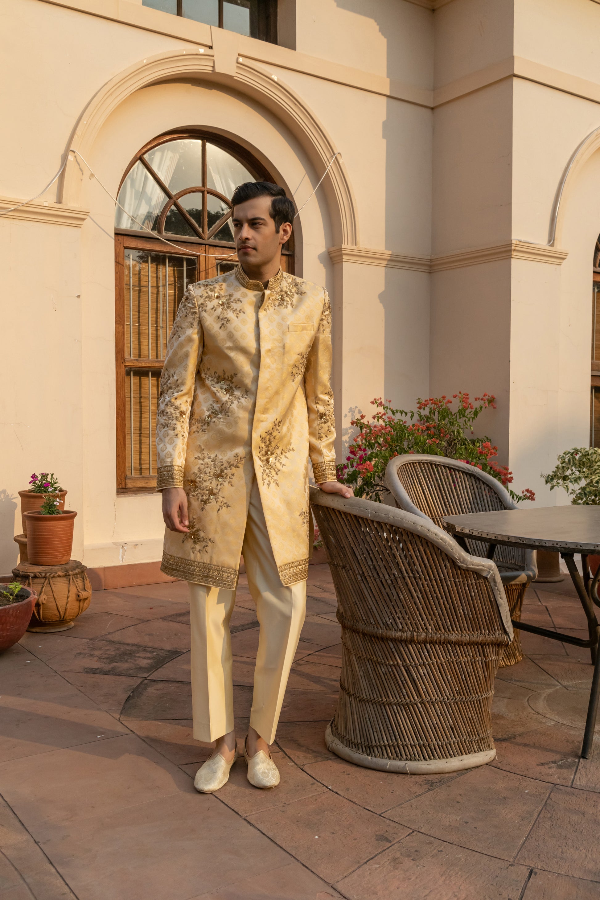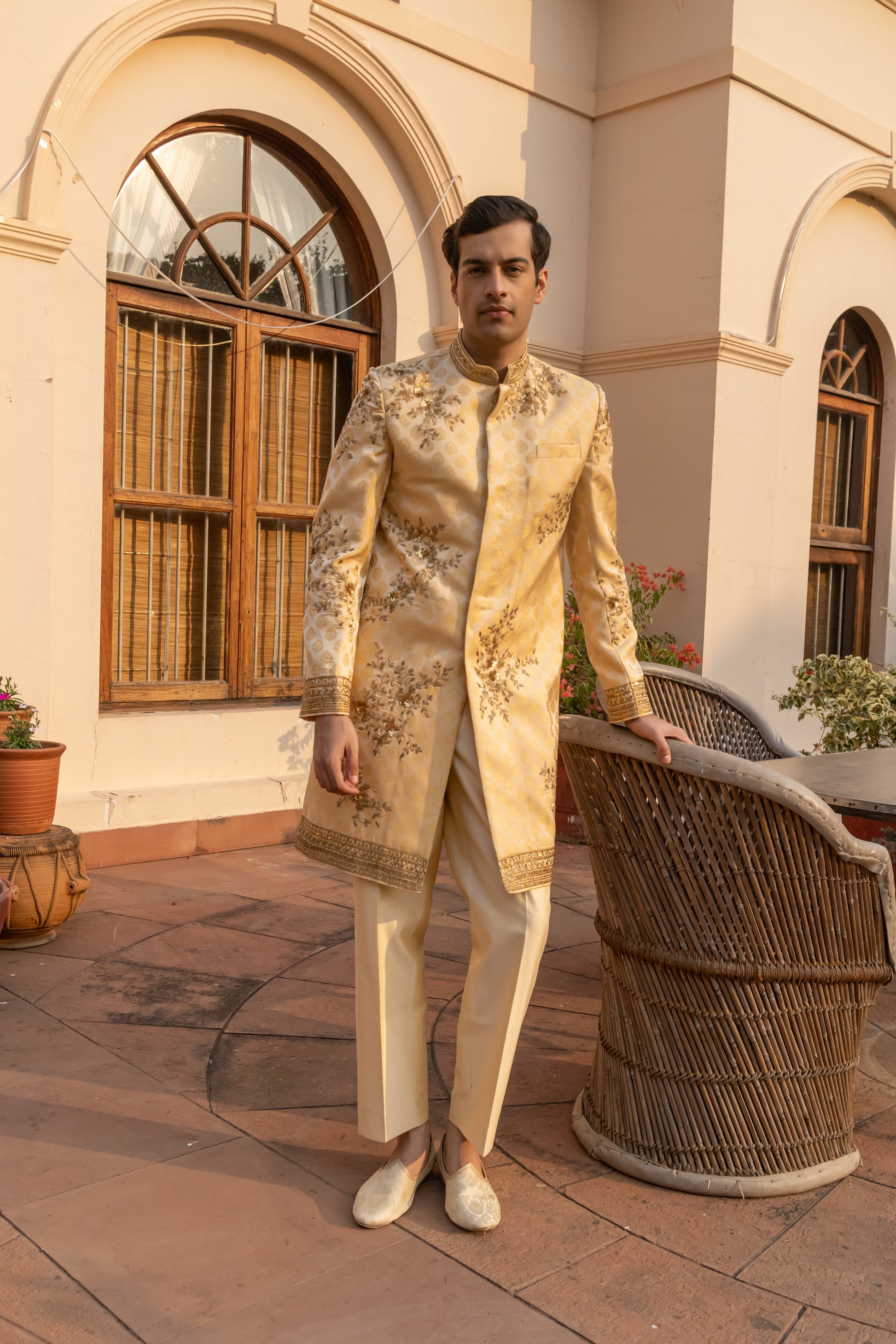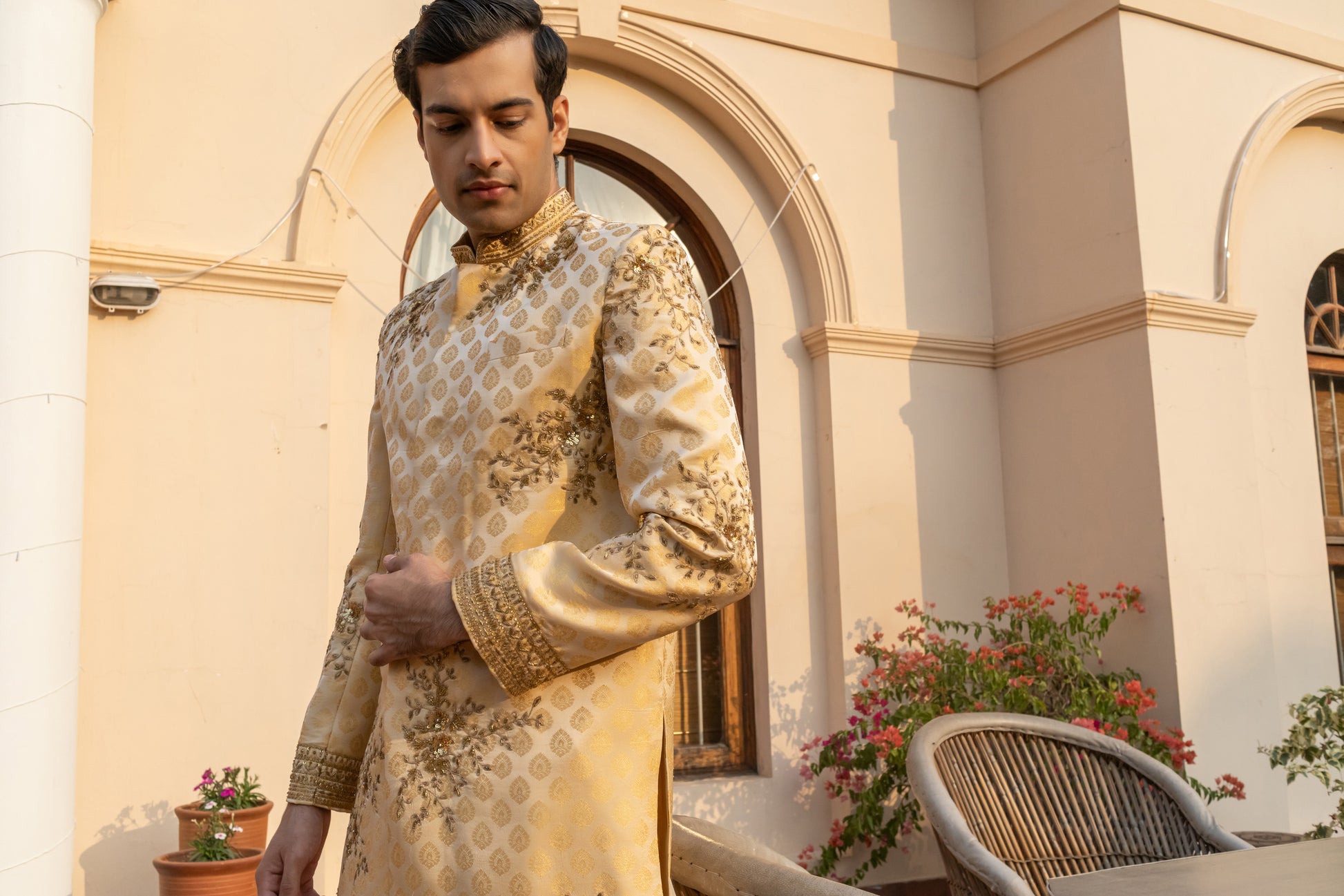 Understated yet undeniably regal, this beige achkan is tailored in self-textured silk, offering depth through subtle patterning and a pristine finish. The silhouette is structured, classic, and commanding — a modern interpretation of timeless sherwani elegance.
