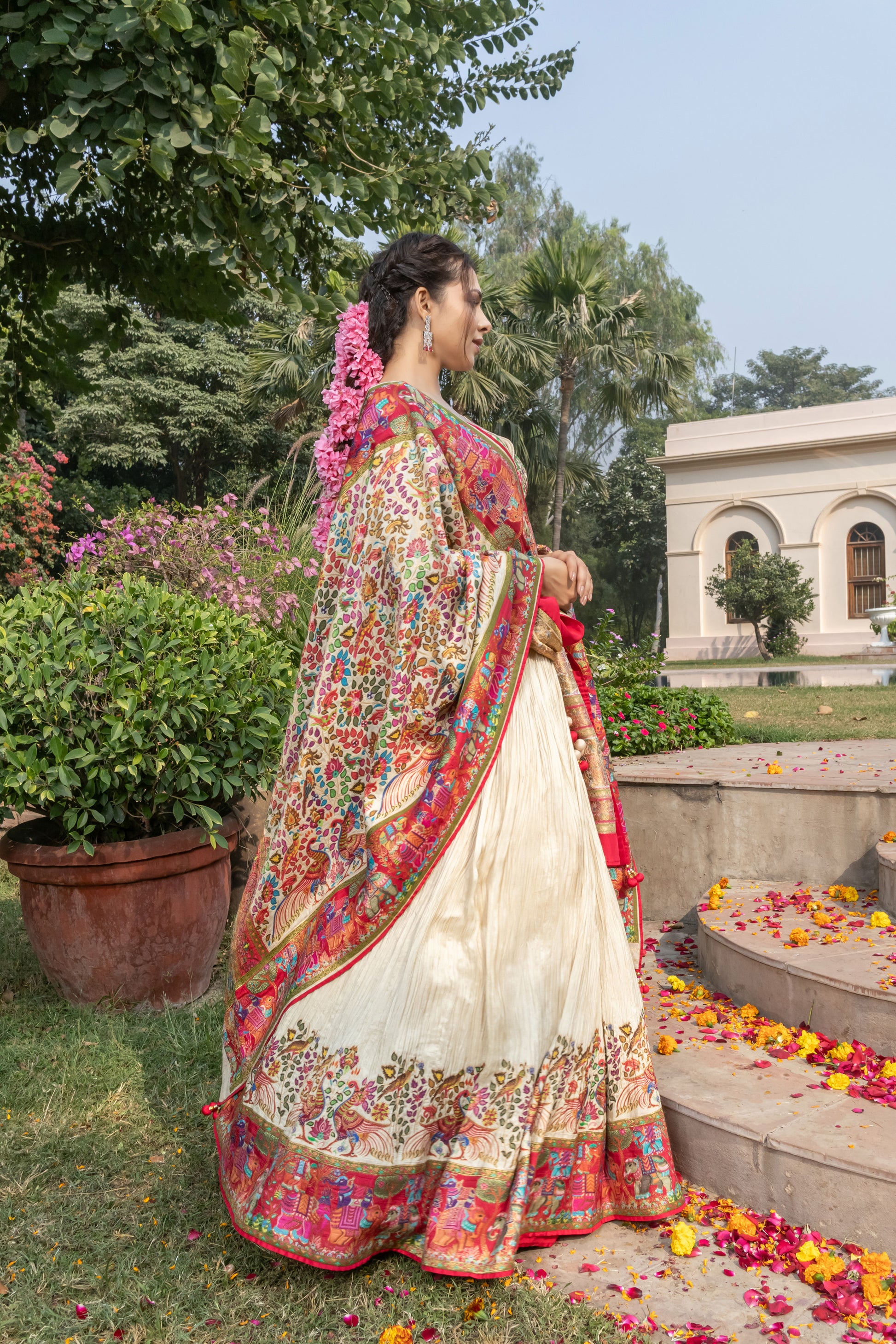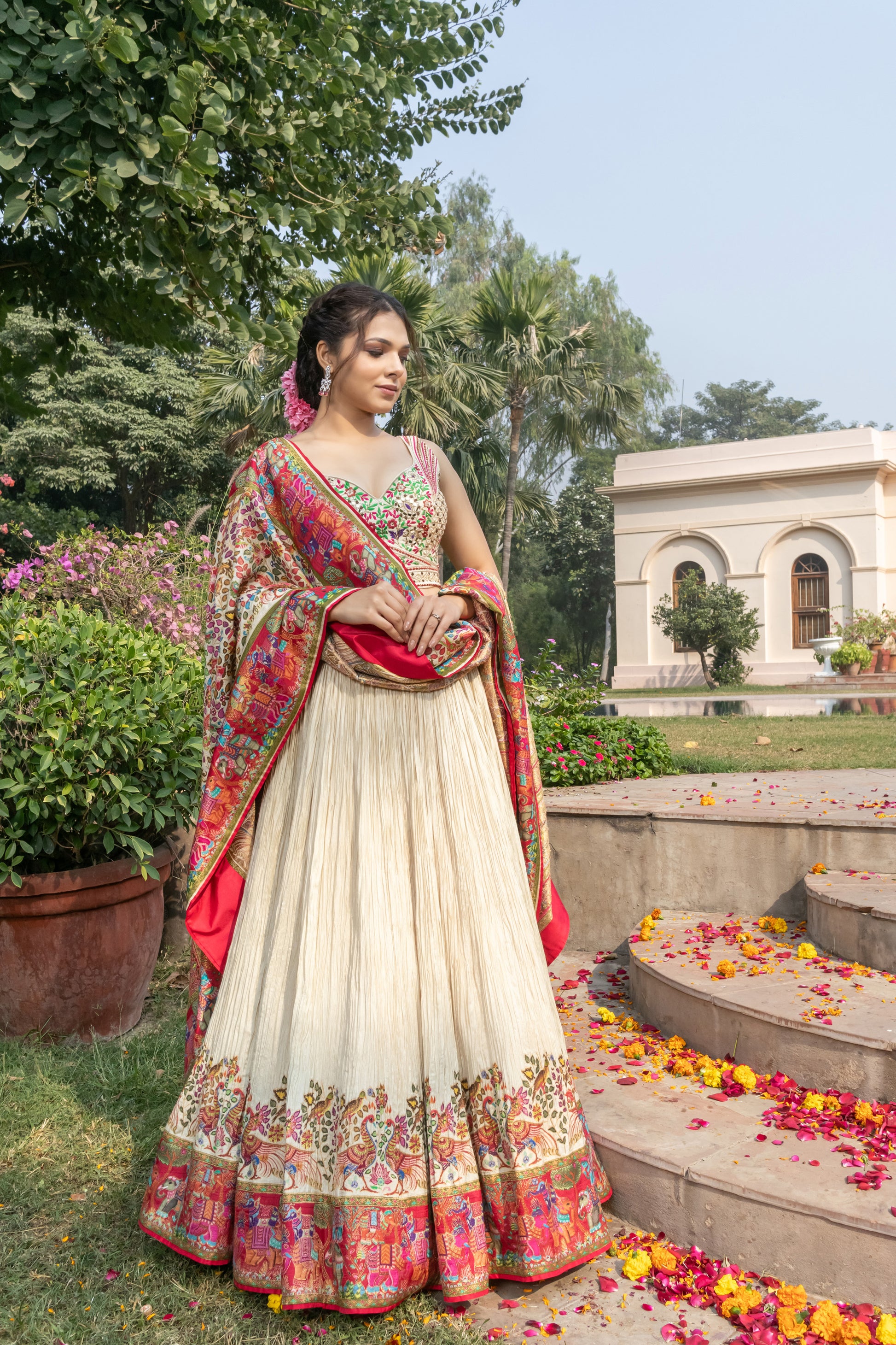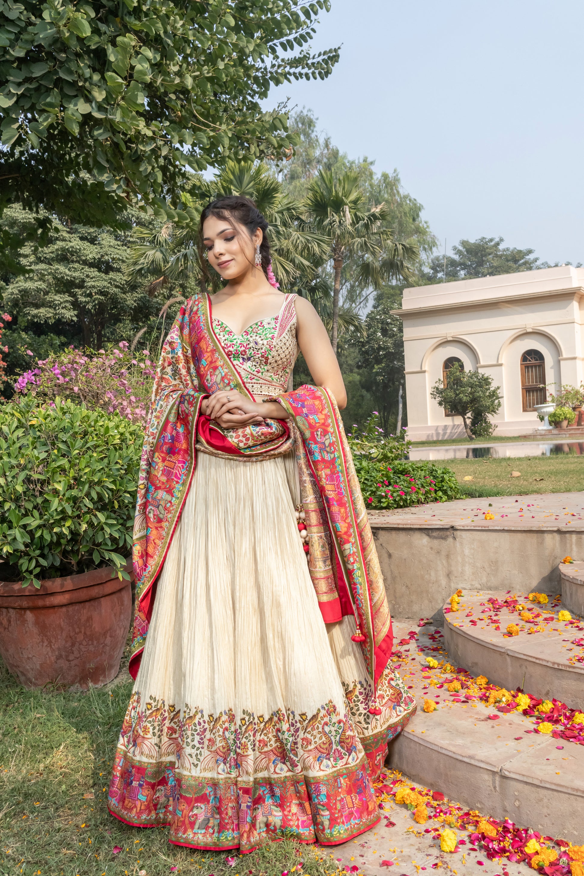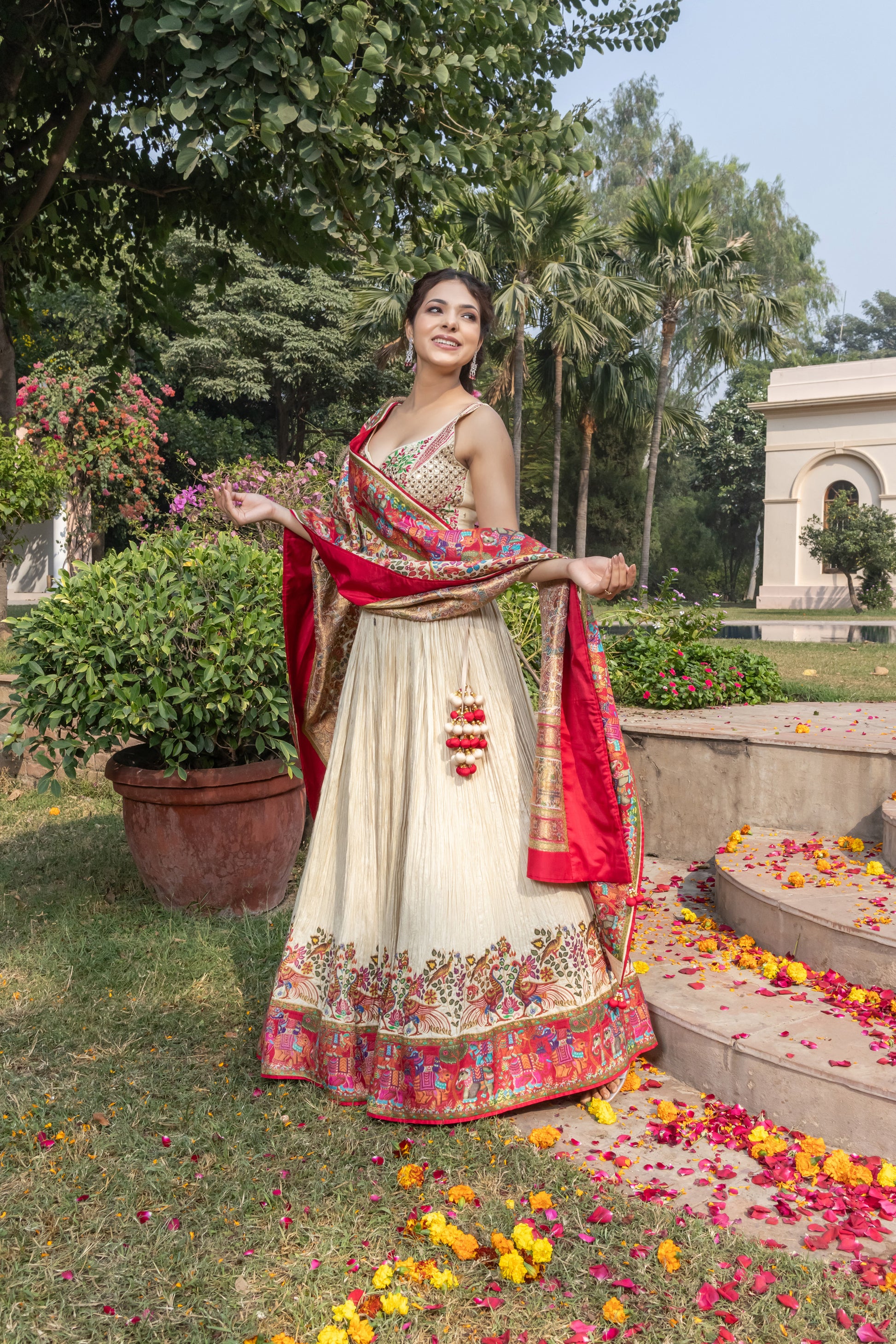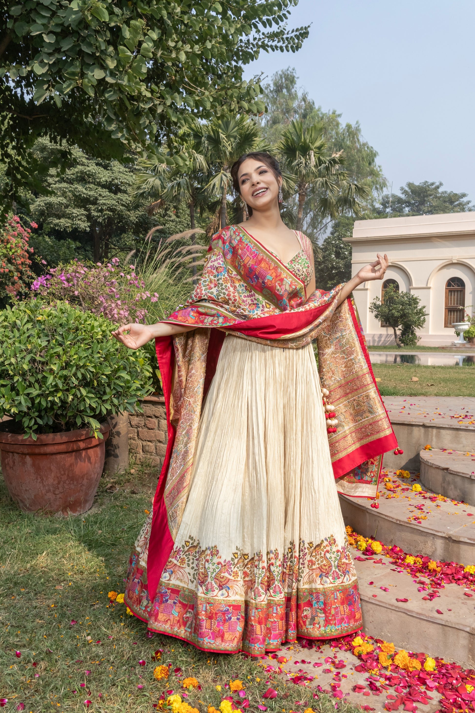 It’s paired with a mirror hand-embroidered silk choli that adds just the right sparkle, and a coordinated dupatta detailed with custom tassels for a touch of regal elegance.