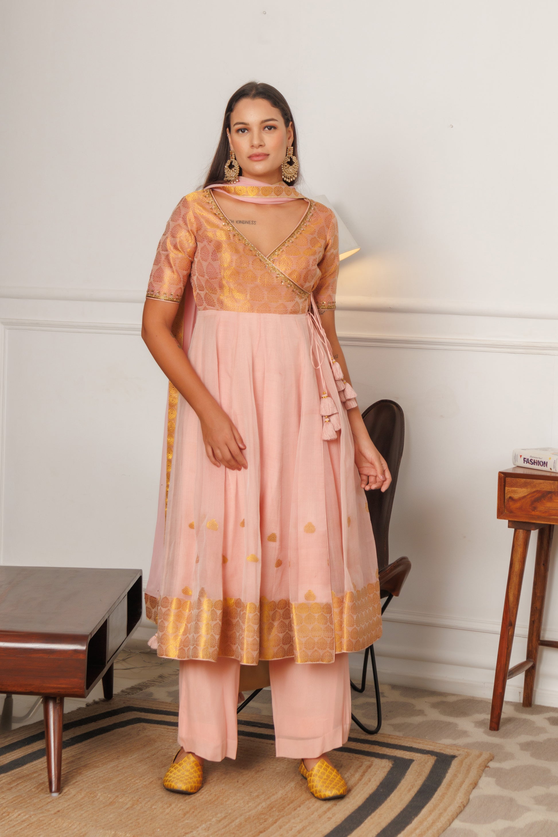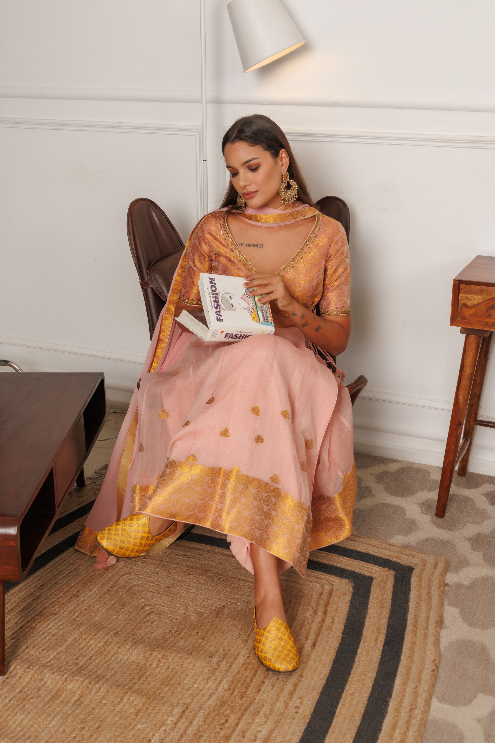 This Assam Silk Anarkali set is sourced straight from weavers in Assam. It is delicately finished with zardozi work around the neck-line and handmade tassels by our karigars. Paired with pure georgette palazzo pants and dupatta with Assam Silk border. A perfect blend of heritage craftsmanship and modern design.