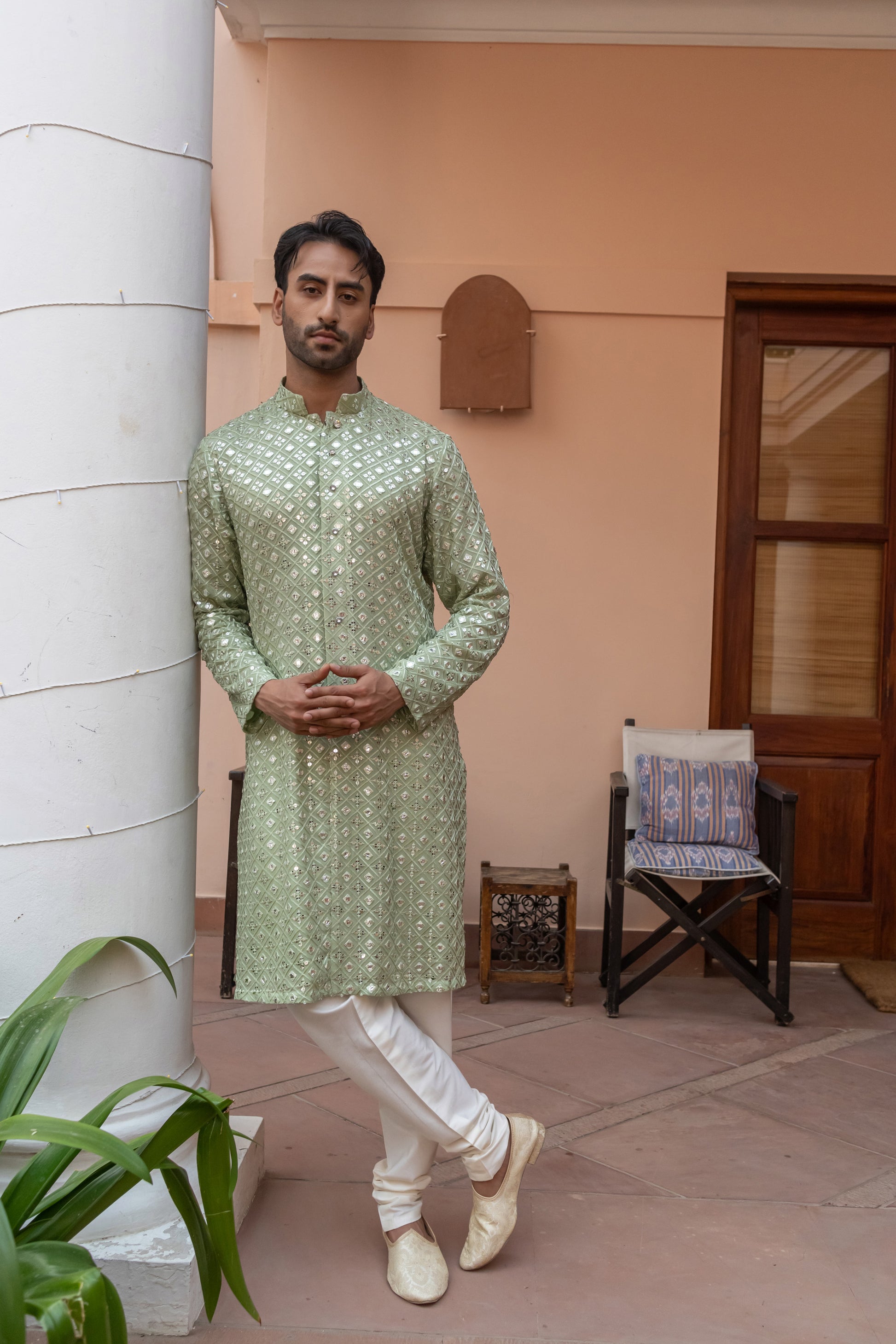 Effortlessly elegant, this sage green kurta is tailored in airy embroidered georgette, blending delicate craftsmanship with contemporary appeal. The tone-on-tone embroidery adds subtle texture, while the silhouette stays light and fluid — ideal for wedding celebrations, daytime functions, or festive gatherings.It is paired with a ivory silk churidar in a relaxed fit.
