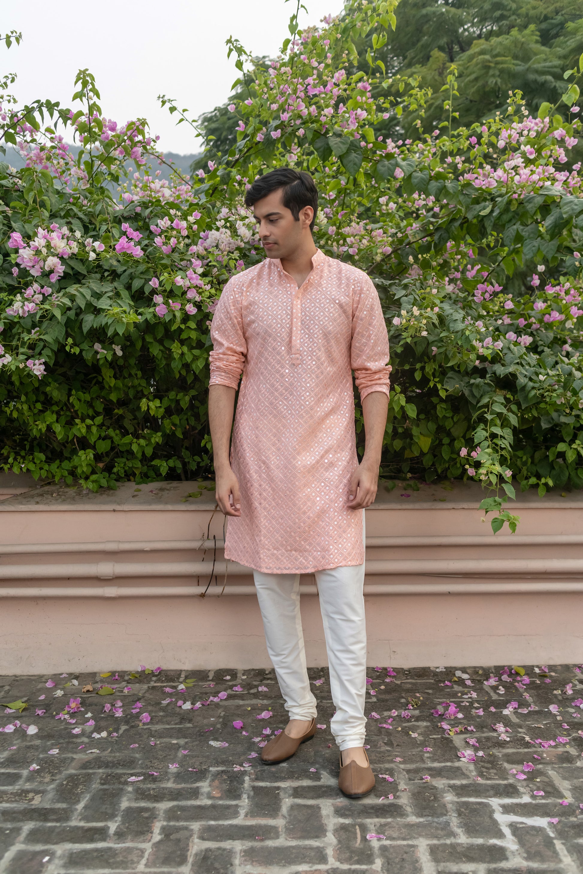 The peach kurta set blends subtle elegance with modern sophistication. Crafted from embroidered georgette, the kurta features delicate detailing that enhances its refined appeal. Paired with an off white silk churidar, this ensemble strikes the perfect balance between traditional charm and contemporary style. Ideal for a wedding celebration, it embodies grace in every weave.