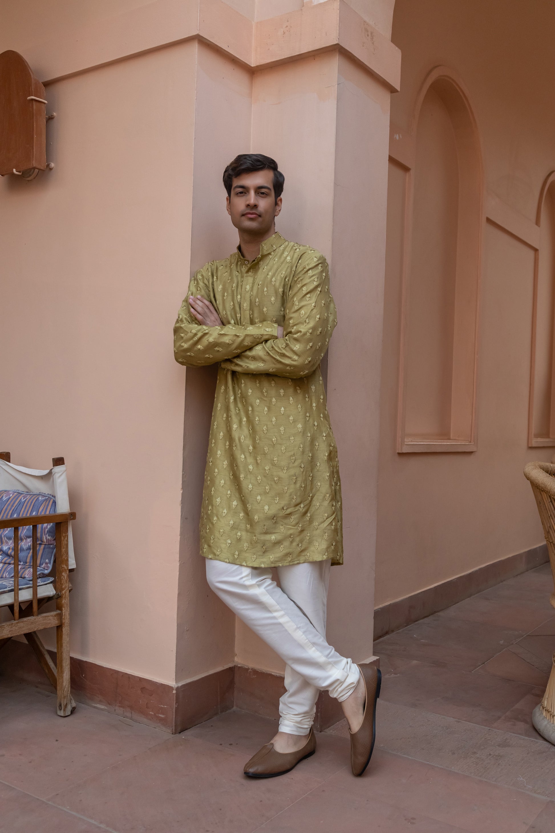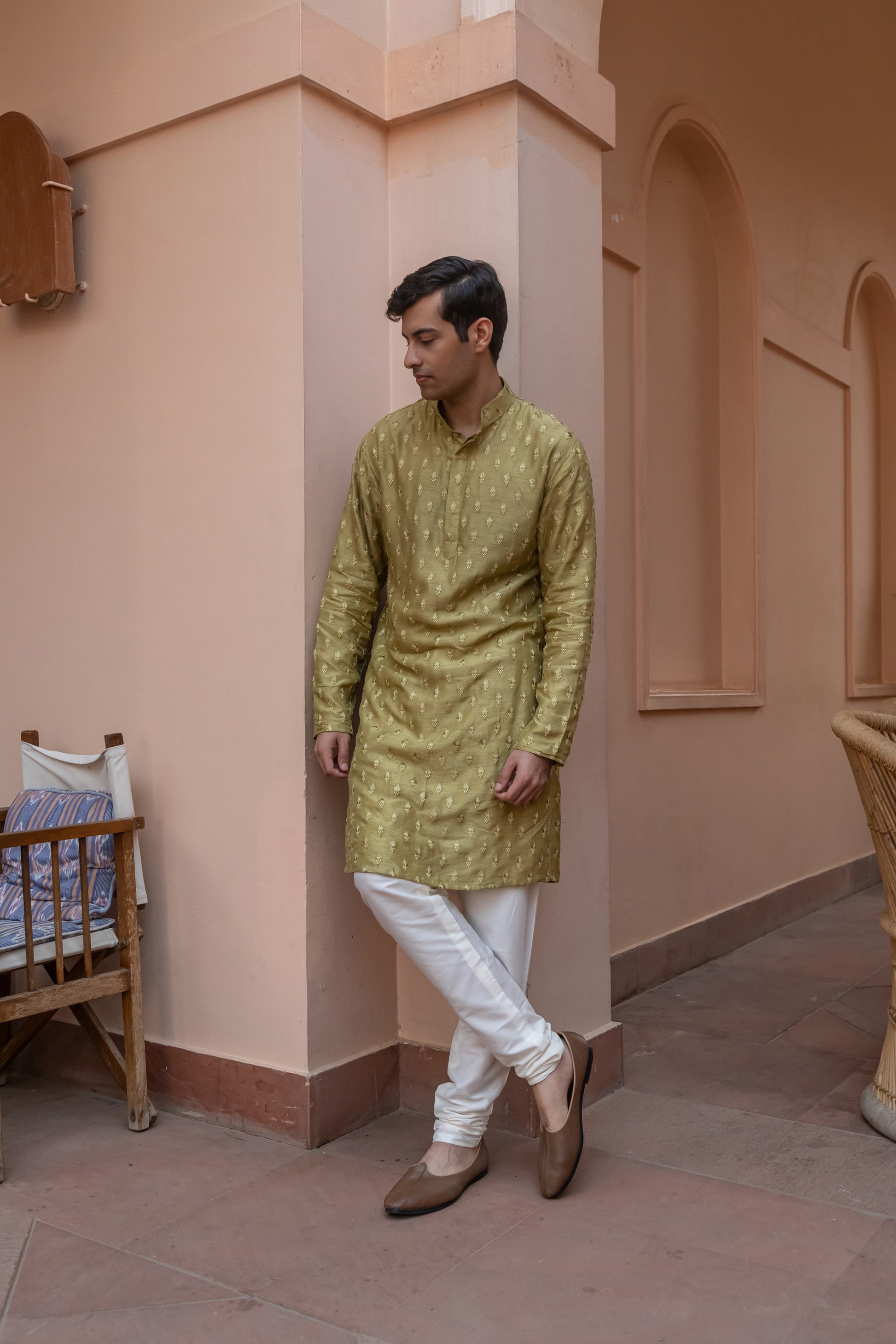 A modern classic, this mehendi green silk kurta is embroidered with motifs, offering a subtle interplay of texture and tradition. It is paired with an off-white silk churidar, designed in a relaxed fit for effortless comfort and contrast. An ideal choice for mehendi, day celebrations, festive gatherings, or pre-wedding rituals, this set balances richness with restraint.