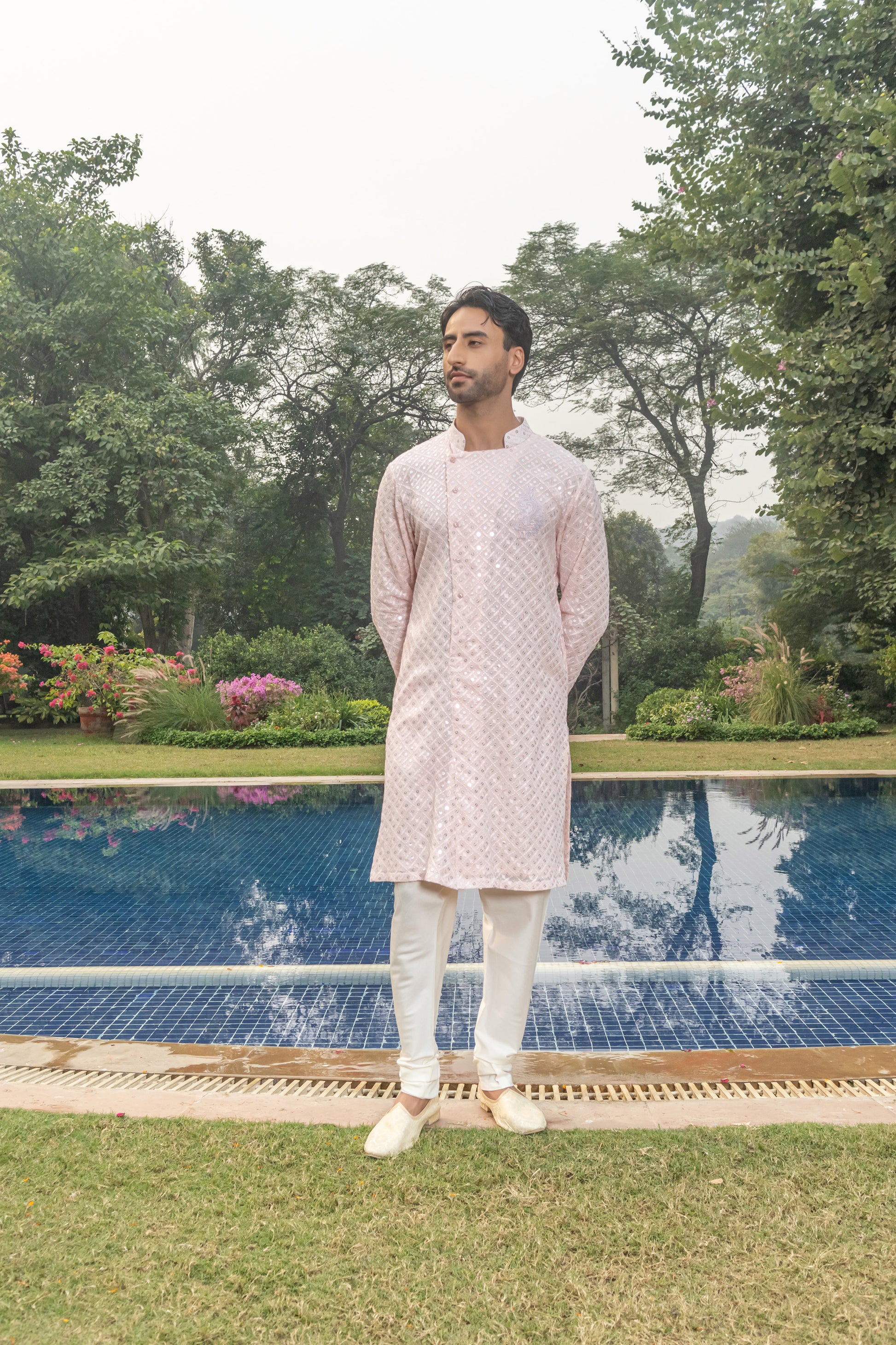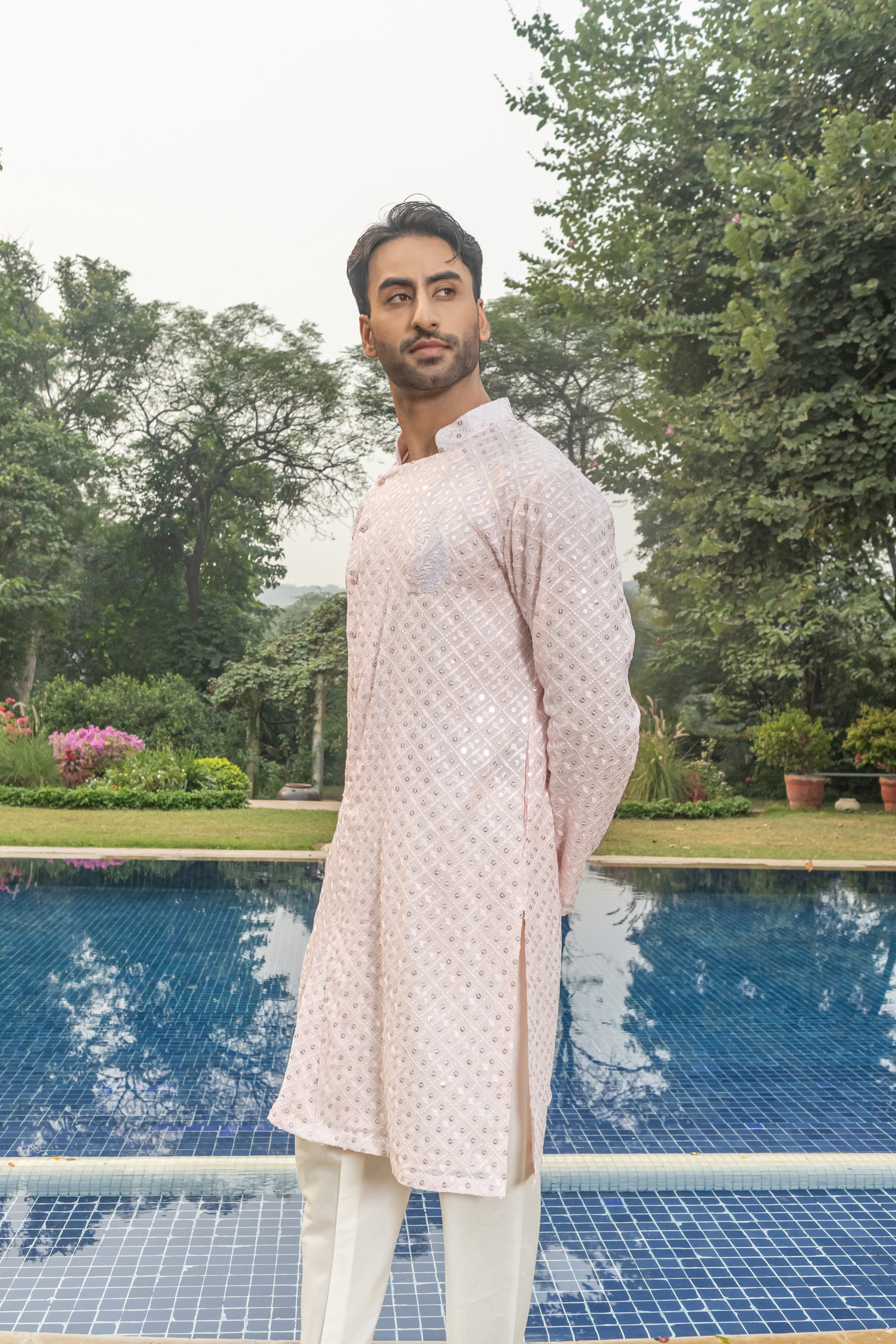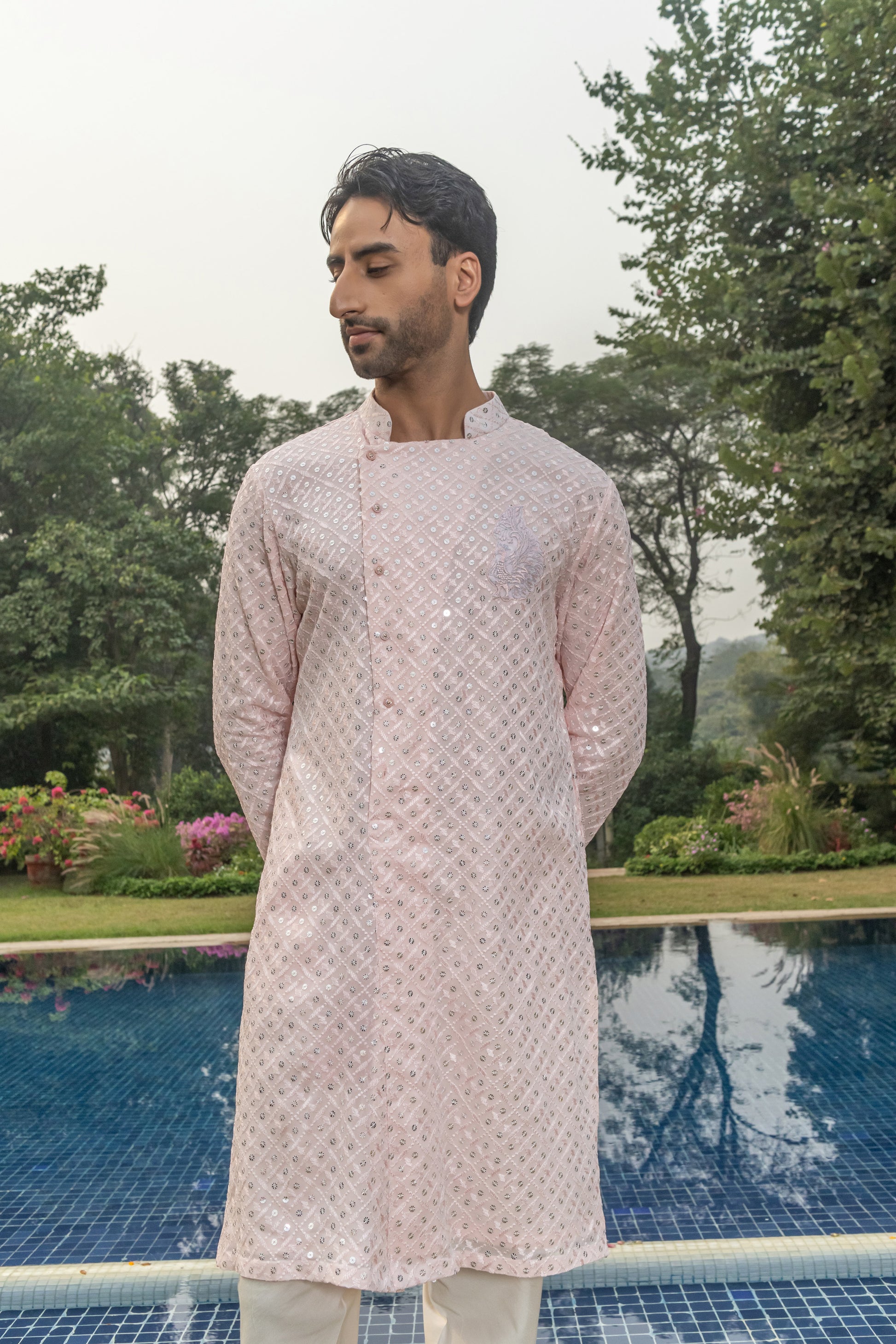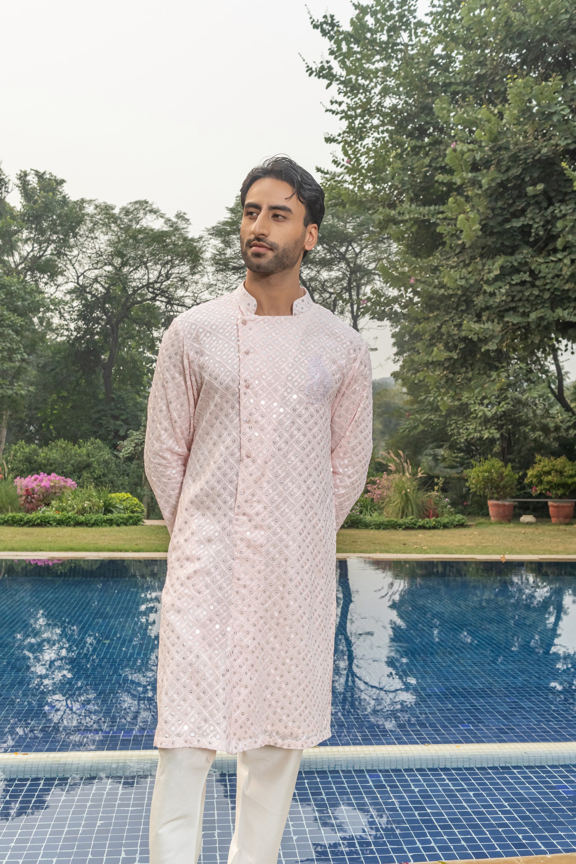 A delicate fusion of tradition and grace, this Angrakha-style kurta in soft salmon pink is adorned with fine gold-toned embroidery, creating a subtle shimmer that catches the light with every movement. Paired with a cotton-silk ivory churidar, this look offers fluid comfort with regal charm.