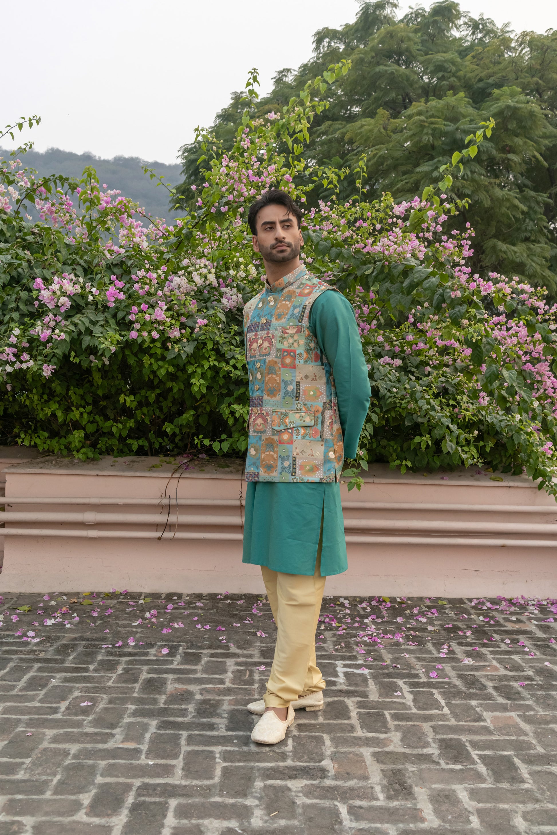 A celebration of Traditional Teal, with texture and tone, this three-piece set brings together heritage weaves and contemporary form. The multicolour vest is a rich silk brocade detailed with classic motifs and a subtle sheen, perfect for making a statement.