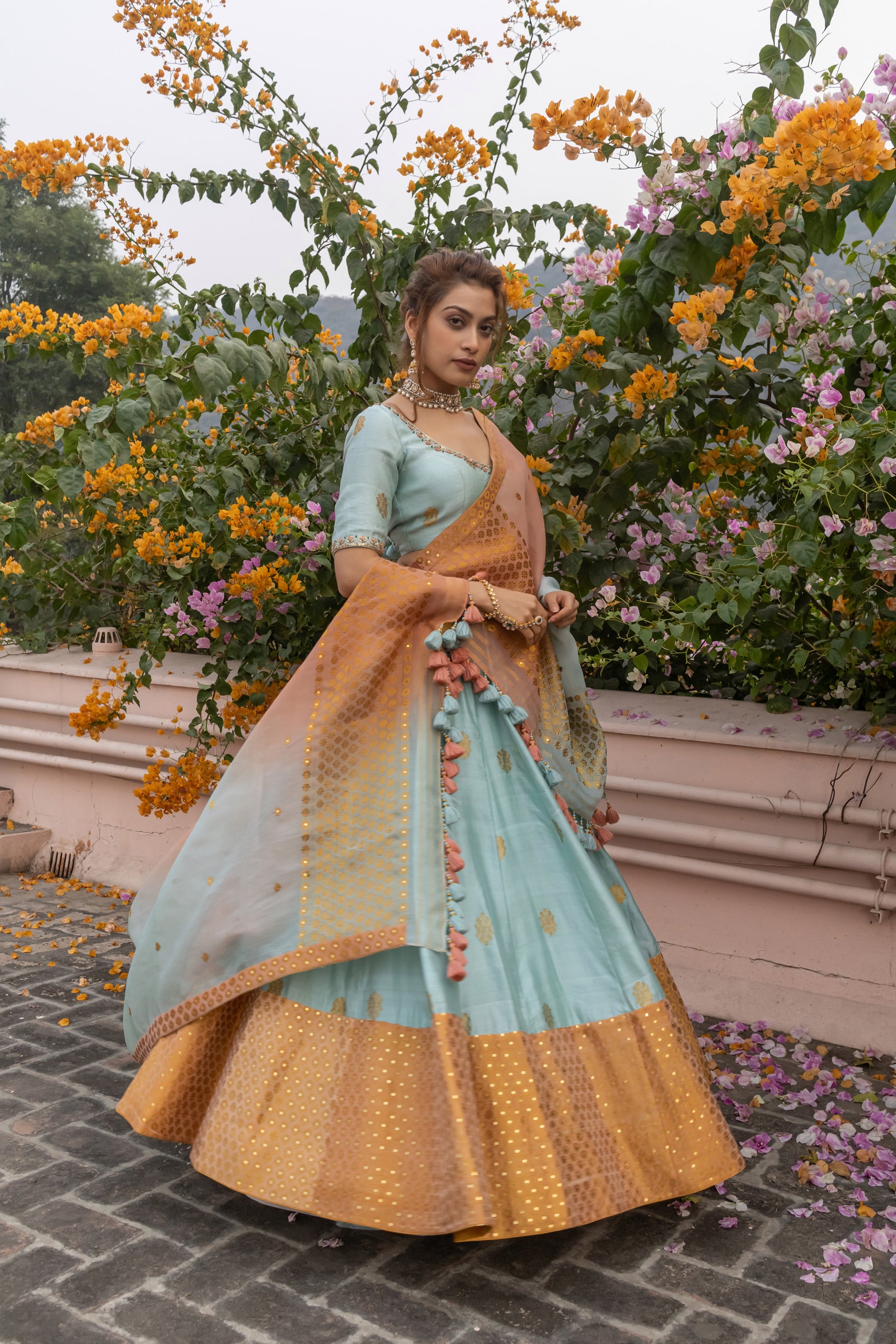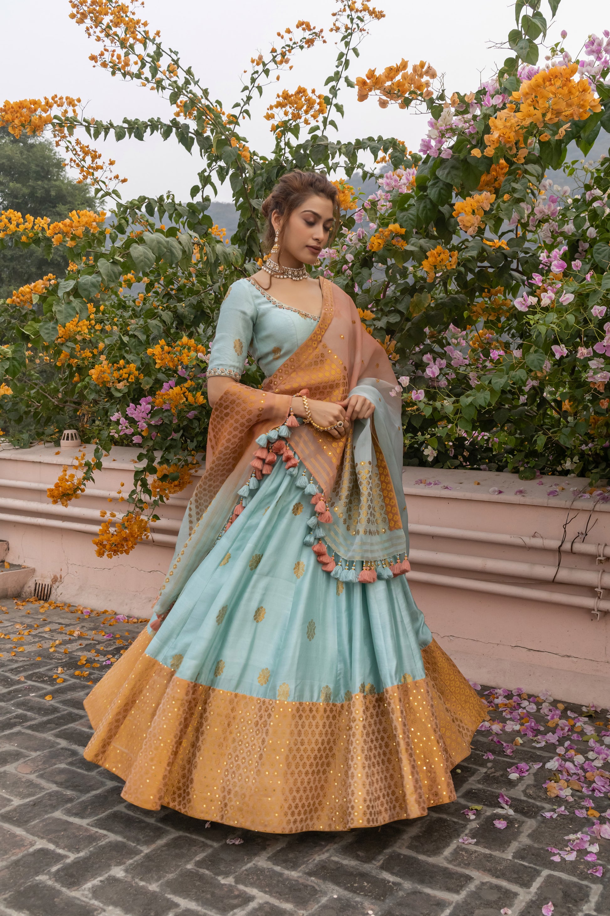 Hand woven in Assam silk, Tropical Mirage is a lehenga set that blends soft teal blue and golden peach tones woven with gold guna (zari), creating a luminous and layered finish. Hand sequin highlights are featured all over the garment, adding depth and shimmer, with a gold zari border and handmade tassels.