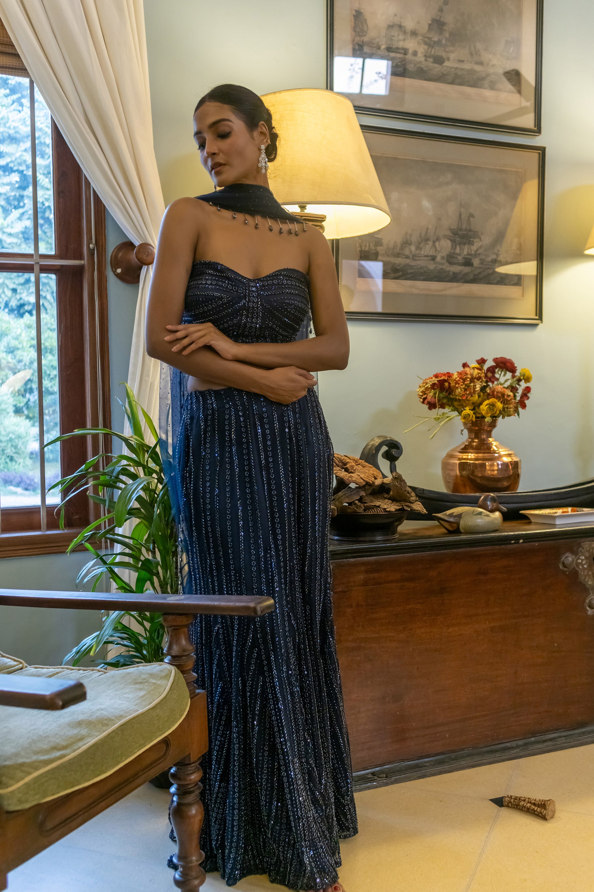 The Midnight Blue Majesty lehenga saree is a statement of refined elegance, crafted from intricately embroidered net to sculpt the silhouette with a graceful flair. The mermaid-cut skirt flows beautifully, while the corset-style blouse, made from matching embroidered net, offers a structured yet graceful silhouette. The maharani net dupatta, adorned with delicate Swarovski-studded borders and playful tassels, completes the ensemble with a regal finish, making it perfect for a reception or cocktail event.