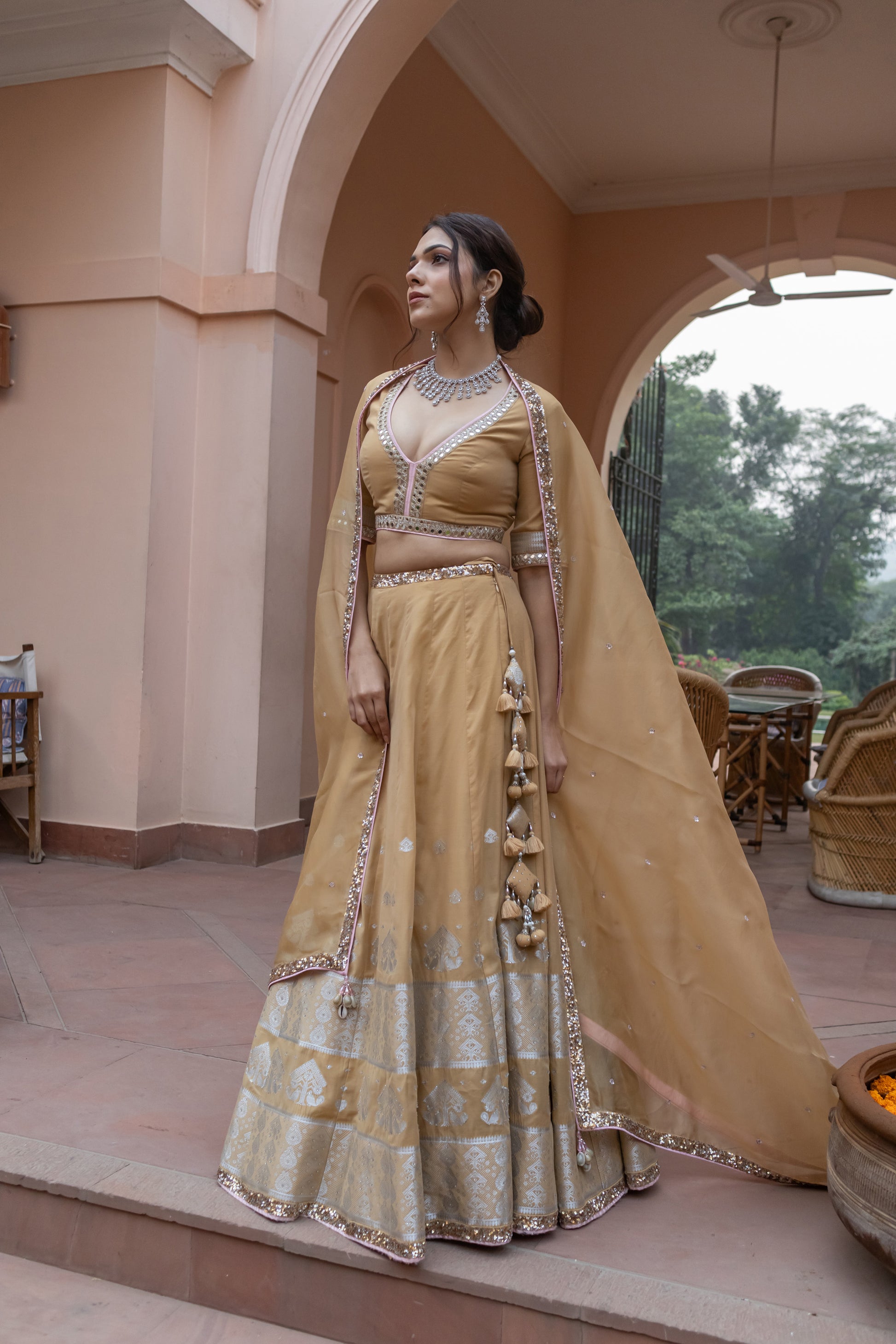 Golden Serenade is a stunning lehenga with a blend of tradition woven from silver-woven Assam silk. Adorned with intricate woven borders, sequin embellishments, and custom tassels, the lehenga radiates timeless elegance. The pure silk organza dupatta, adorned with all-over hand-embroidered sequins and intricate motifs, is finished with customised handmade tassels, adding a graceful, radiant touch and paired with a brocade woven choli.