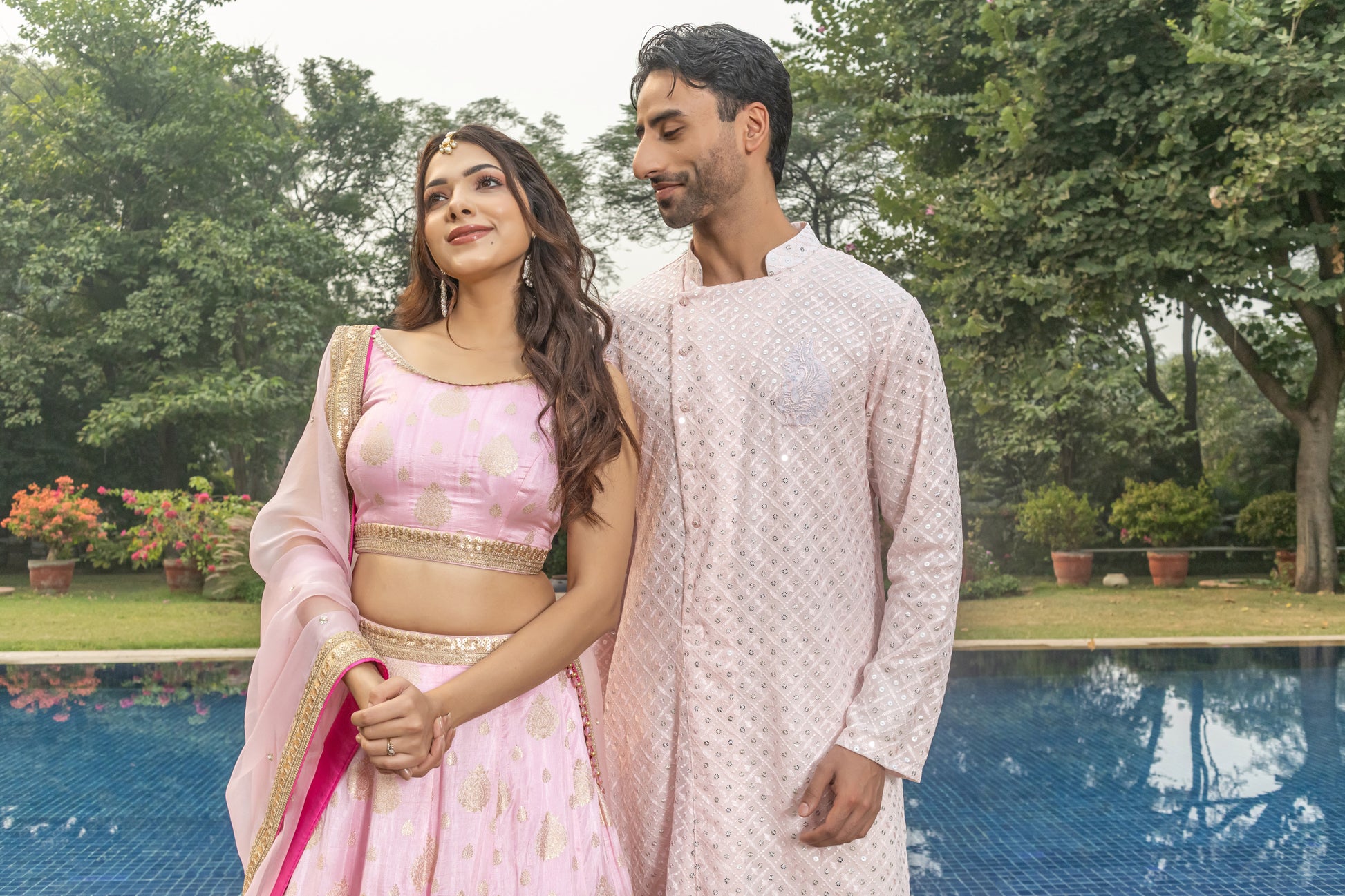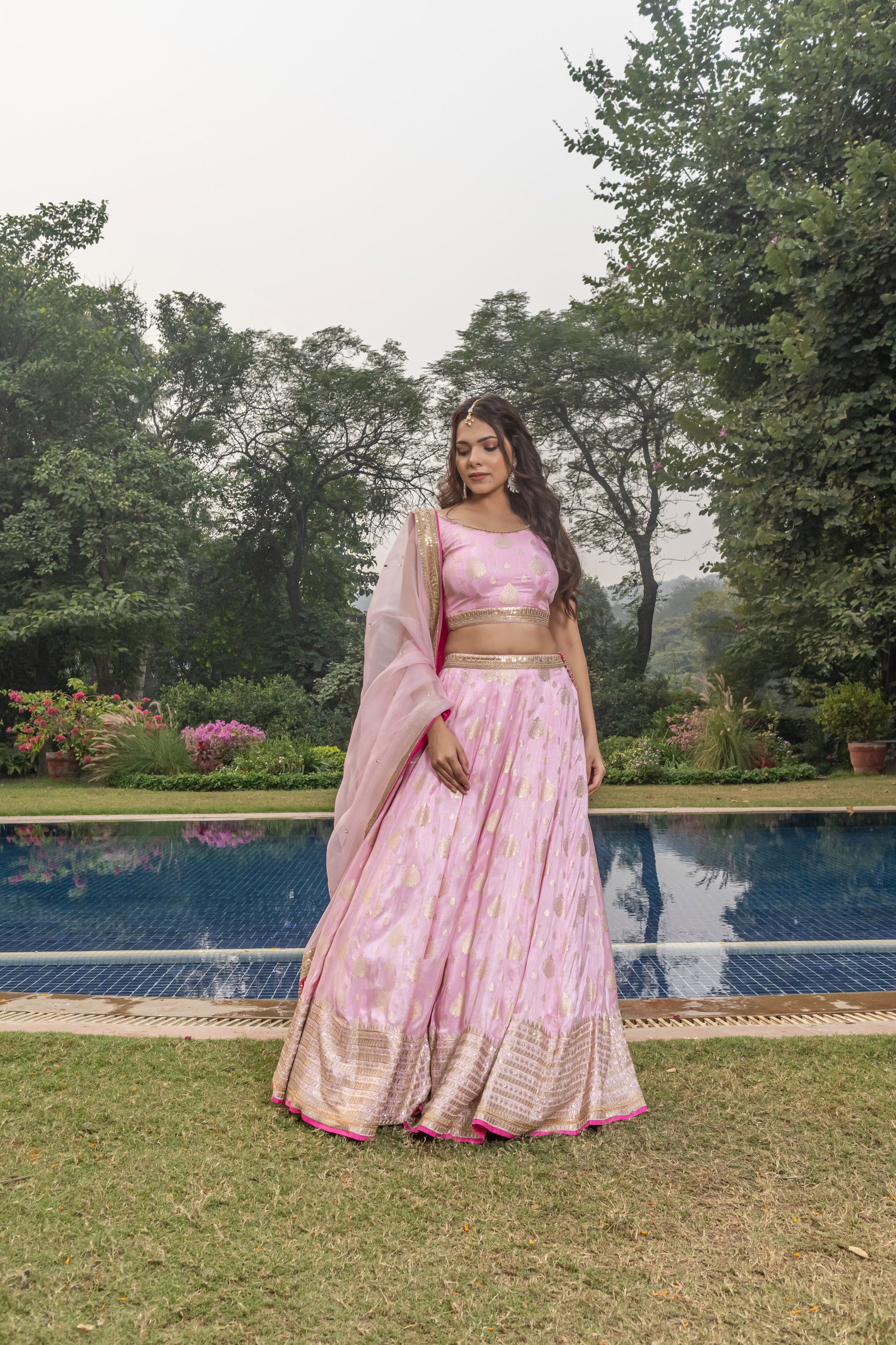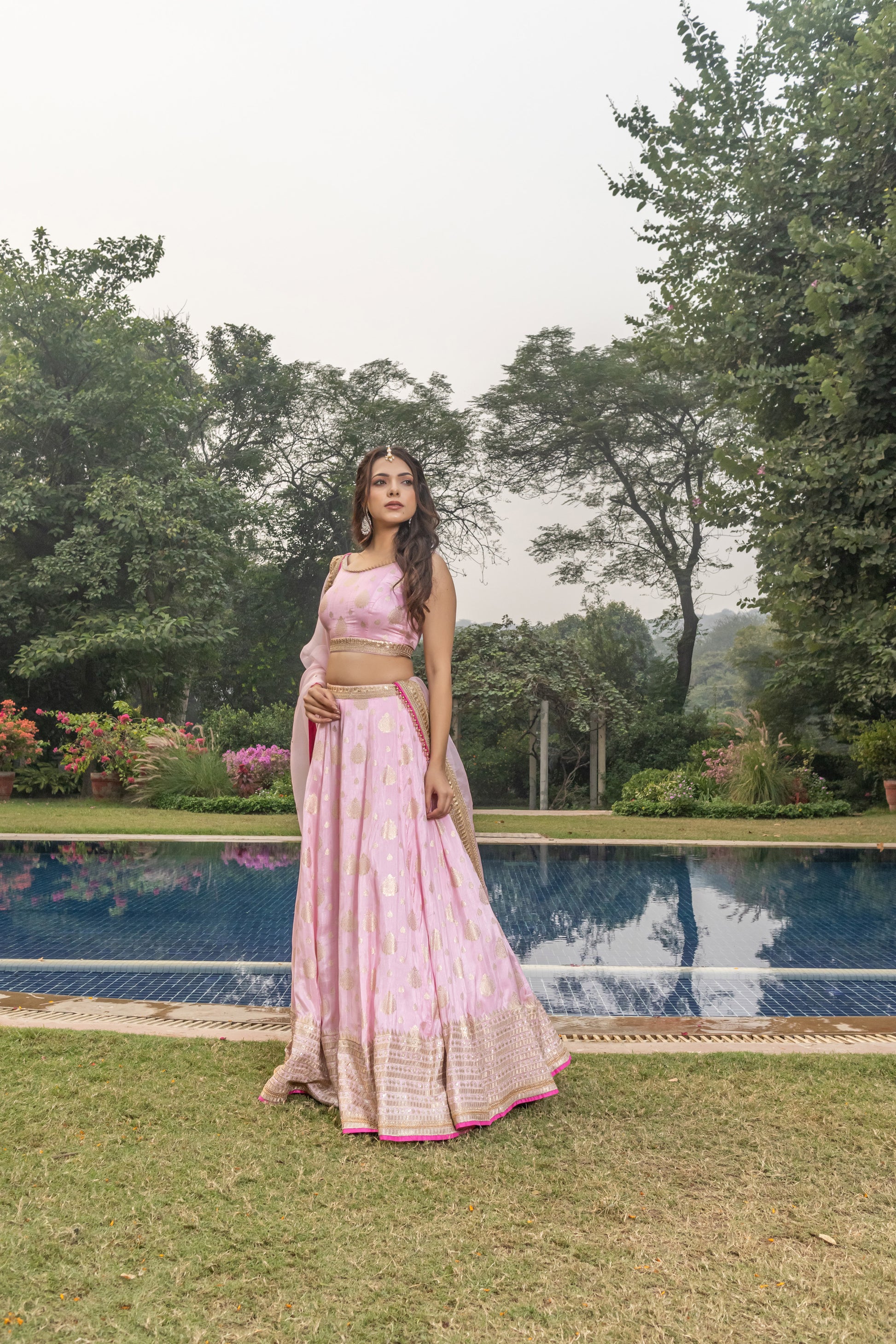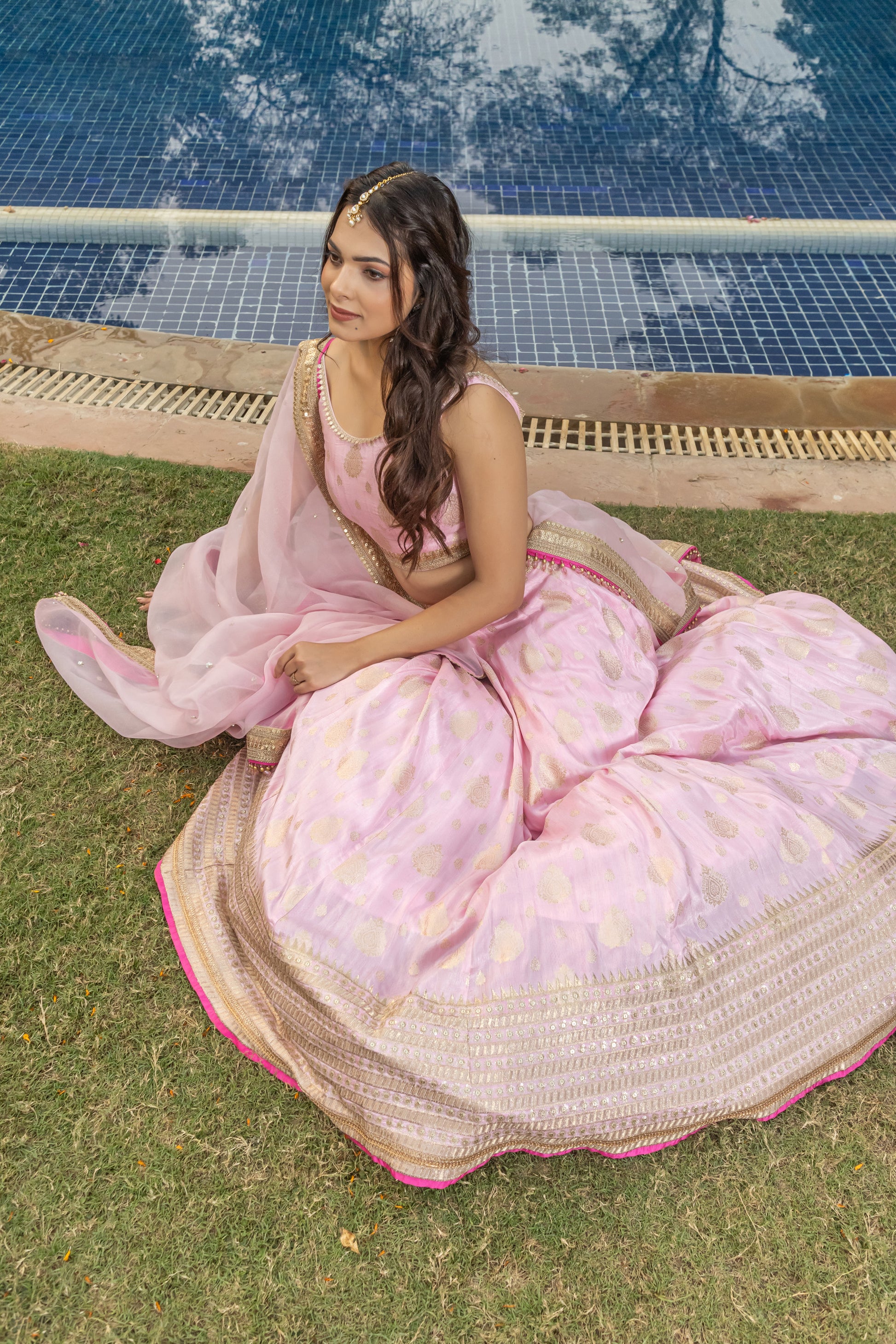A vision in blush tones, this baby pink silk lehenga features elegant light gold zari borders, finished with vibrant hot pink accents and customisable tassels. It’s paired with a sleeveless embroidered choli that lends modern charm to its traditional silhouette.