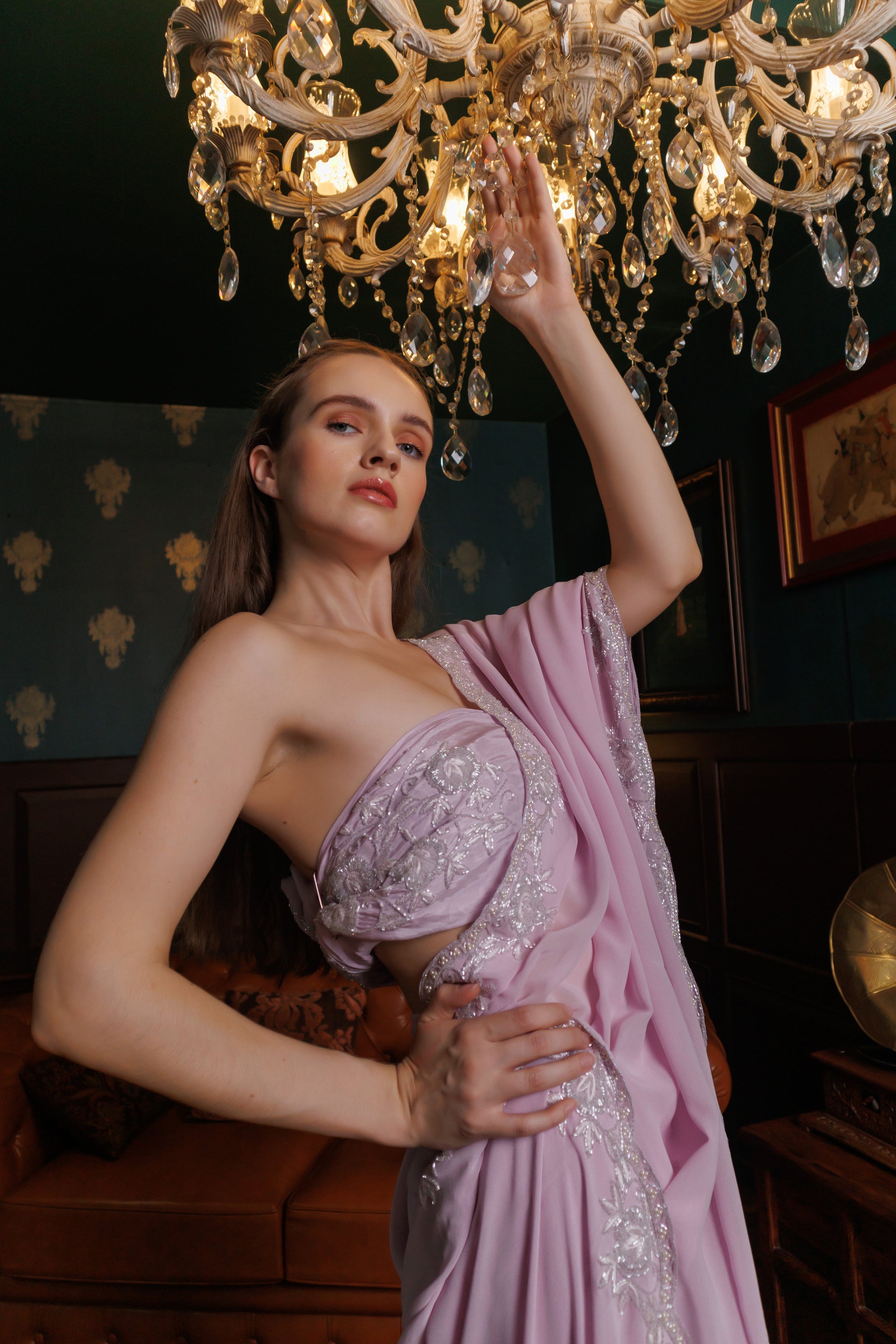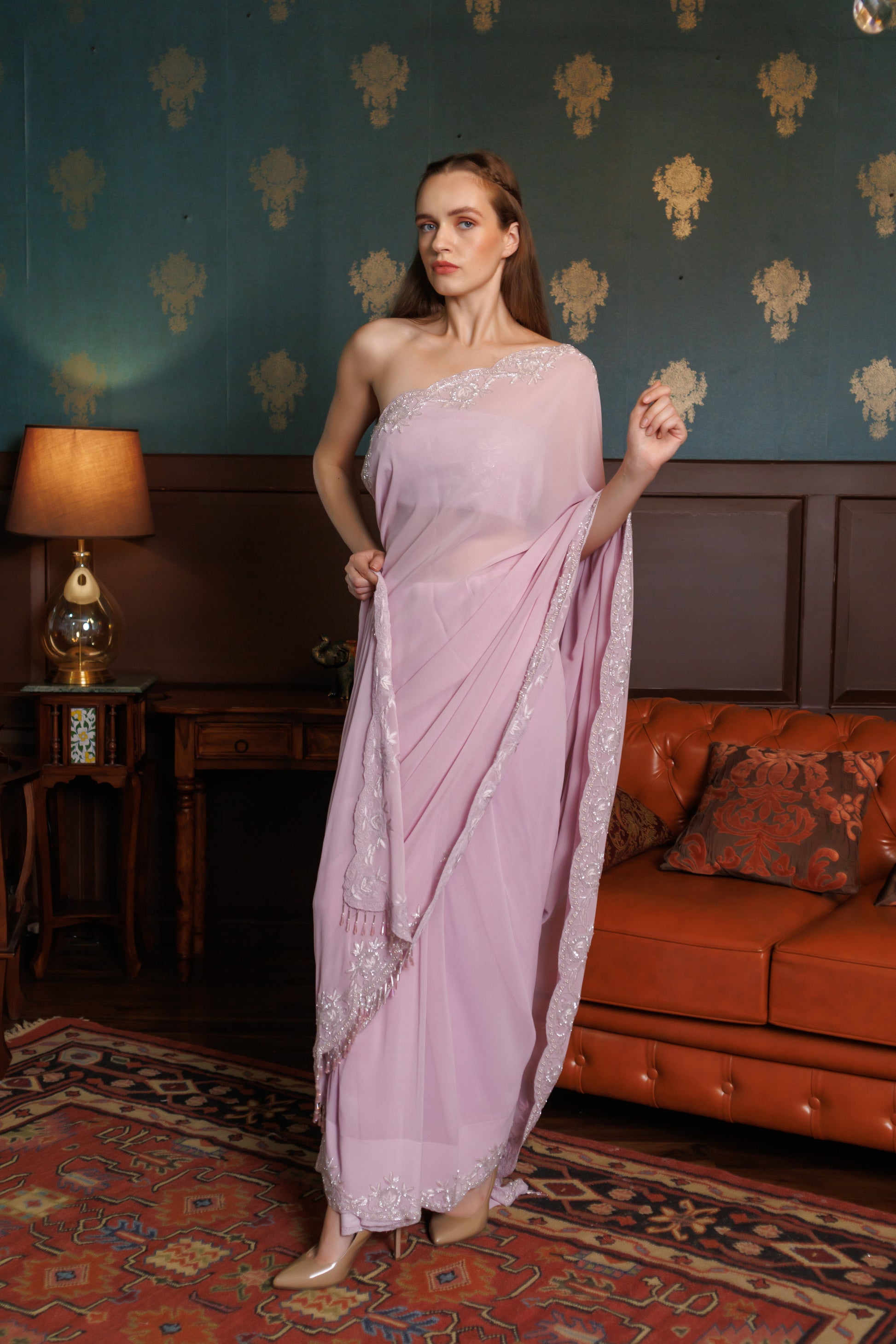 Simple and elegant at first glance, this lilac georgette saree possesses more than meets the eye. Carefully scalloped edges with intricate zardozi and pearl work, this saree is elegance redefined.