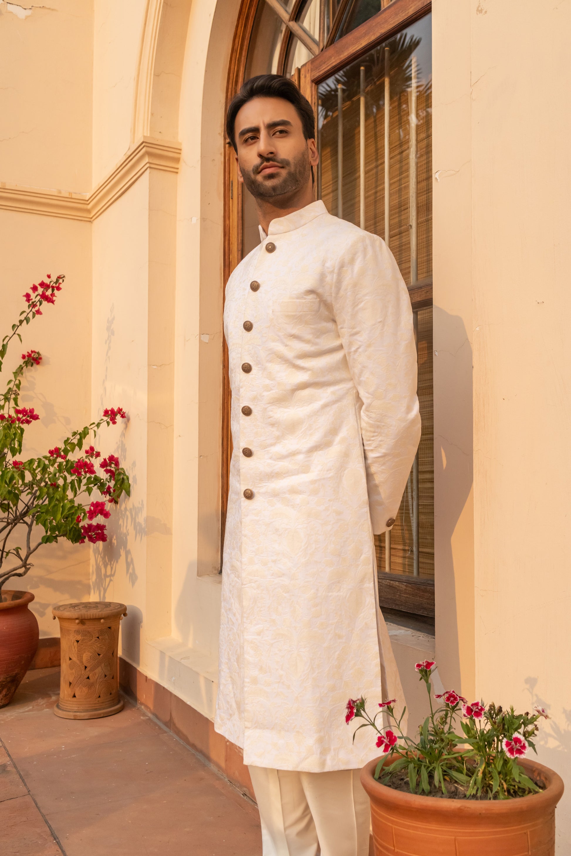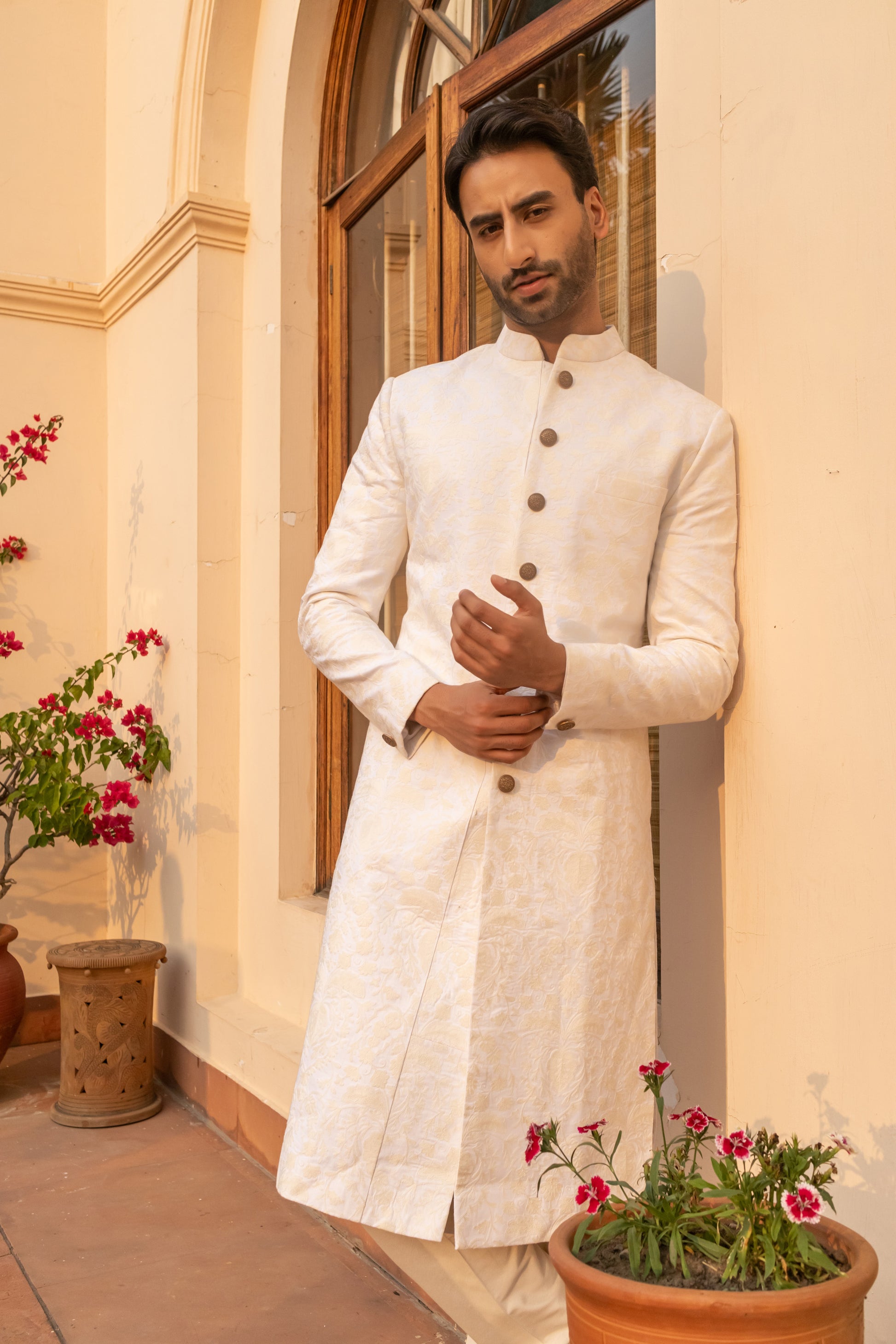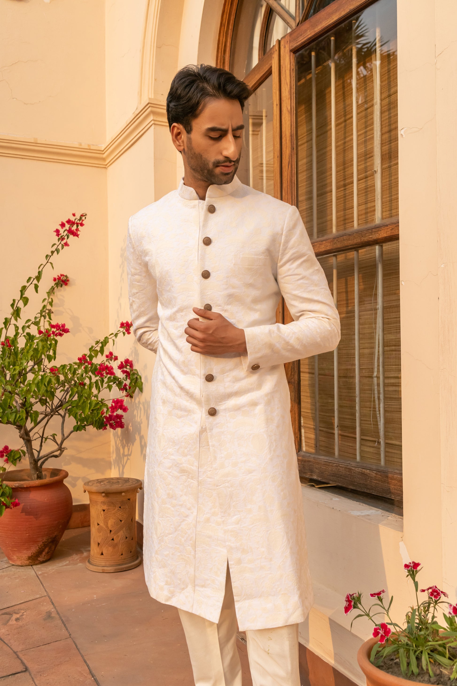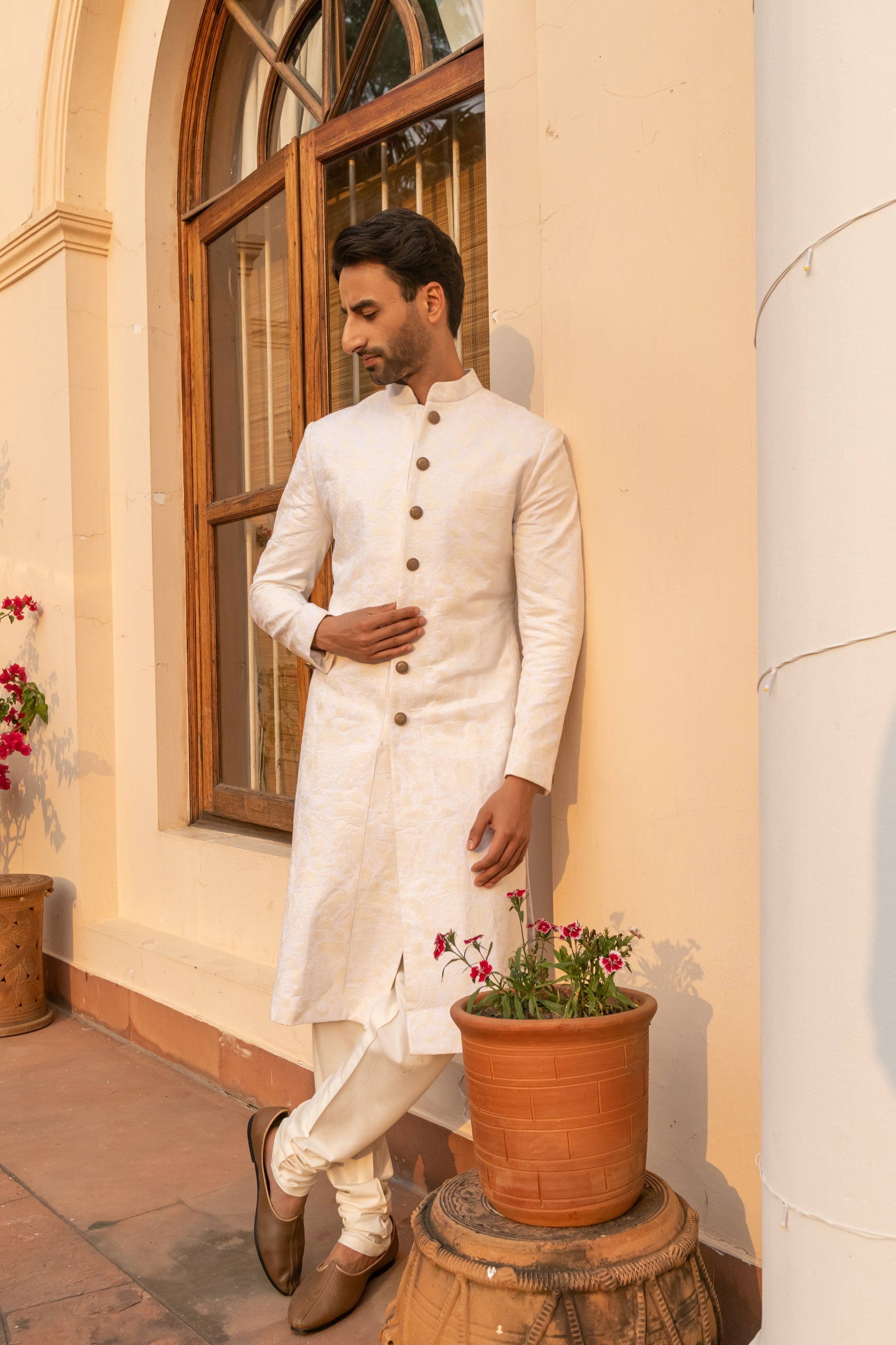 Paired with a matching kurta and churidar, the ensemble is perfect for day weddings, intimate ceremonies, or modern grooms seeking timeless elegance in a whisper-soft palette. A vision in white — effortlessly refined.
