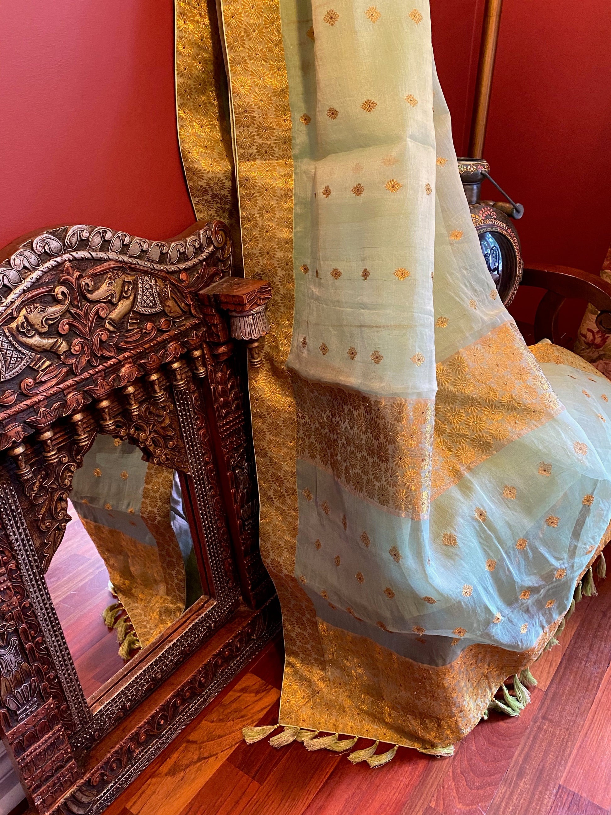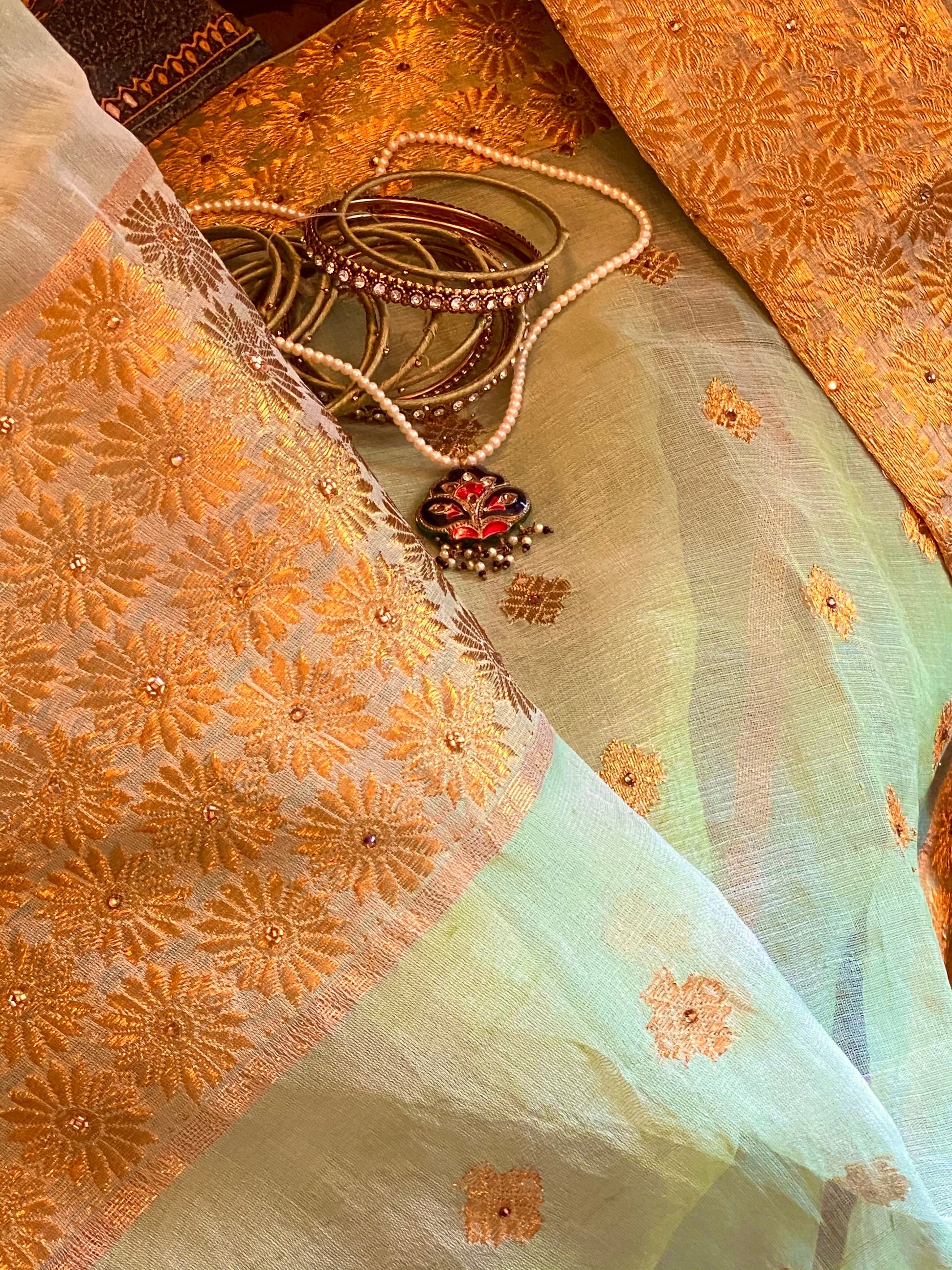 Our Handwoven Emerald Green and Blue Nuni Silk saree is sheer elegance that never fades. Handwoven with zari buta all over and brocade pallu/aanchal, highlighted with Swarovski crystals and katdana work on aanchal and saree border. Pure silk finishing is in all our sarees.