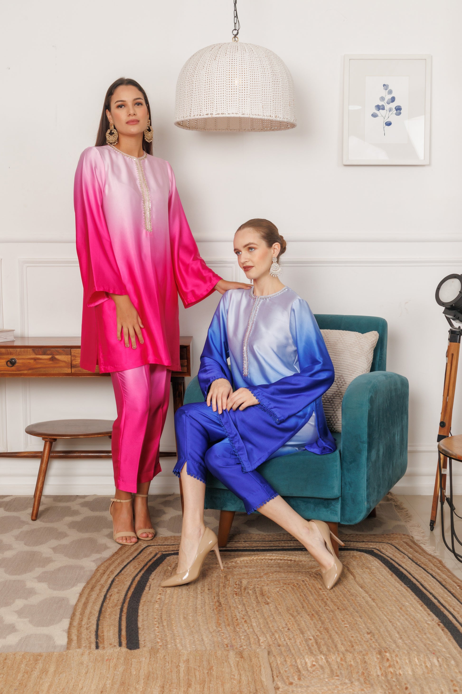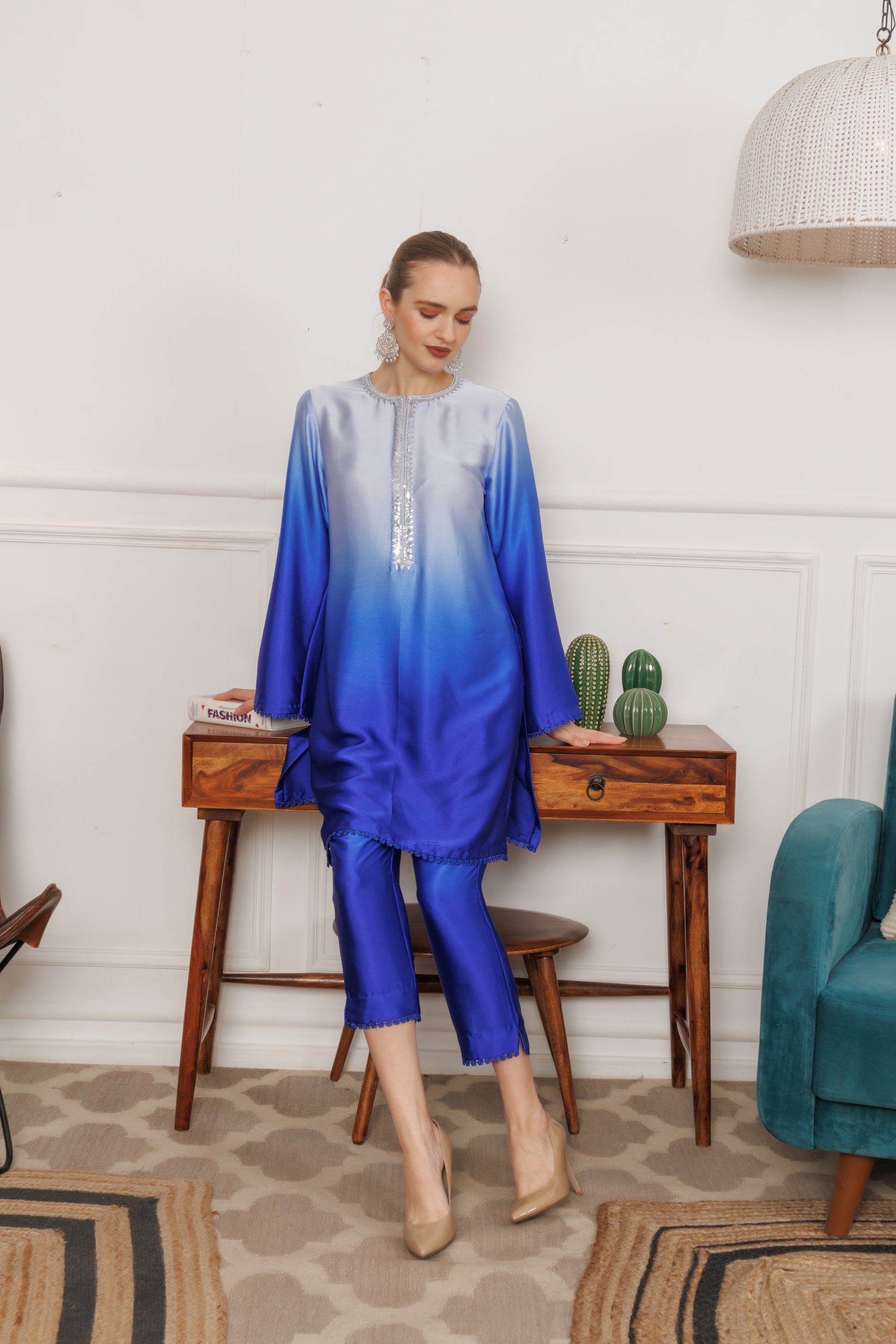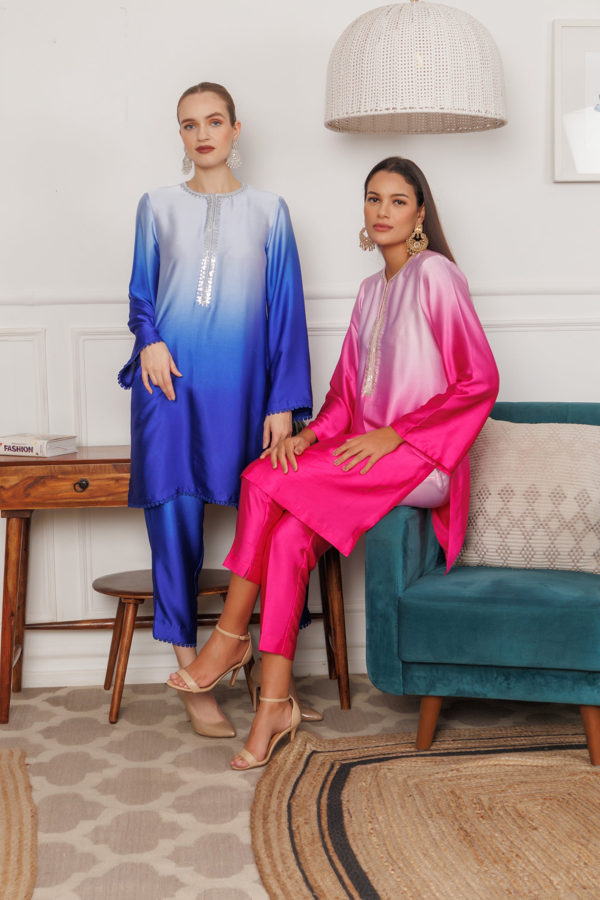 This two piece satin ombre set is a dynamic choice for your social affairs. A delicately handworked neck-line with sequin work adds a dash of dazzle, and can be dressed up or down as per your wish.