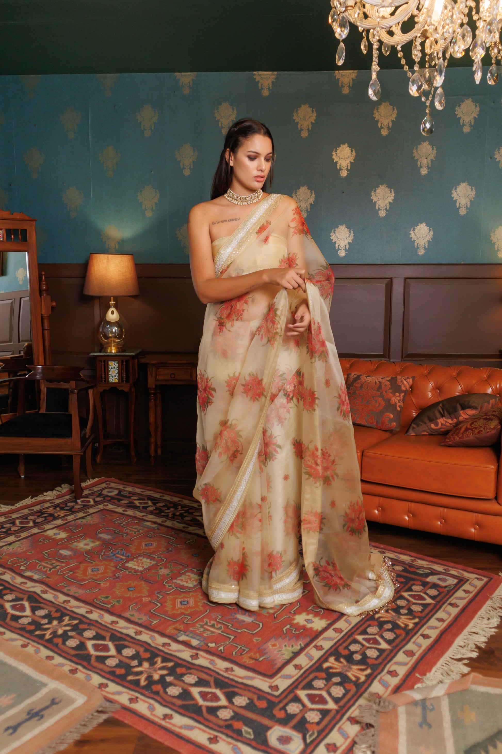 Drape yourself in sophistication, where subtle shades meet exquisite craftsmanship. Create a vision of sheer elegance in our organza saree adorned with embroidered borders and beaded tassels. Available in a floral printed organza and subtle pastel hues.