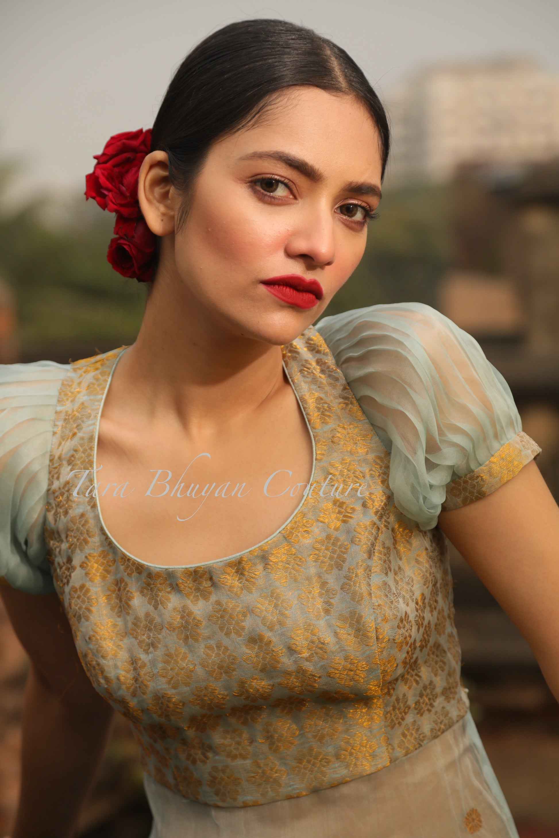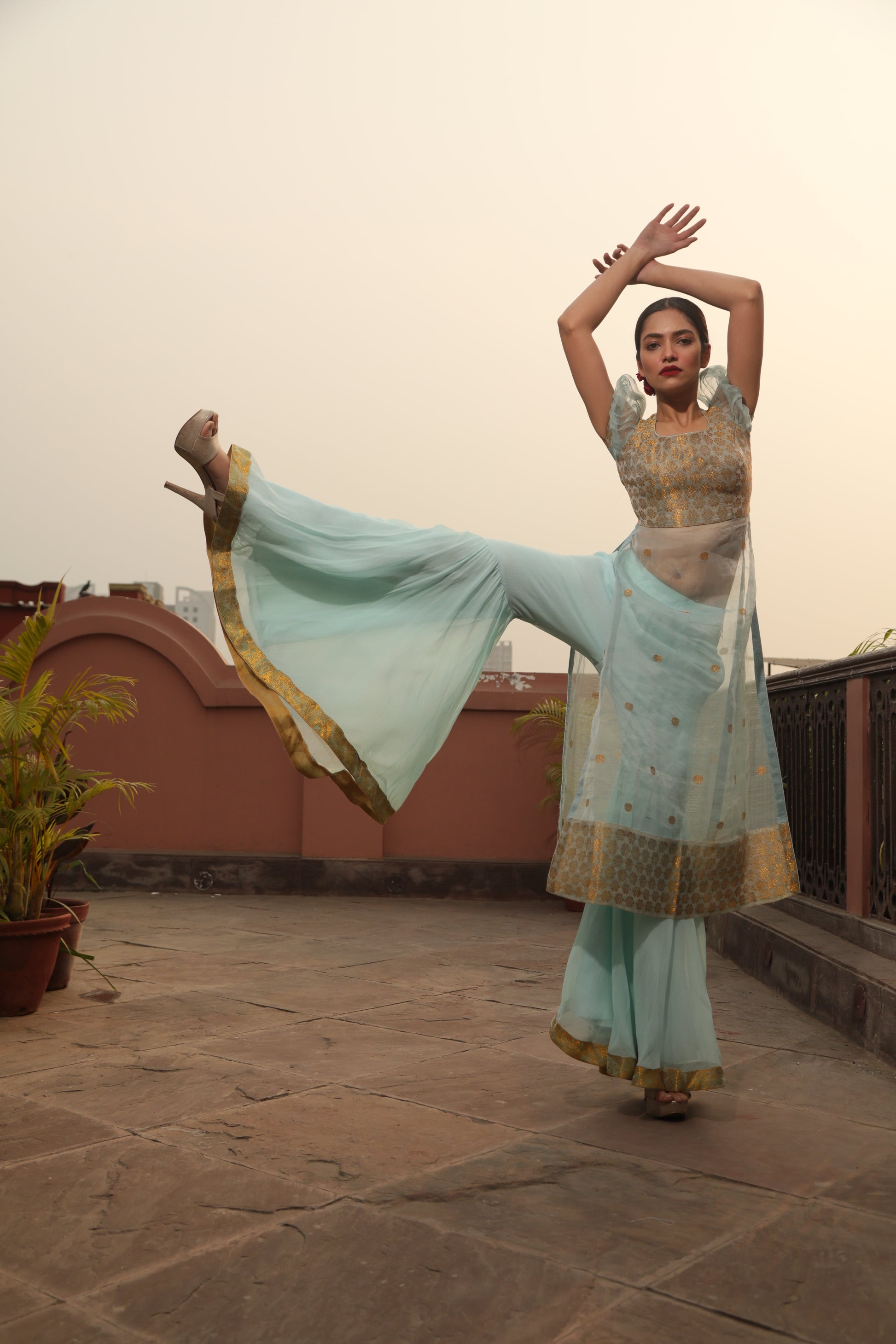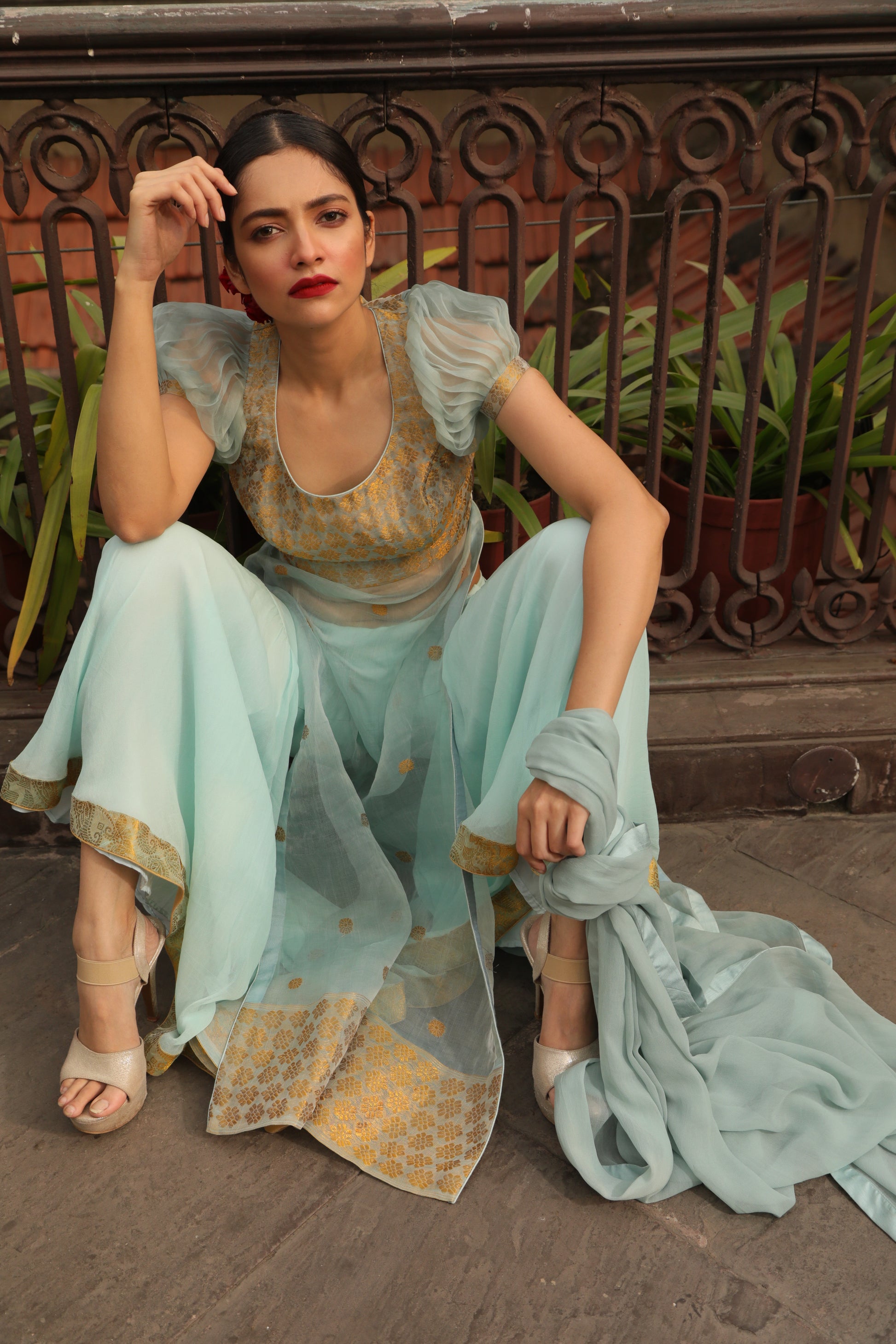 Our elegant rich handloom woven Assam Paat (Silk) Powder Blue Pakistani suit complemented with a pair of Georgette Palazzos and Dupatta. The suit has small pure gold zari butas all over with puff sleeves and brocade yoke on the front and back.