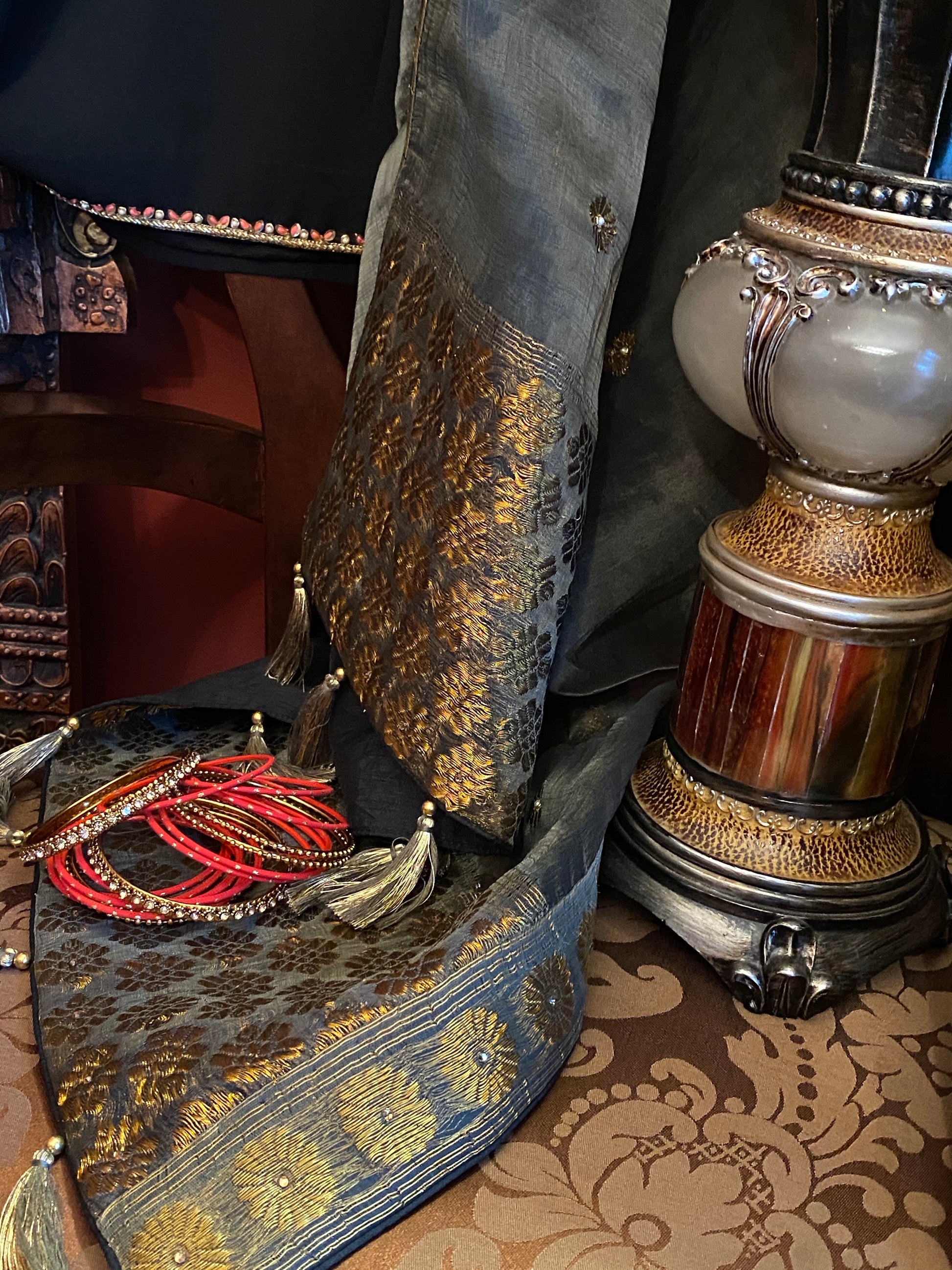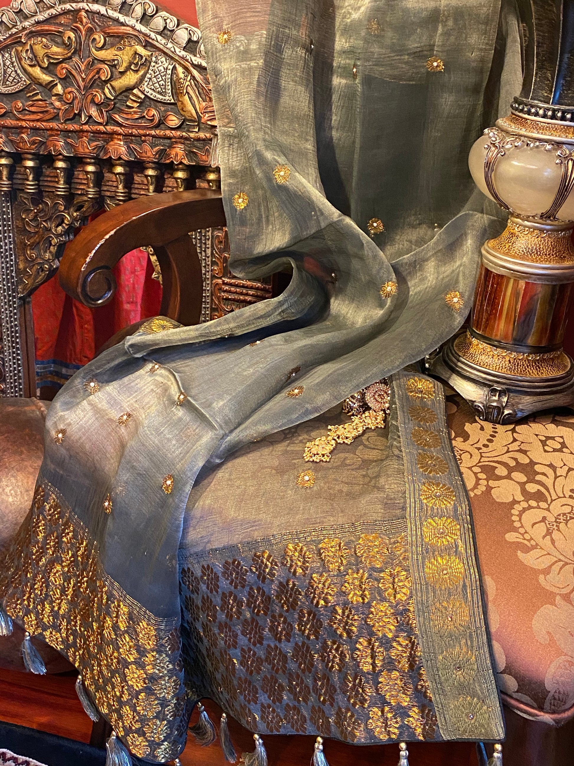 Our charcoal grey Nuni (Silk) dupatta handwoven with zari buta all over and brocade pallu/aanchal, highlighted with Swarovski crystals and katdana work on aanchal and borders an elegance that never fades.