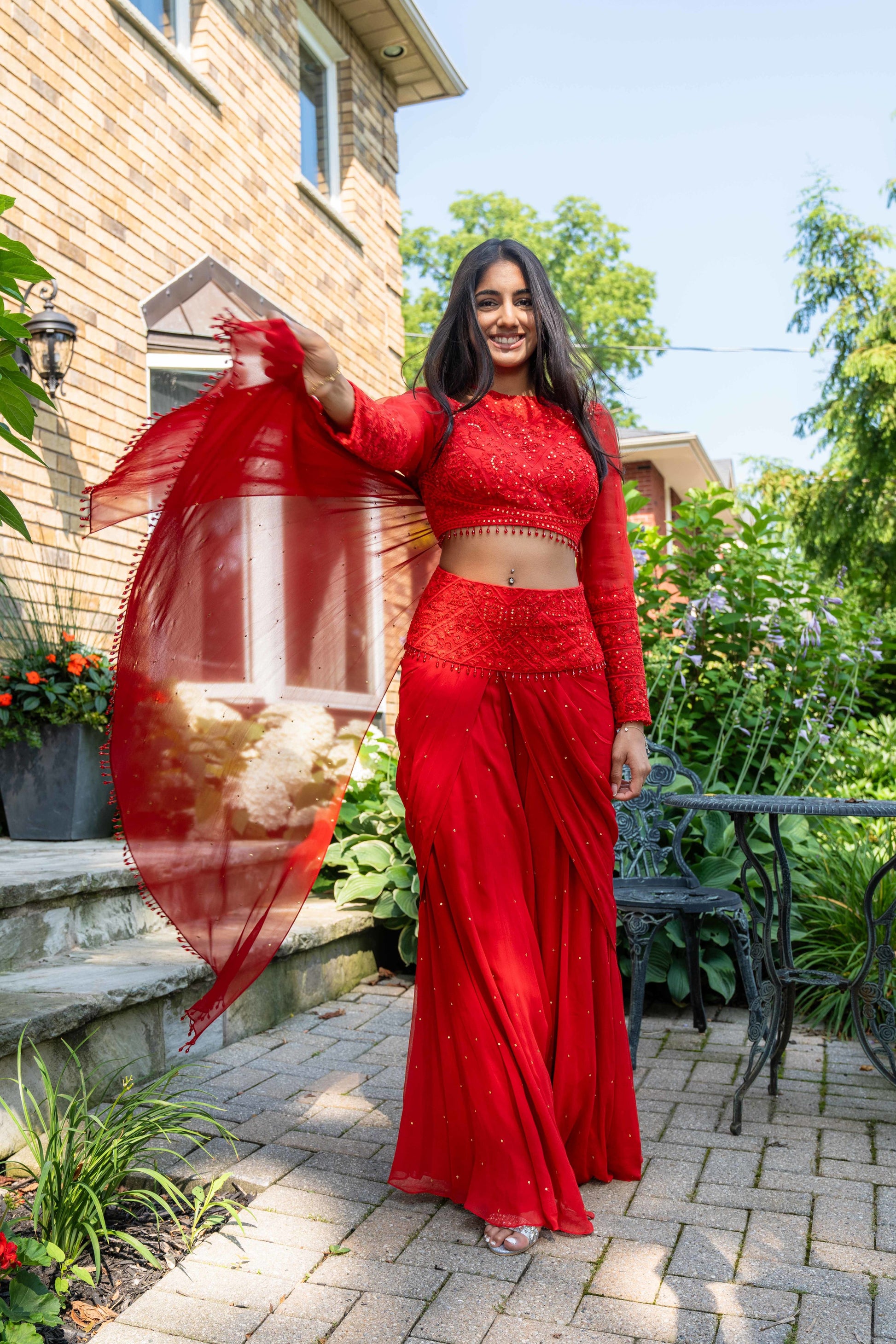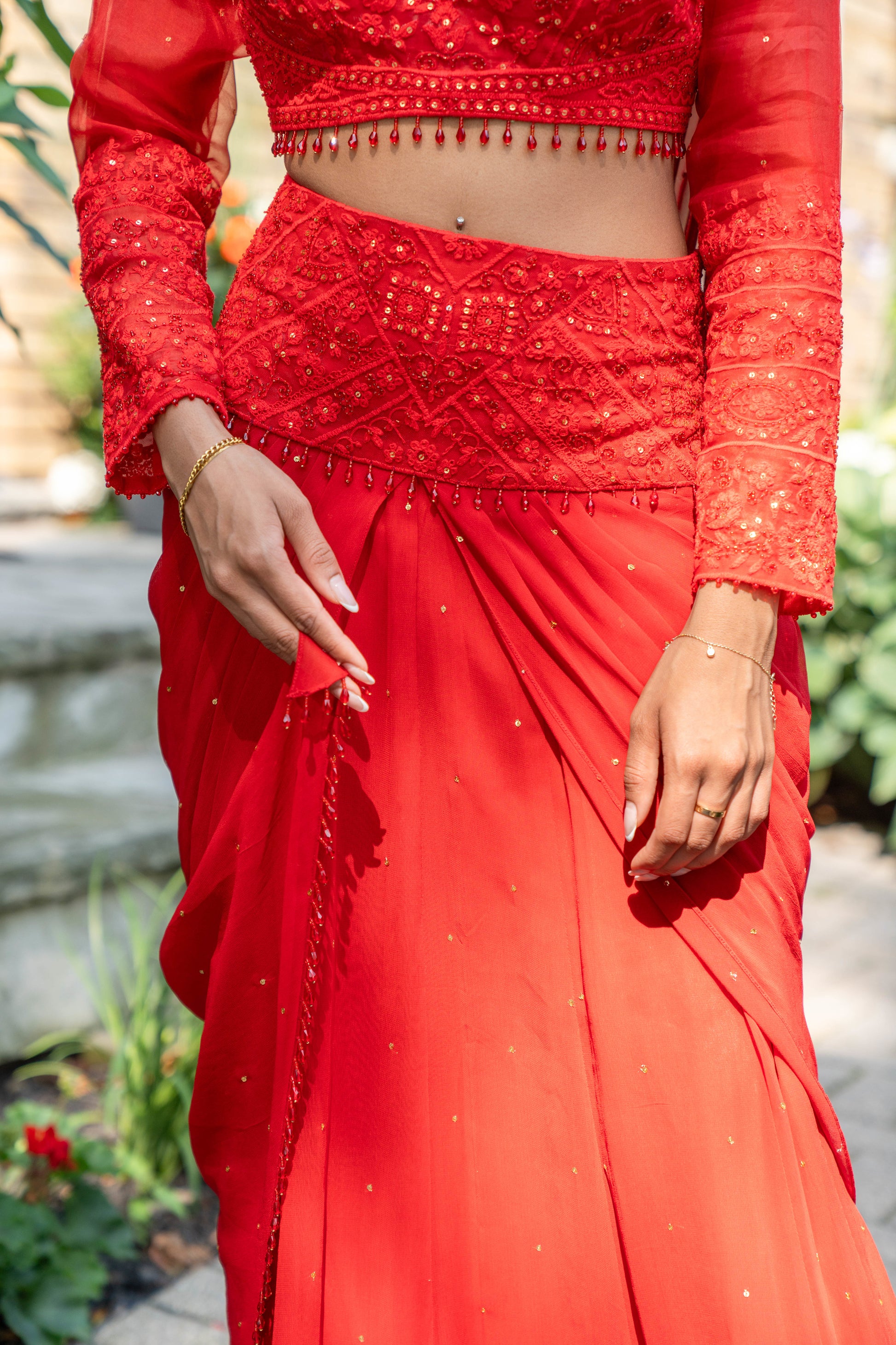 A stunning vision in red, this draped skirt and cold-shoulder blouse set is sure to be a showstopper. Made in georgette, this look is lightweight and easy to carry. It is a contemporary take on the traditional lehenga choli. Complemented by an attached dupatta, this look features intricate thread and sequin work on the blouse and around the skirt waistband, enhanced with hanging beads and handmade tassels.