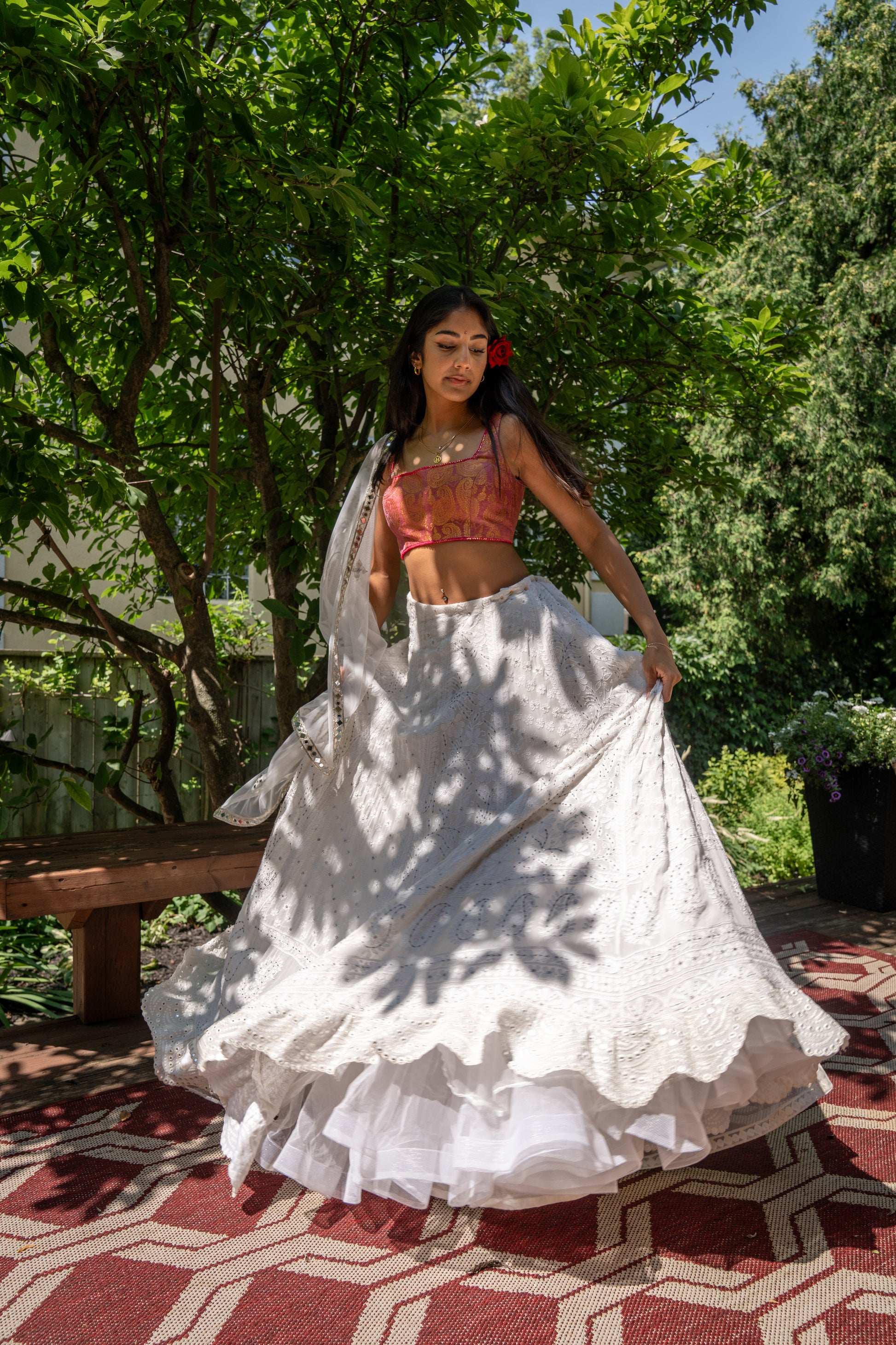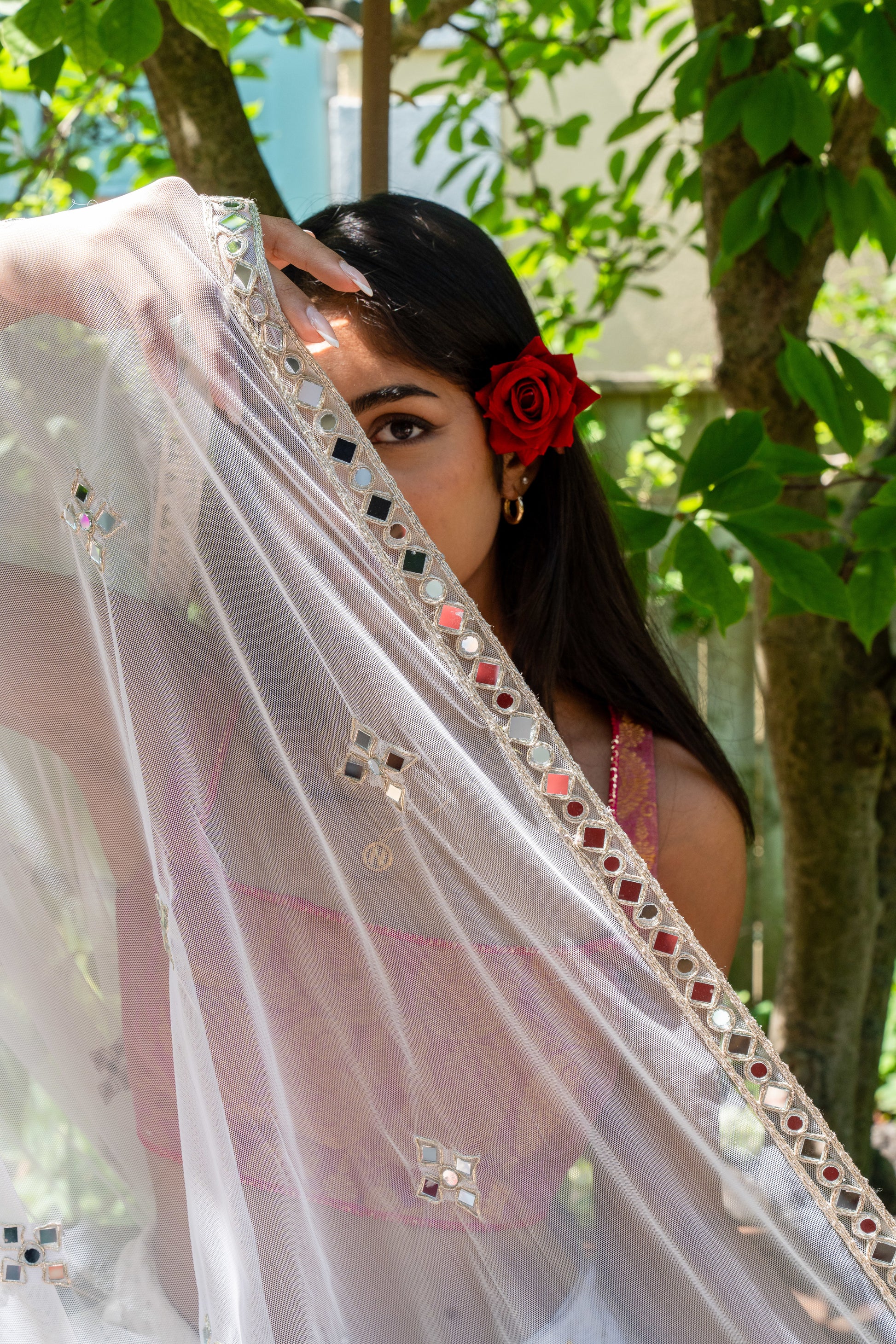 This Lucknowi lehenga and Kesa Paat choli set is a seamless amalgamation of India’s diverse craftsmanship. The elegant white of the lehenga is beautifully contrasted by the laboriously woven pink Kesa Paat choli (sourced straight from weavers in Assam) with golden zari motifs. Coupled with a mirror-work white net dupatta, this look is the perfect choice for daytime celebrations.