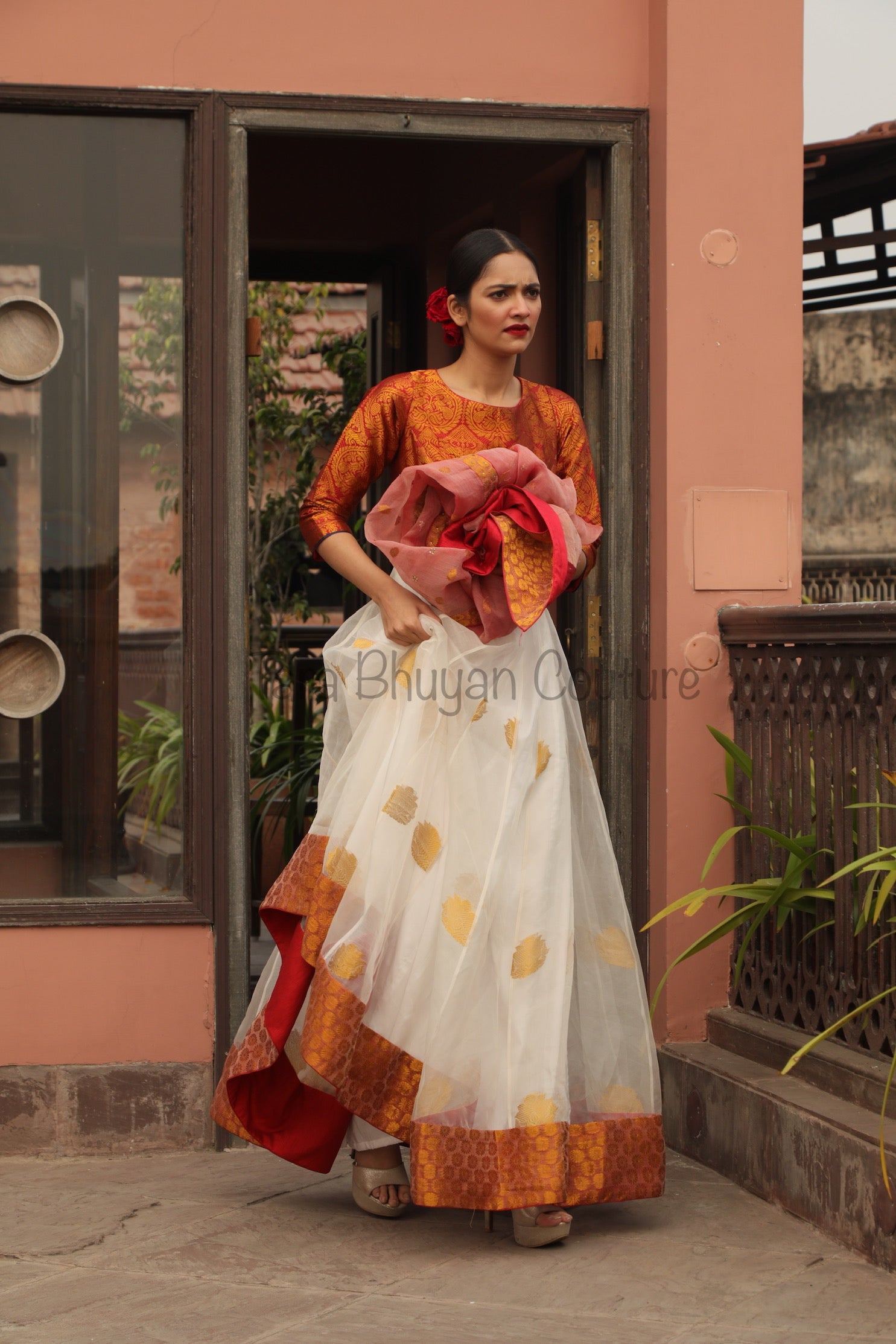 The richness of this Assam Paat (Silk) Anarkali or Lehenga has the Bengali red and ivory flavour, handwoven with zari buta and also has an intricate brocade border. The red sheer Paat (silk) dupatta with hand-embroidered Swarovski embellishments on the brocade, completes its looks.