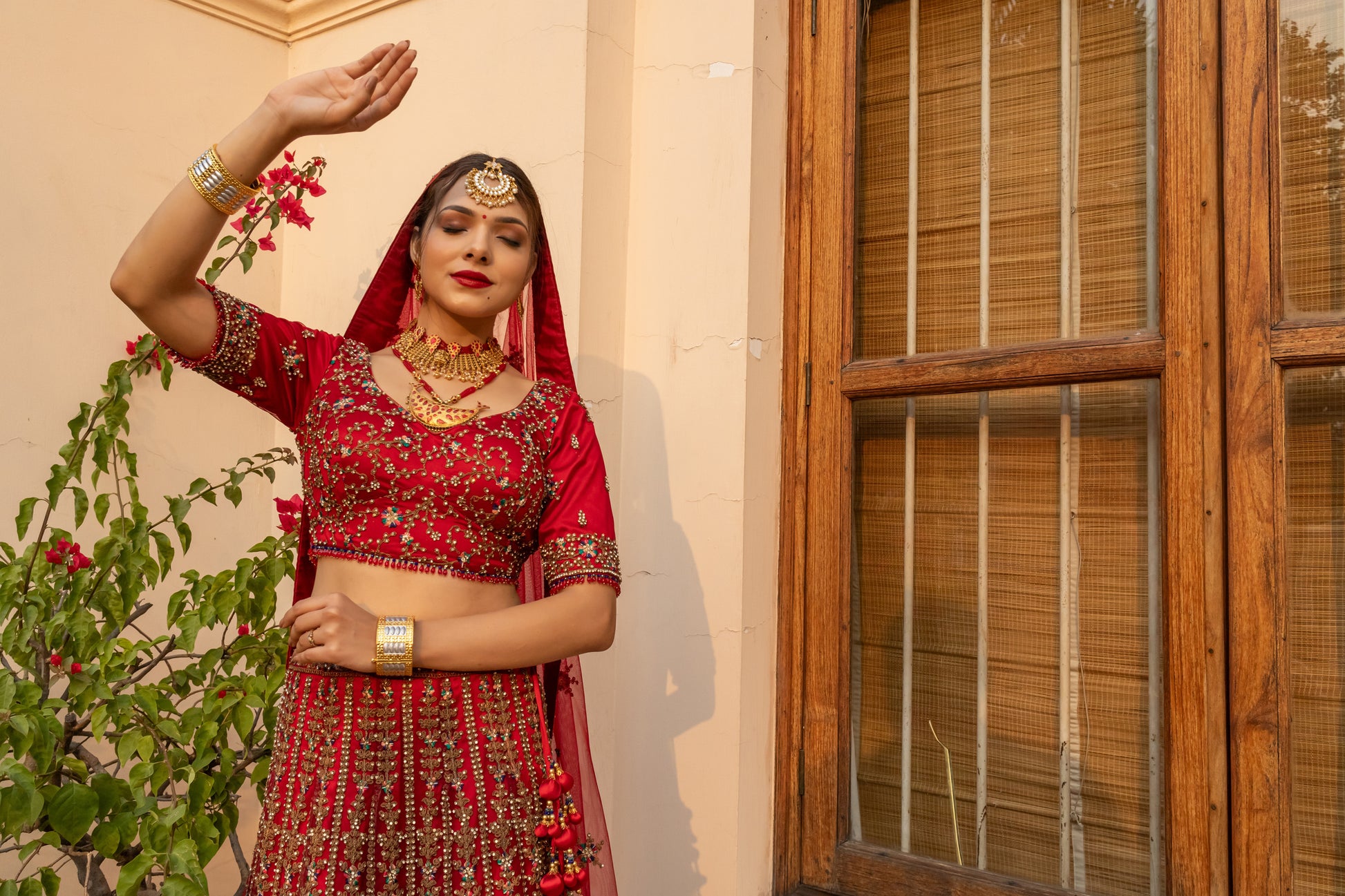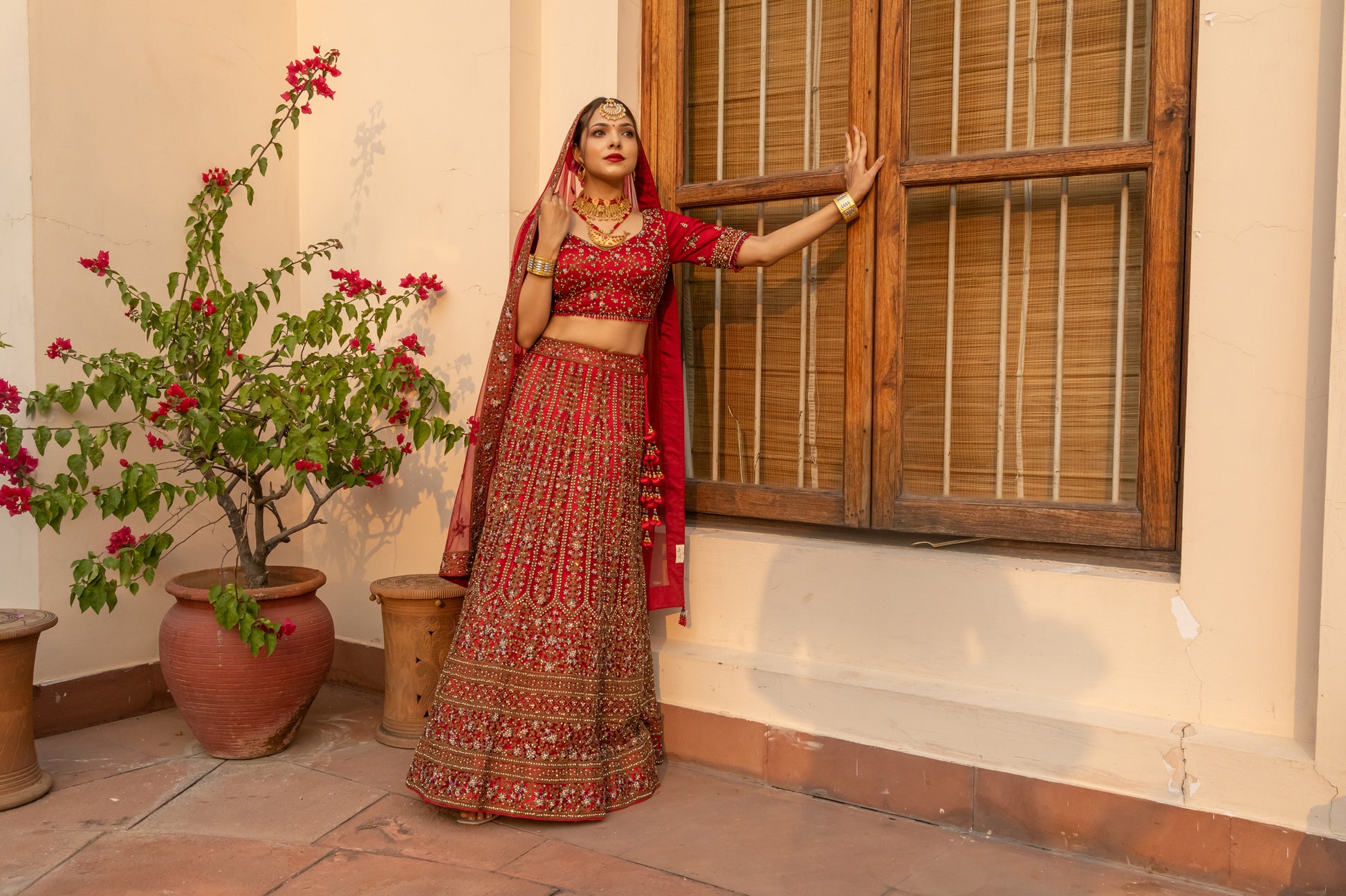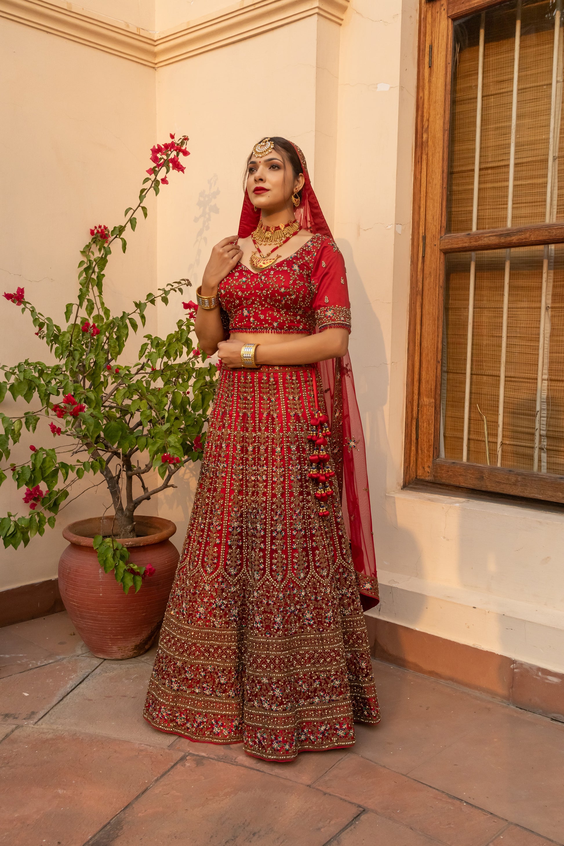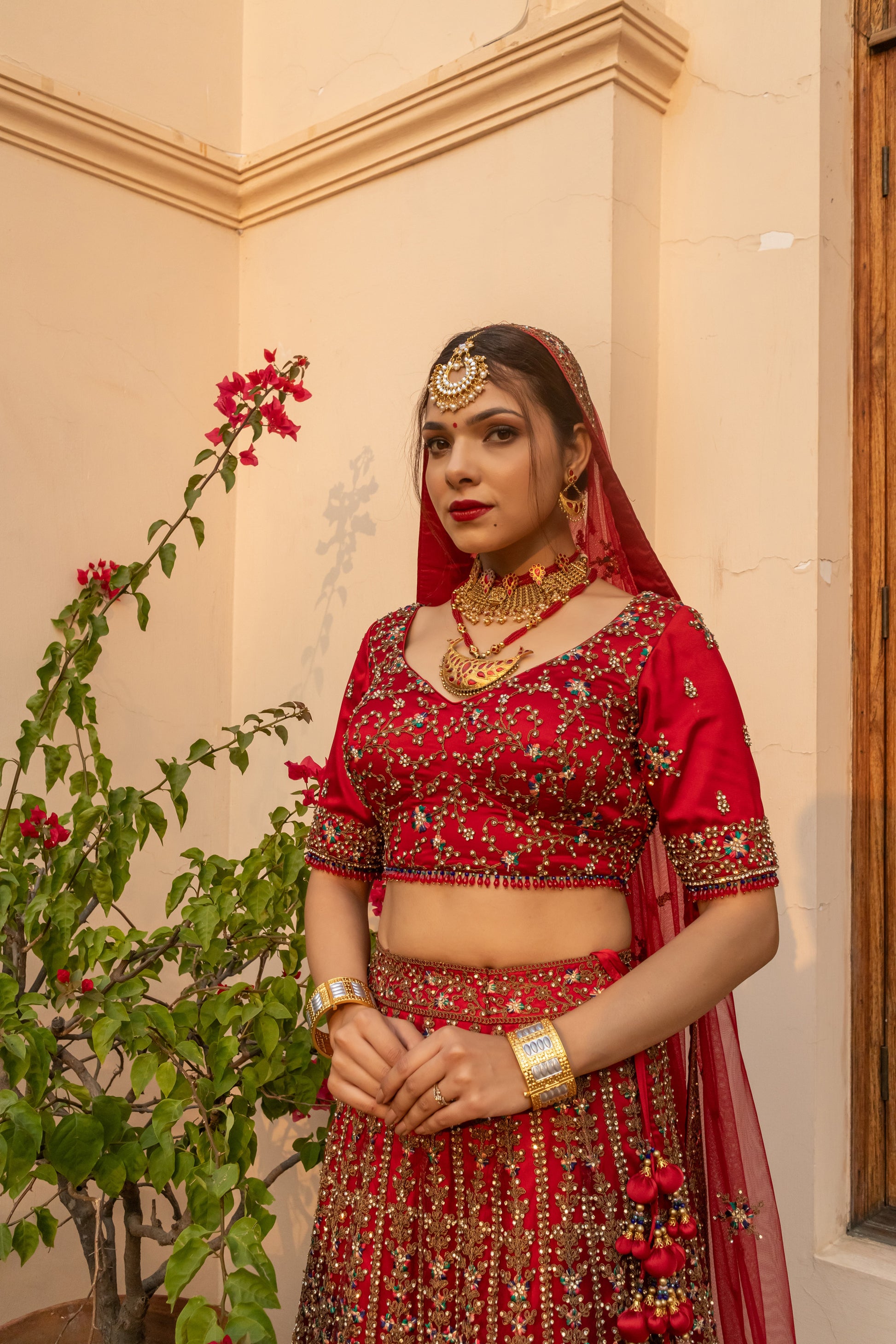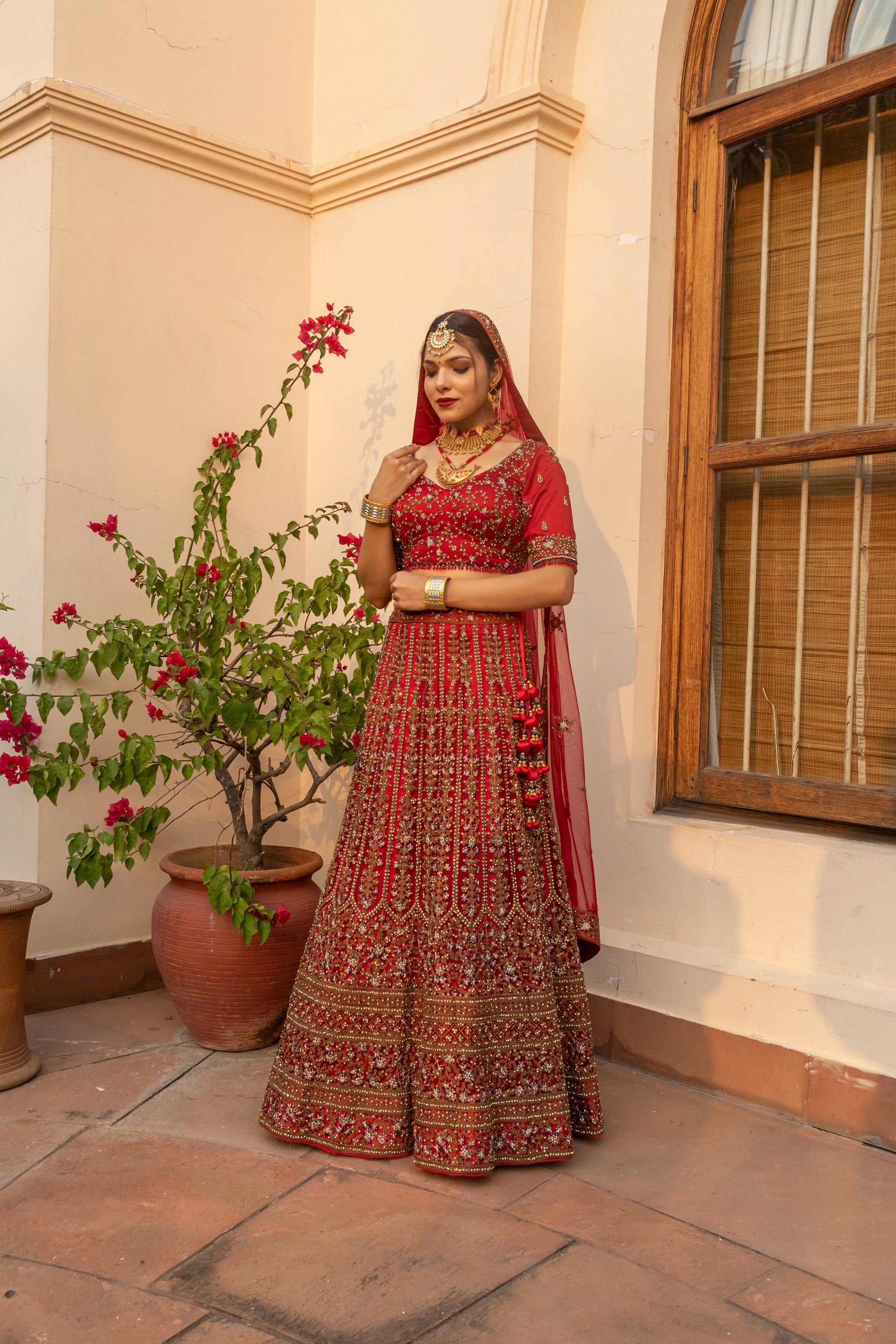 Crafted for unforgettable entrances, this ruby red lehenga in delicate net fabric is elevated with dori and intricate hand embroidery, forming motifs that shimmer with gold and tradition. The silhouette flows with grace, while customised tassels add movement and detail that celebrate the art of finishing.