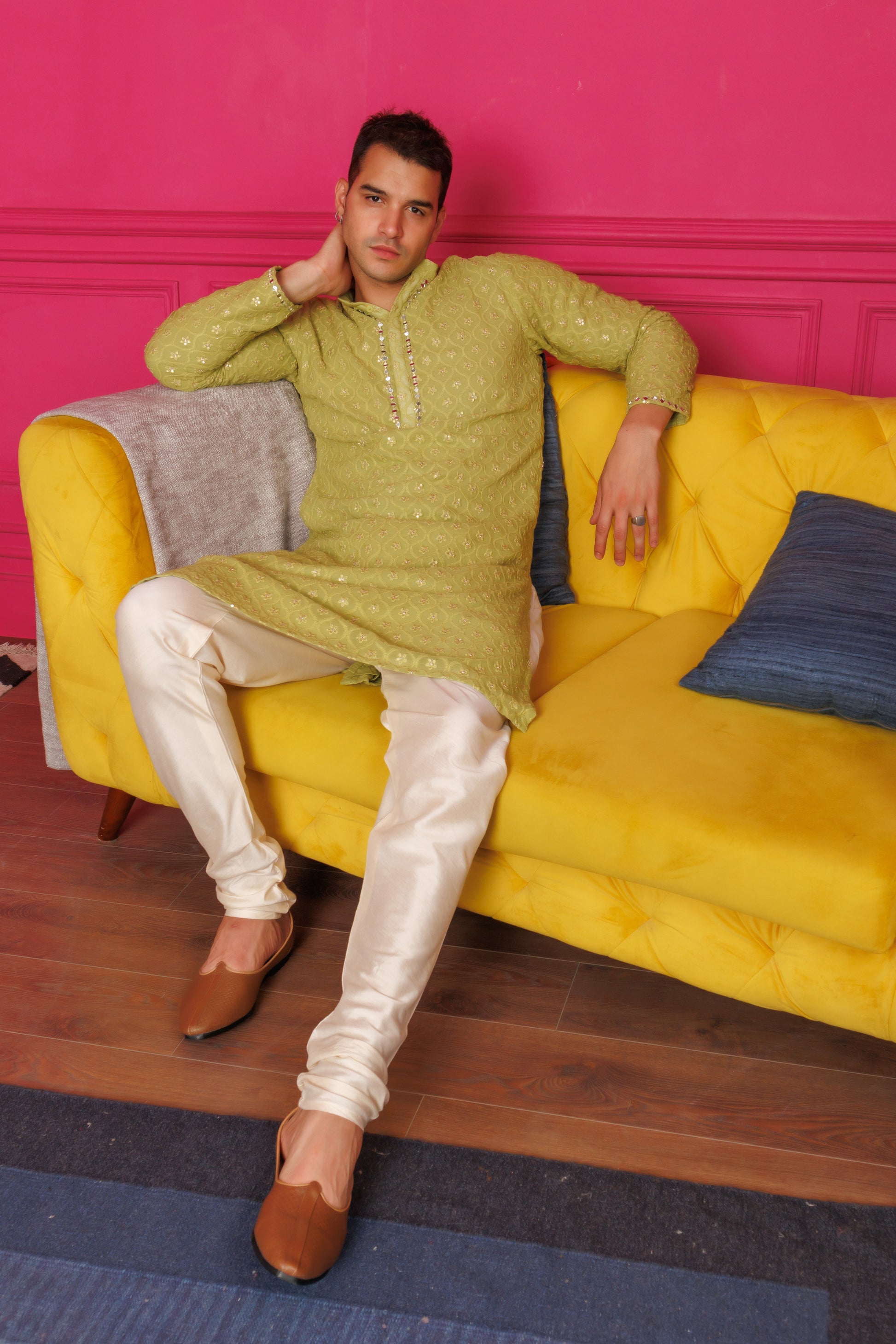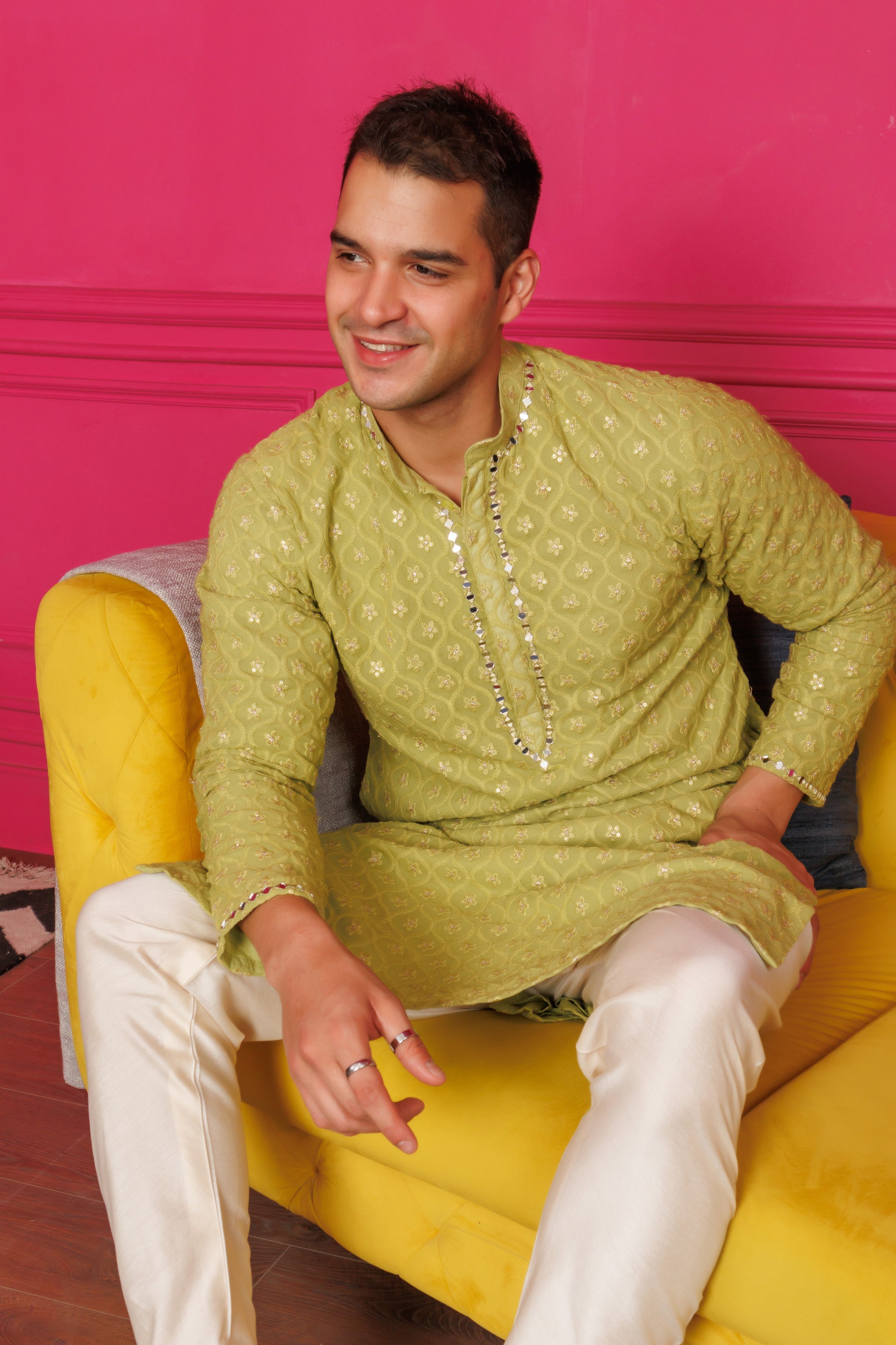 Playful long kurta in georgette, uplifted with sequin and mirror work around the yoke and sleeves. Paired with a silk churidar.