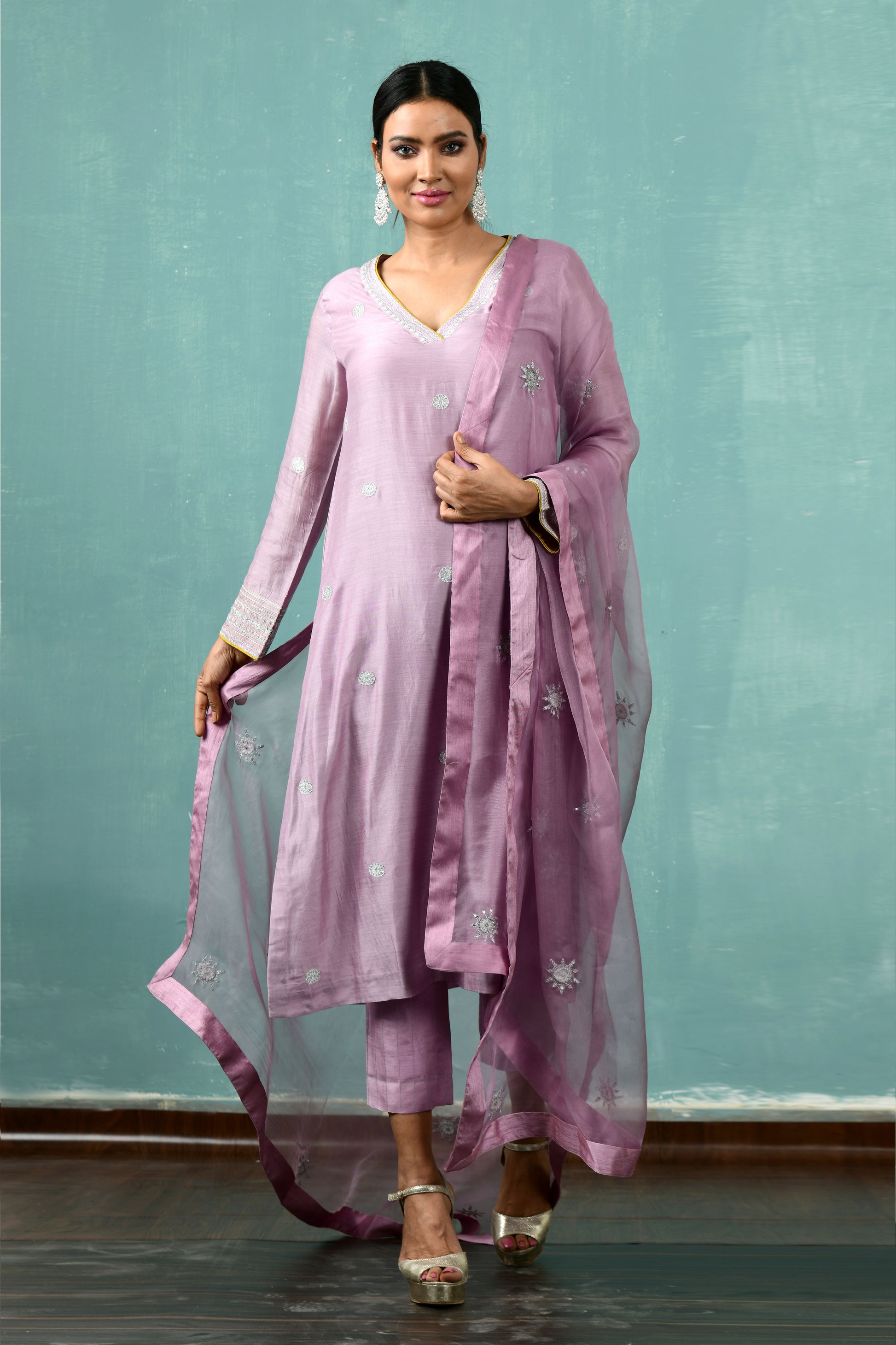 Our Lavender Cotton Silk Assam Buta Patchwork A-line Kurta with intricate hand embroidery paired with an organza dupatta and cotton silk embroidered pants are a treat to wear.