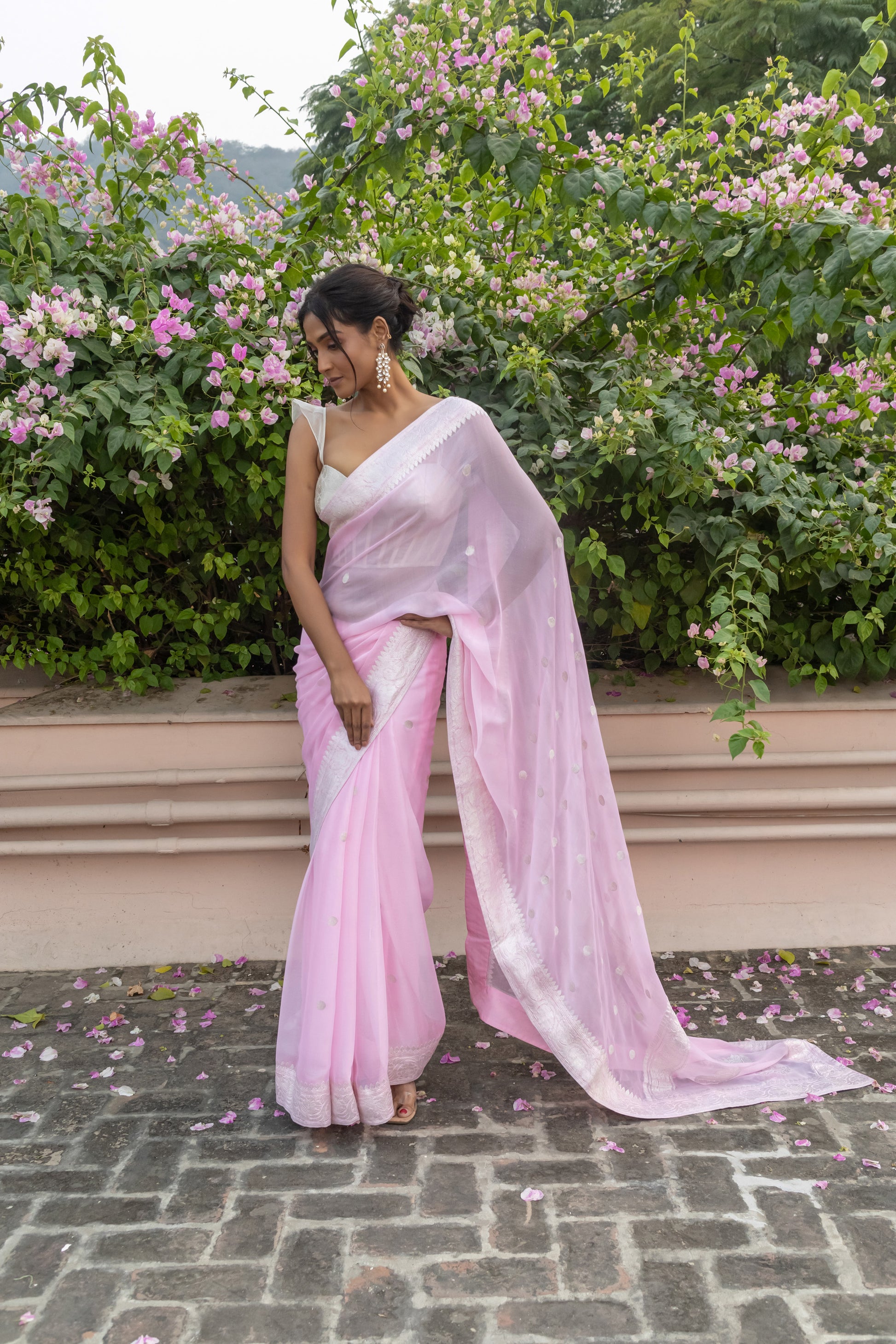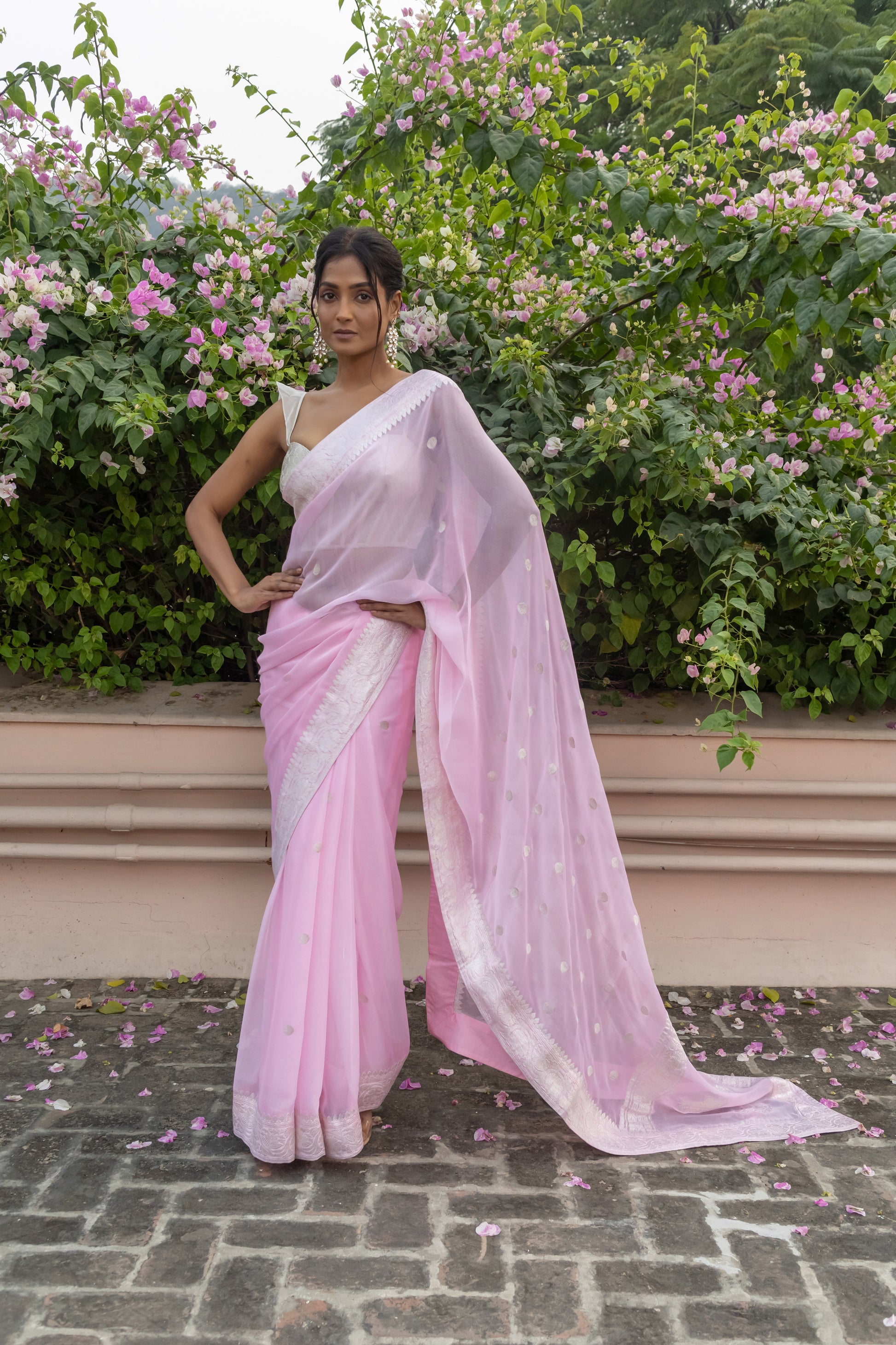 The Baby Pink Reverie banarasi chiffon saree is a timeless embodiment of sophistication. Crafted with a delicate, intricate border that graces the fabric, it’s paired with a matching tone-on-tone blouse piece to create a look of understated elegance. This lightweight plain weave saree is a perfect choice for festive and formal occasions where tradition meets refinement.