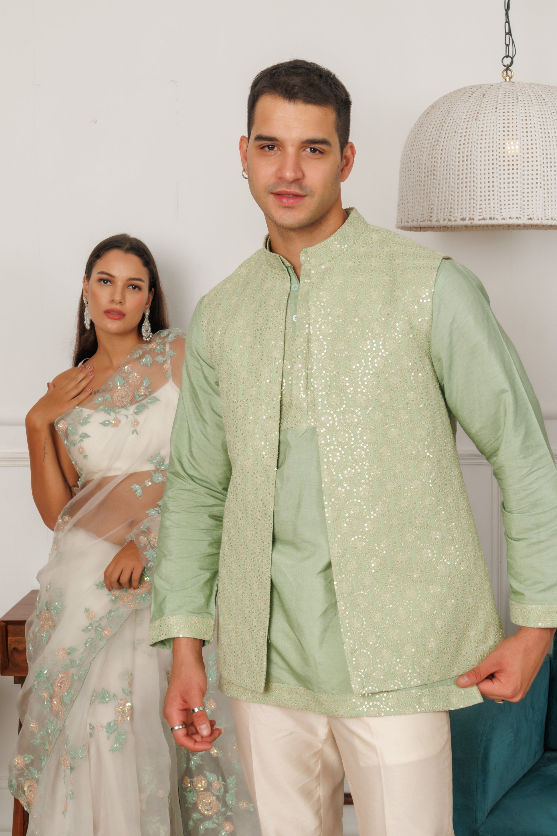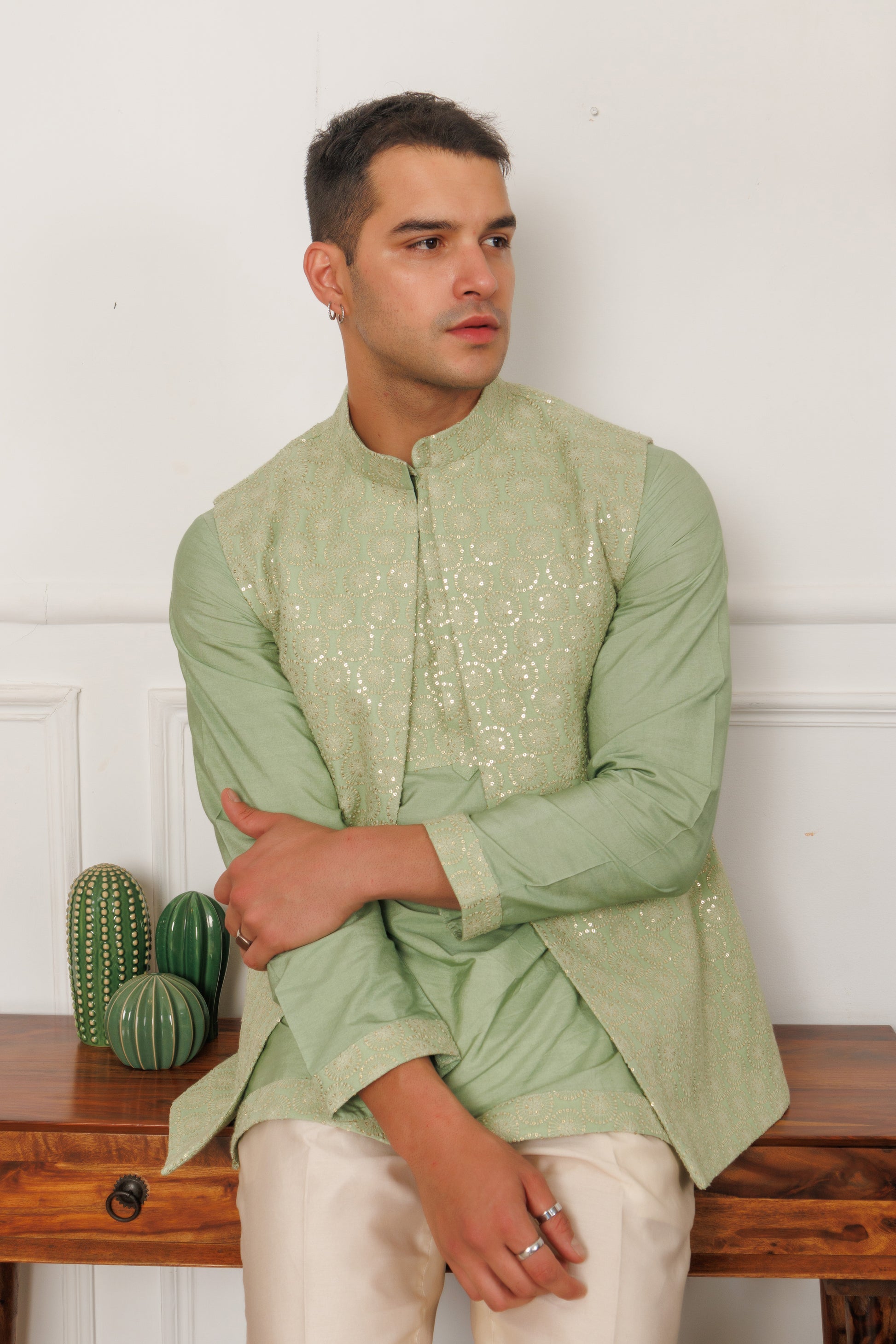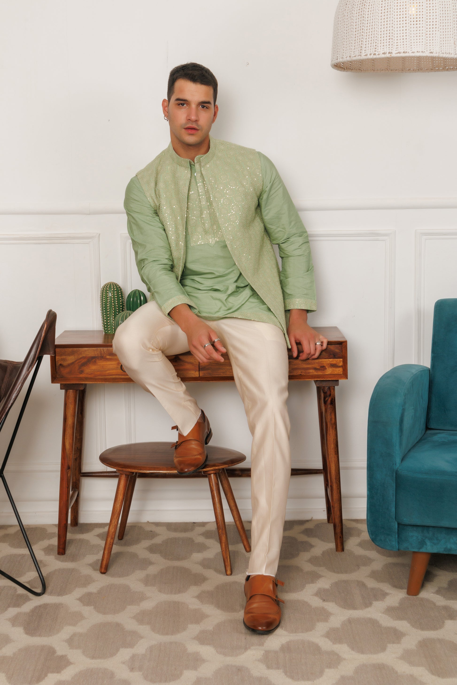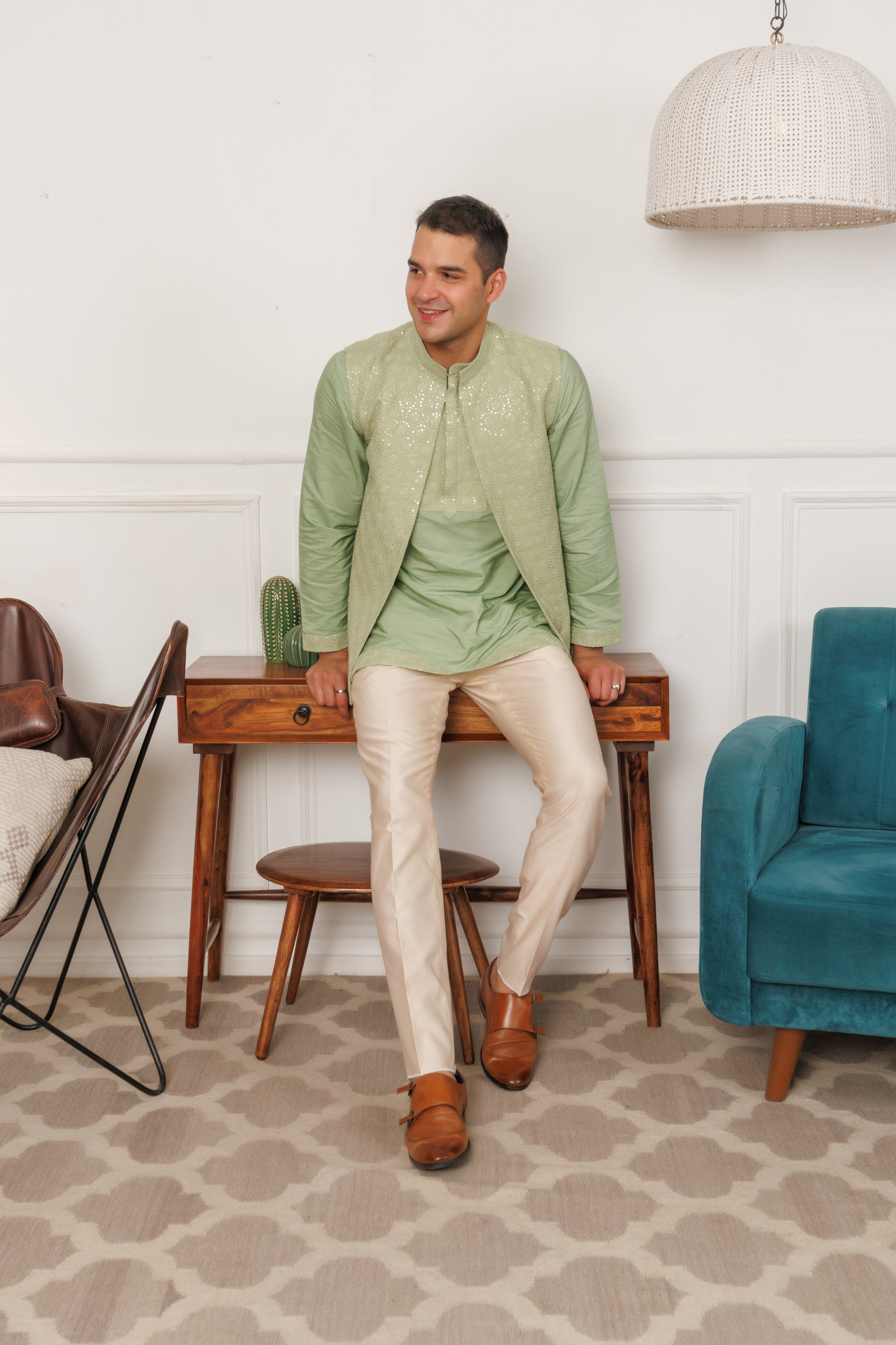Playful yet classy, this sage green Nehru jacket is embroidered with beautiful golden sequins. The same detailing can be seen on the tonal short kurta made from cotton silk to bring the look together. The outfit is balanced out with cotton silk cream trousers.
