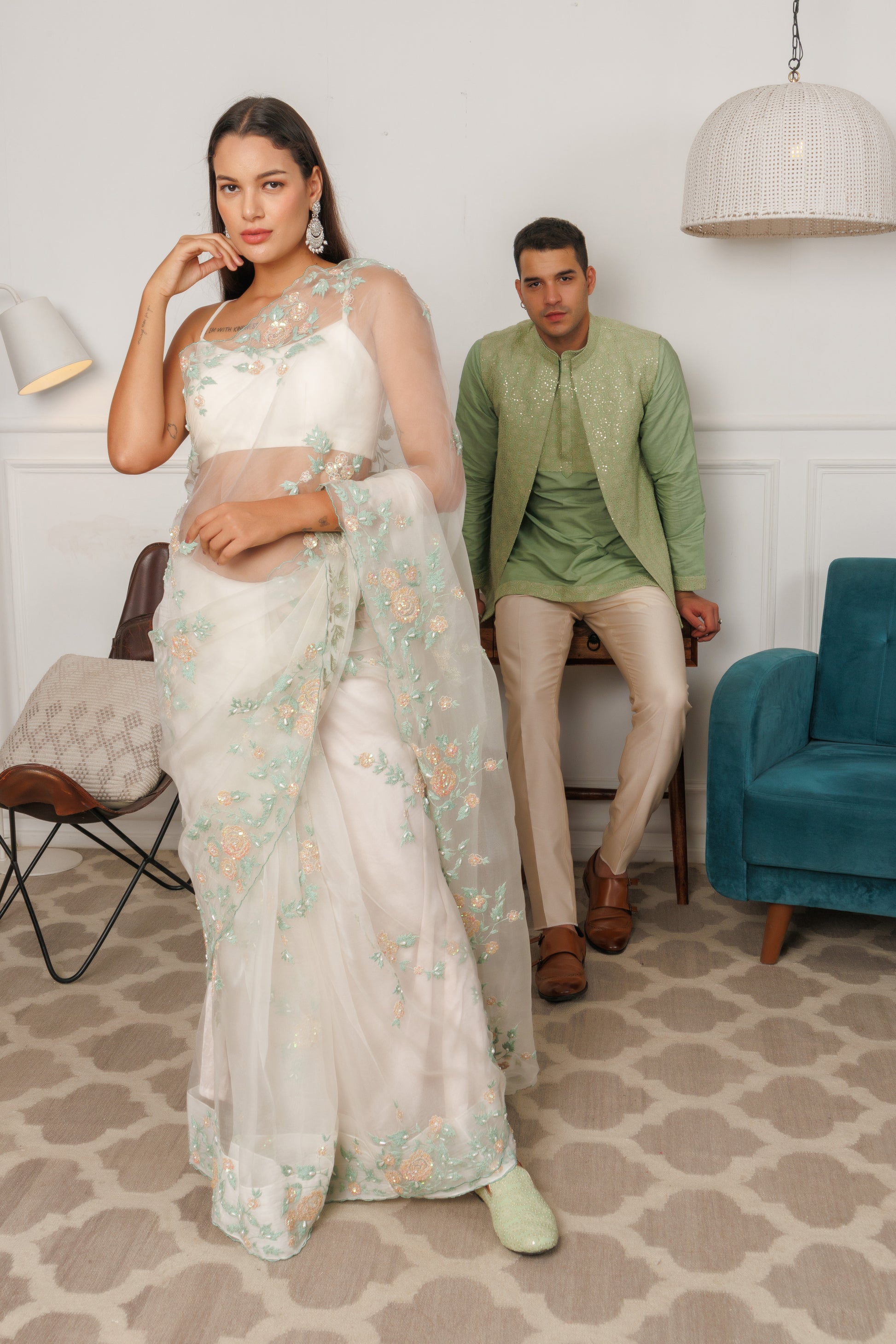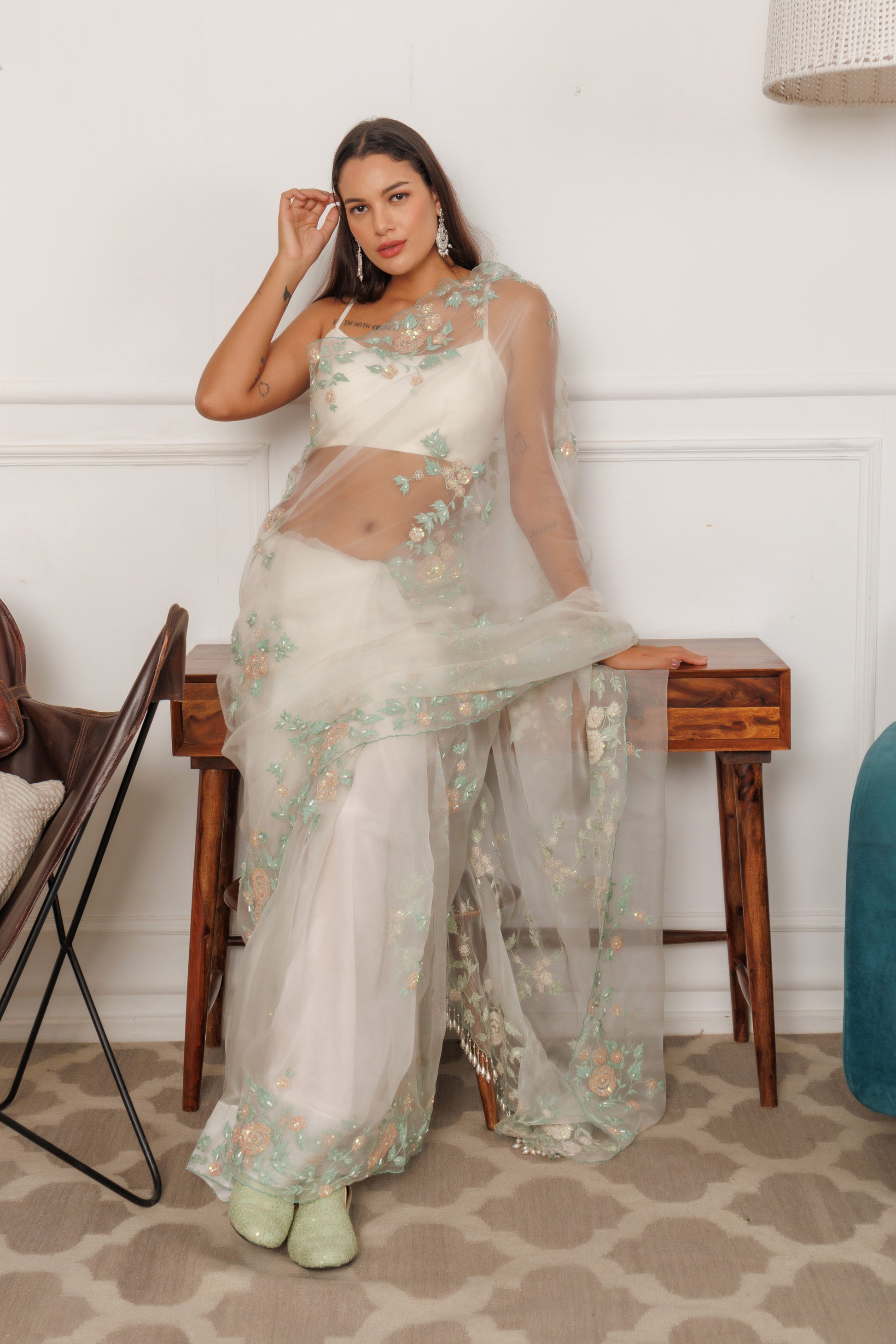 This elegant white organza saree is adorned with delicate mint green and peach floral embroidery and intricately finished with sequin handwork and threadwork, creating a timeless and sophisticated ensemble.