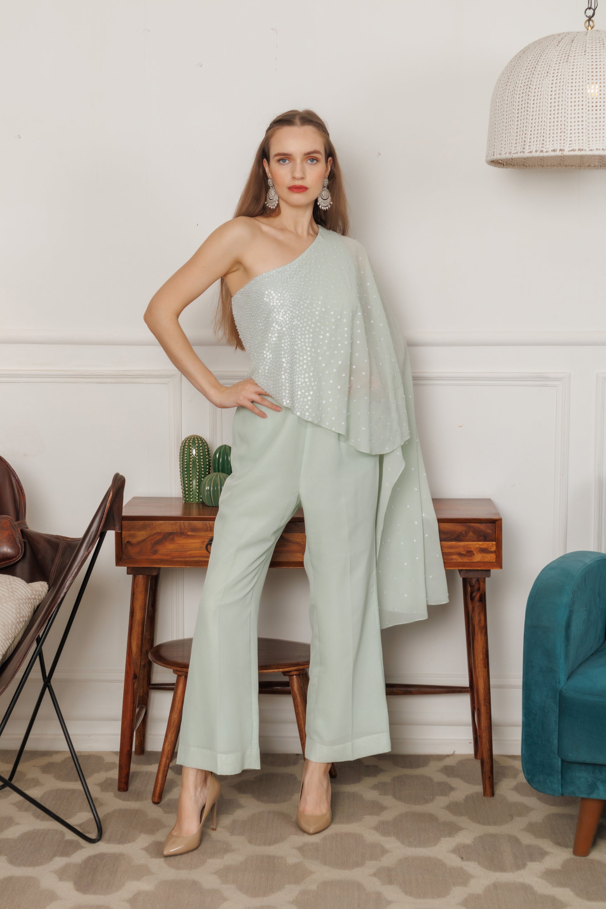 This gorgeous one shoulder co-ord set made from a fine georgette is a trendy choice for those who like keeping up with the times. Hand finished with shimmering sequins on the top. Highlighted with gleaming details, this set is perfect for gleaming soirees.