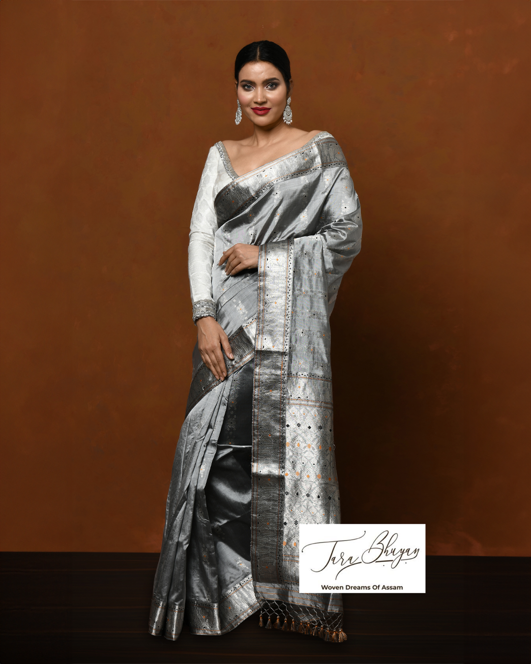 Once again a timeless classic Assam Paat (Silk) Silverish Grey Saree, handwoven with pure silver zari brocade and buta-work on the entire body of the saree with coral and black Meena work is an elegance that never fades.