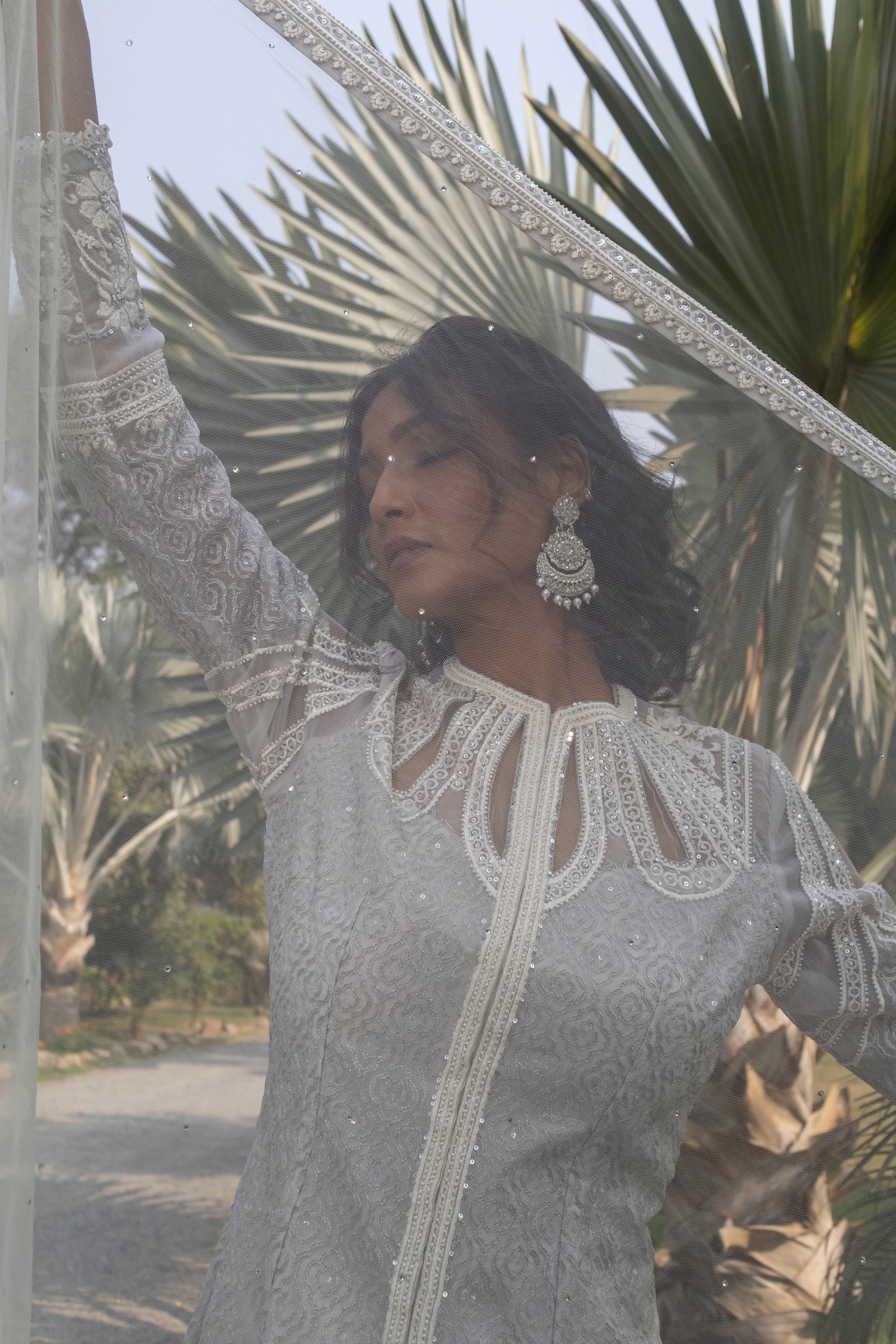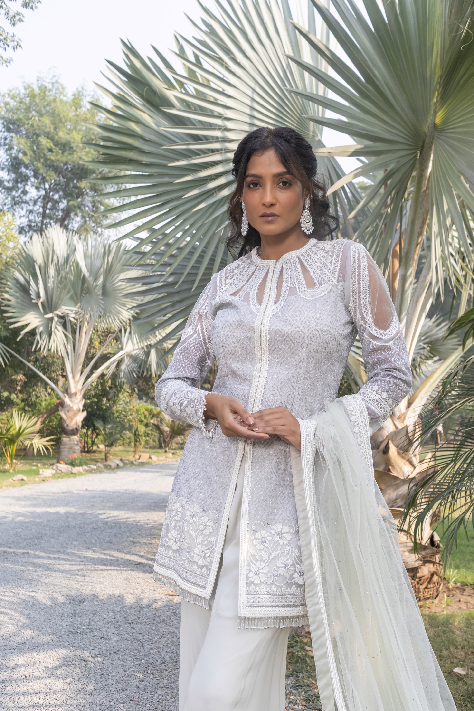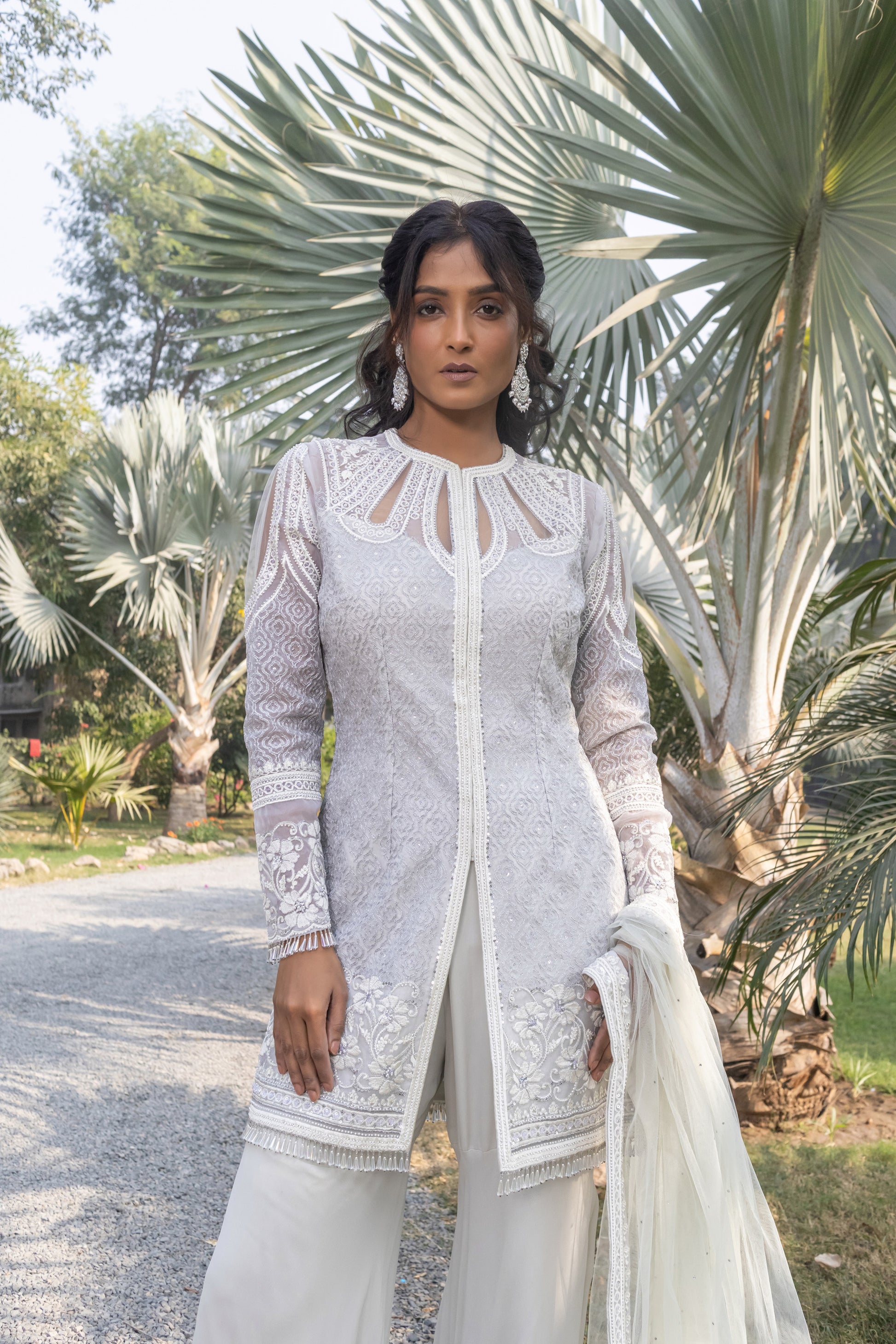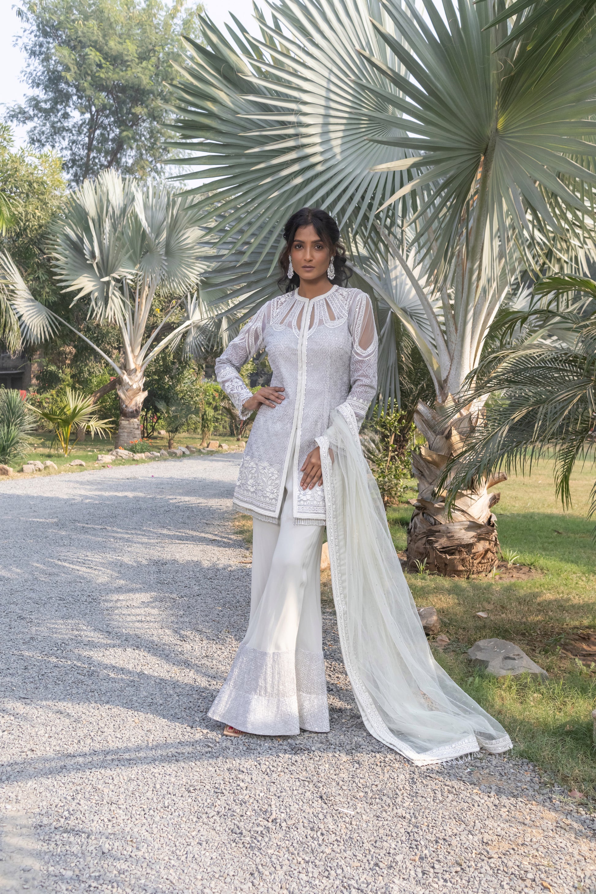 This smoke grey jacket-style sharara set is tailored in a contemporary silhouette with a graceful fall. The intricately embroidered jacket features a combination of machine and hand embroidery, lending texture and richness to its subtle hue. It is paired with flowing georgette sharara pants with embroidered borders and a soft embroidered net dupatta, finished with delicate crystal bead droplets. Perfect for festive gatherings, evening weddings, or intimate celebrations, this ensemble is elegance in its most effortless form.
