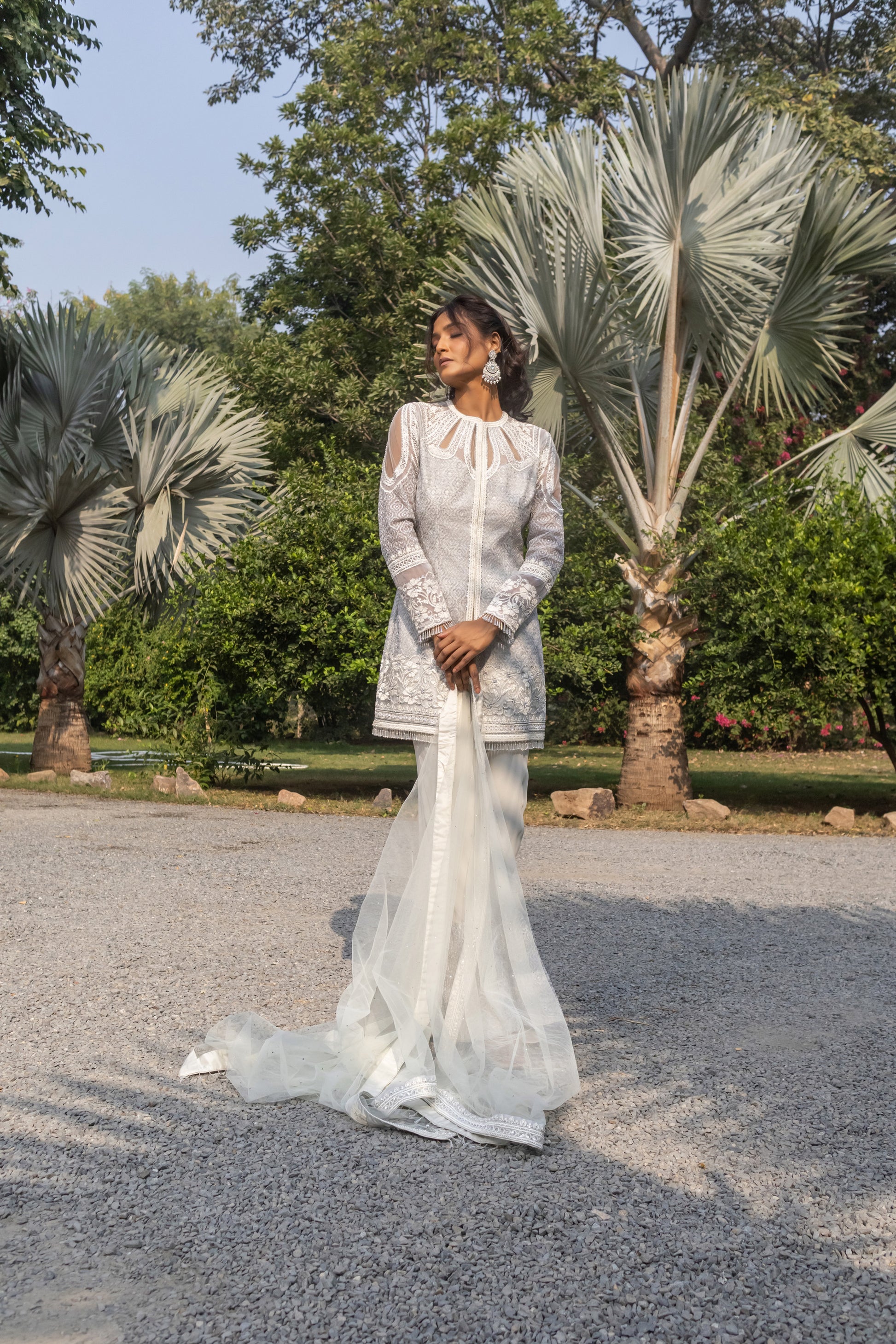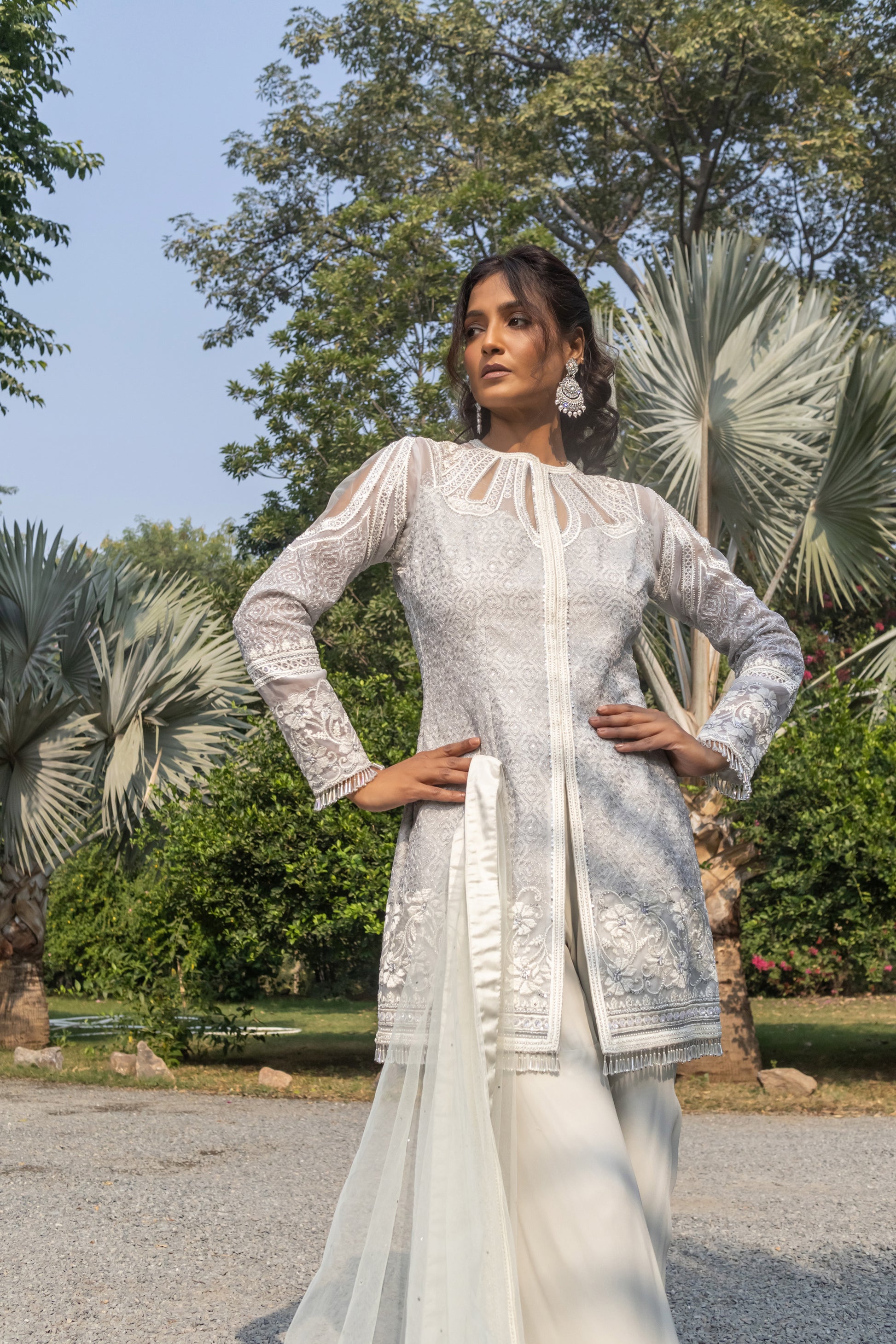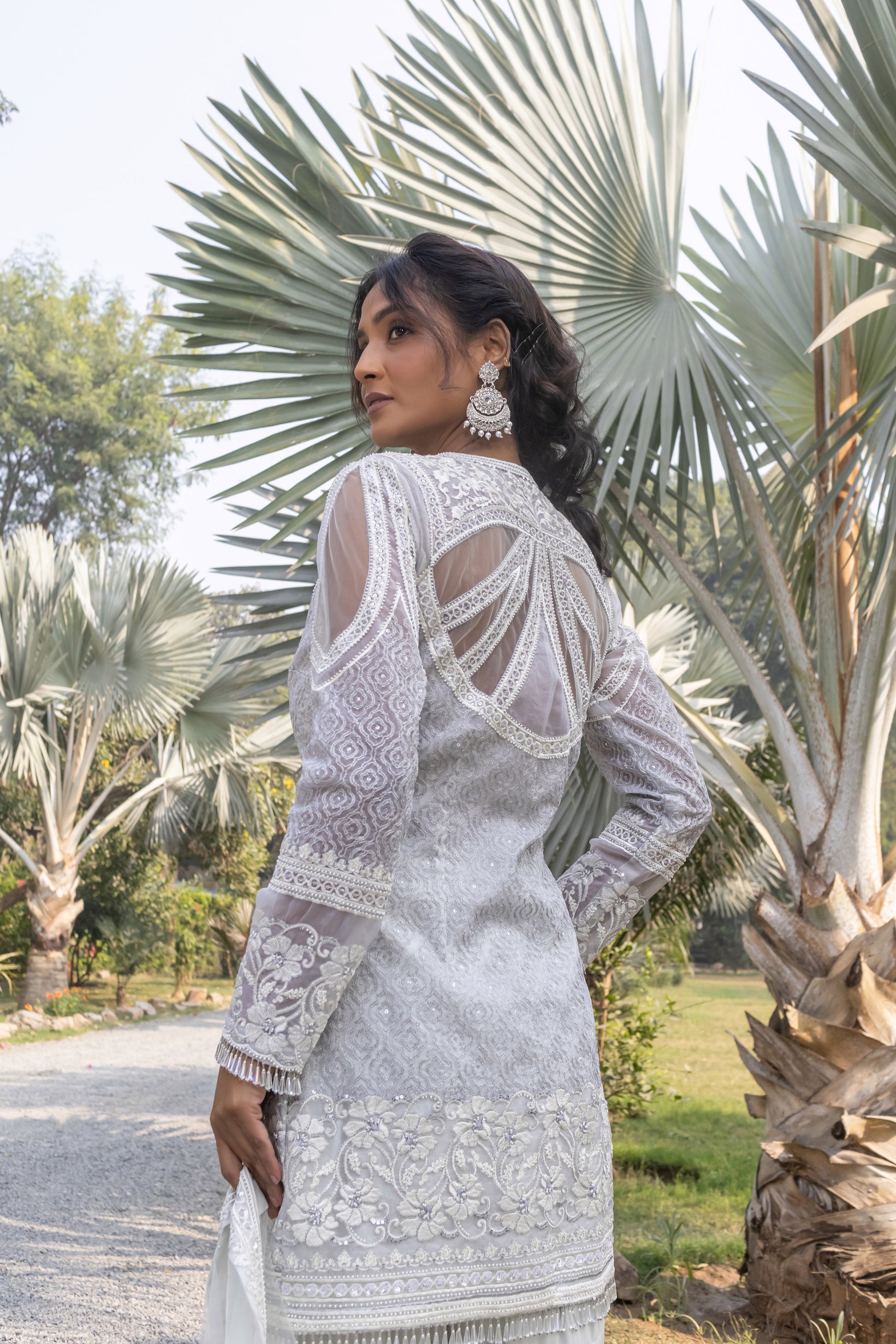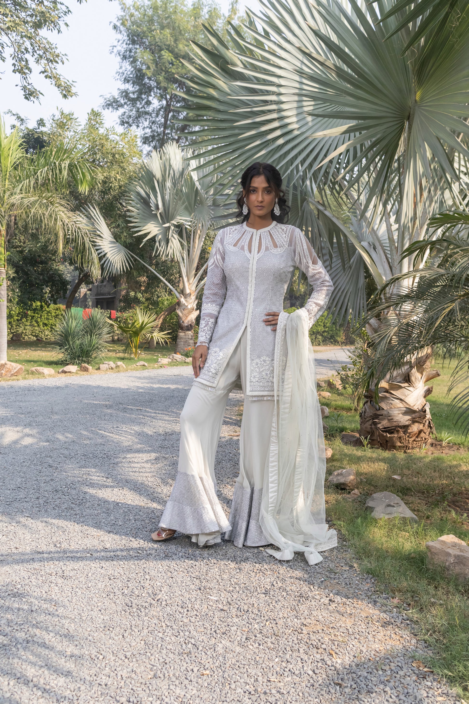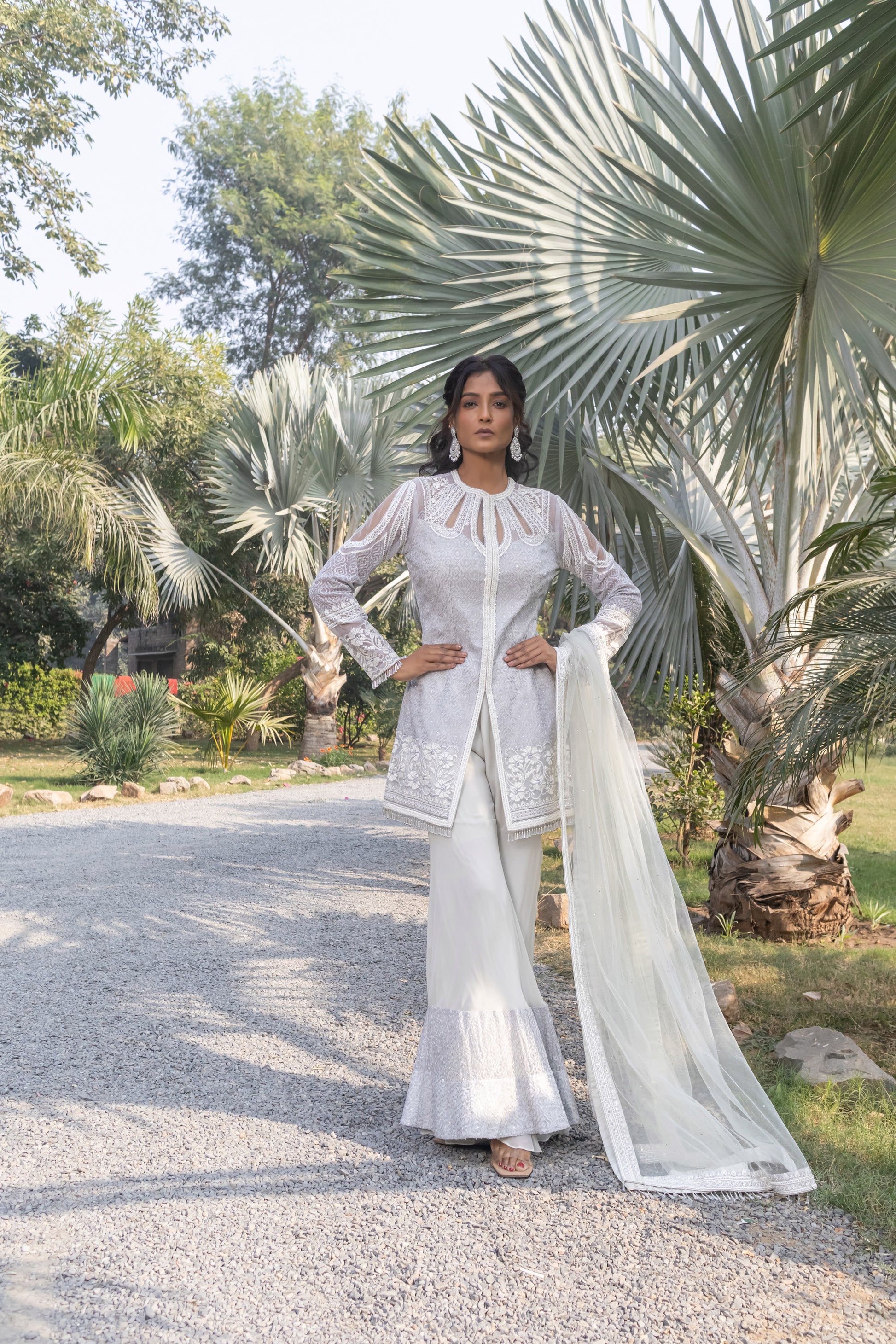 This smoke grey jacket-style sharara set is tailored in a contemporary silhouette with a graceful fall. The intricately embroidered jacket features a combination of machine and hand embroidery, lending texture and richness to its subtle hue. It is paired with flowing georgette sharara pants with embroidered borders and a soft embroidered net dupatta, finished with delicate crystal bead droplets. Perfect for festive gatherings, evening weddings, or intimate celebrations, this ensemble is elegance in its most effortless form.