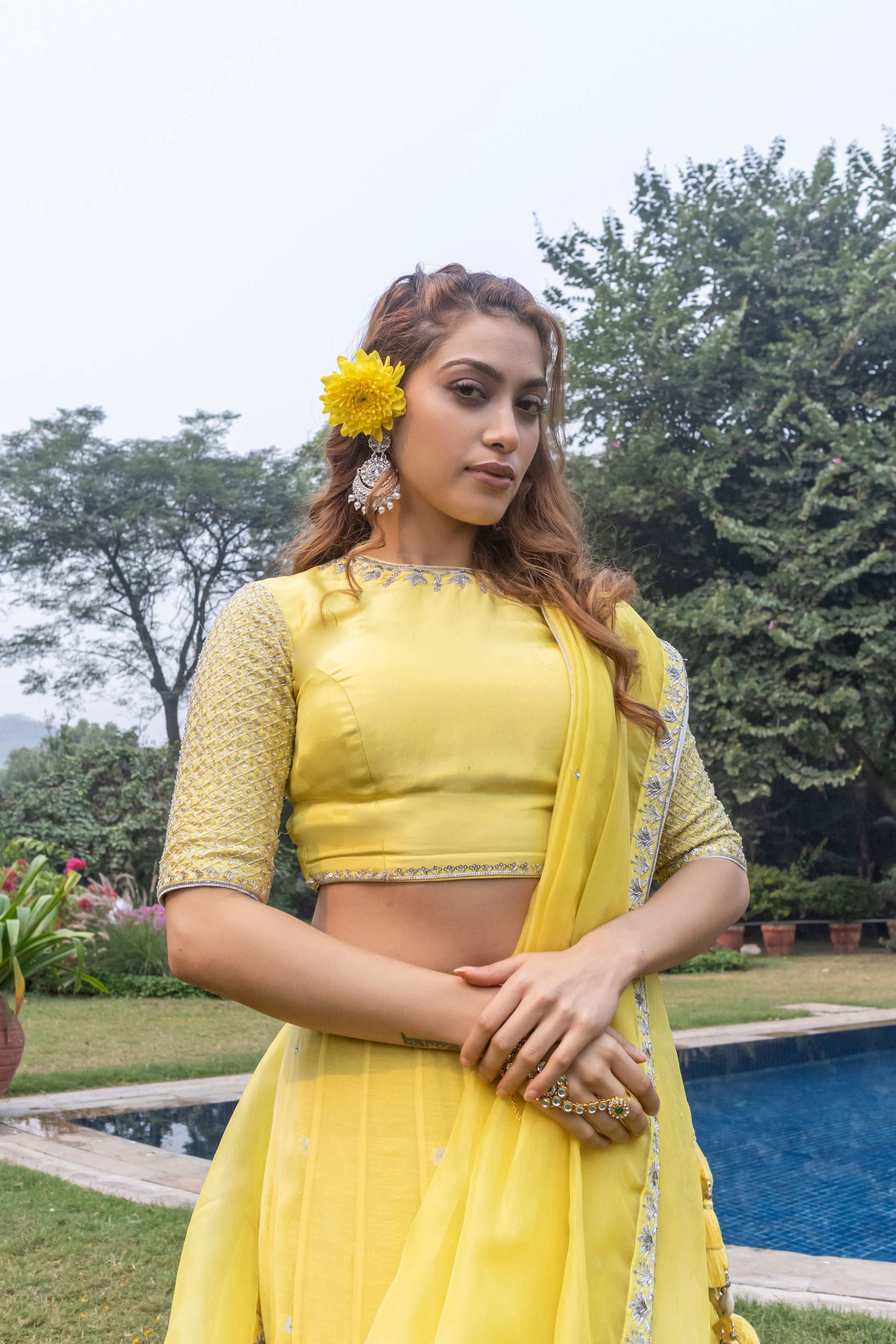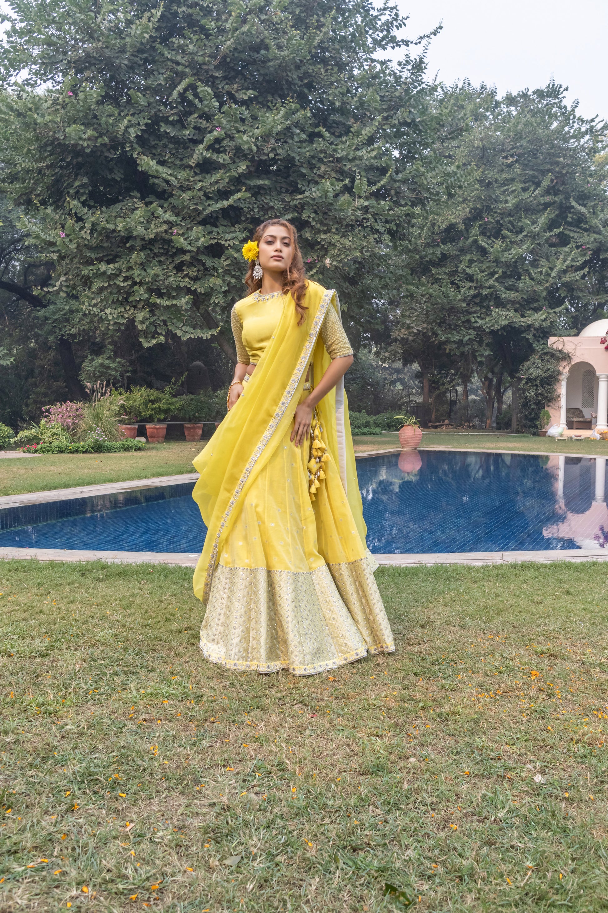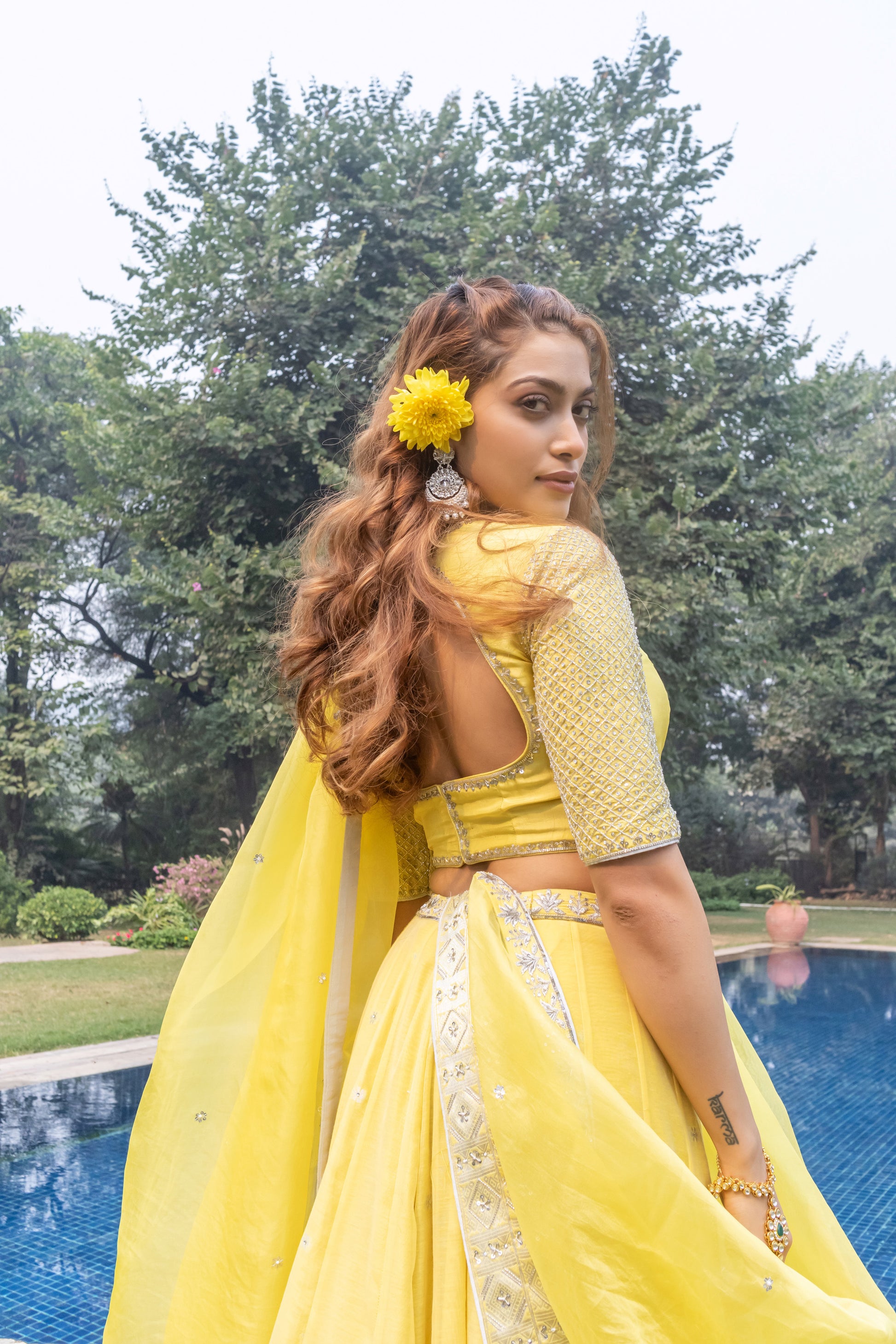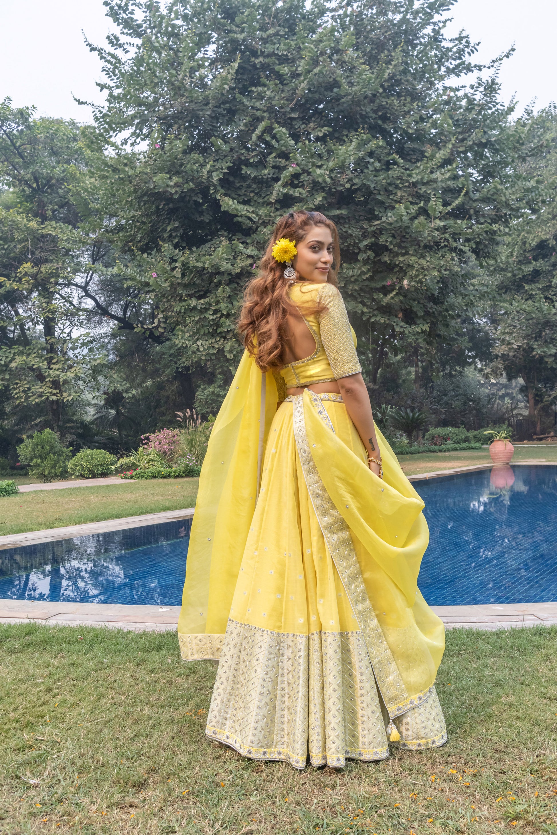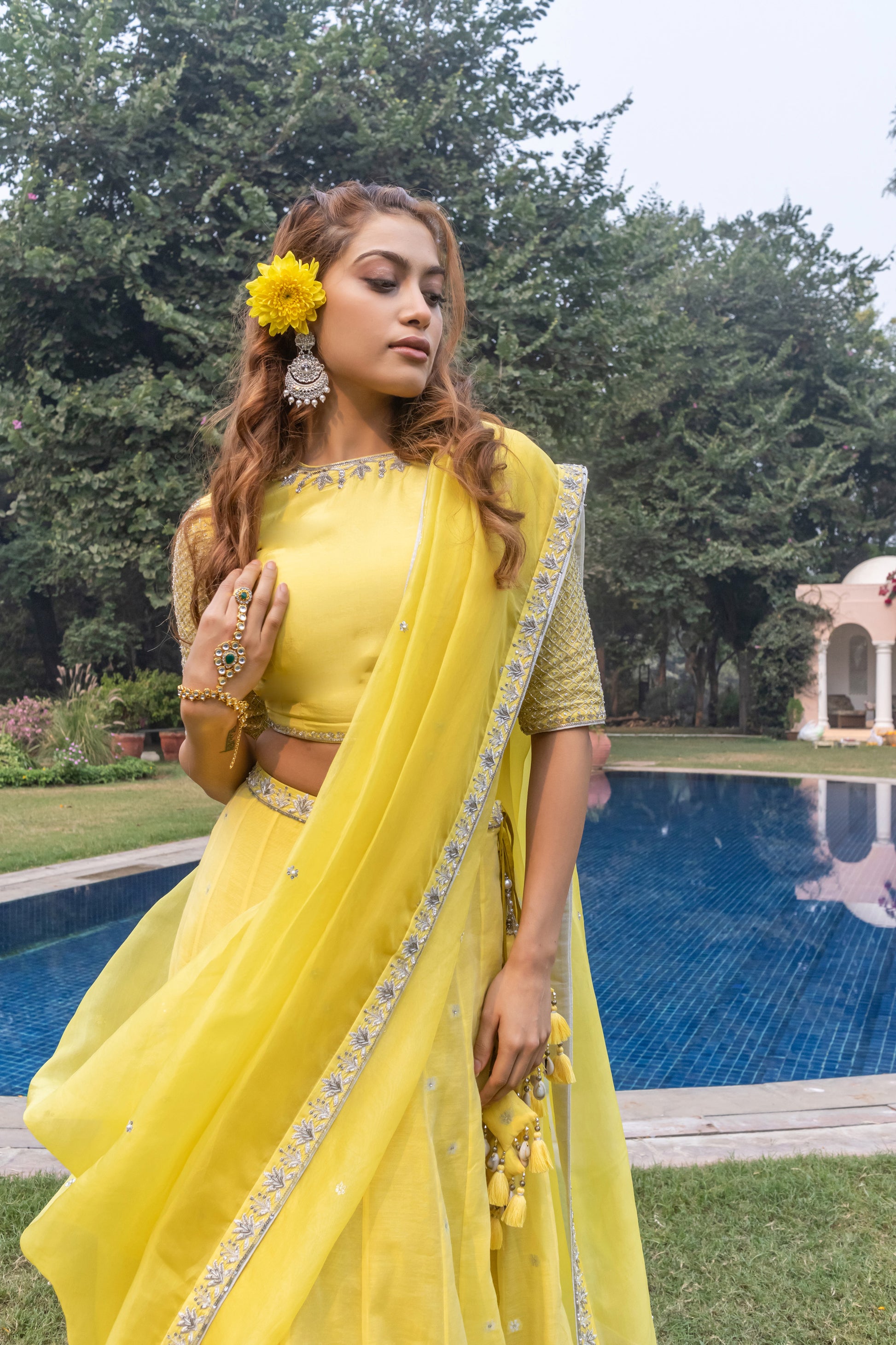 A sheer pure silk organza dupatta — embroidered throughout and detailed with four-corner tassels — drapes effortlessly, while customised lehenga tassels lend a festive finishing touch. Ideal for haldi, summer weddings, or day rituals, this ensemble brings warmth, tradition, and light together.