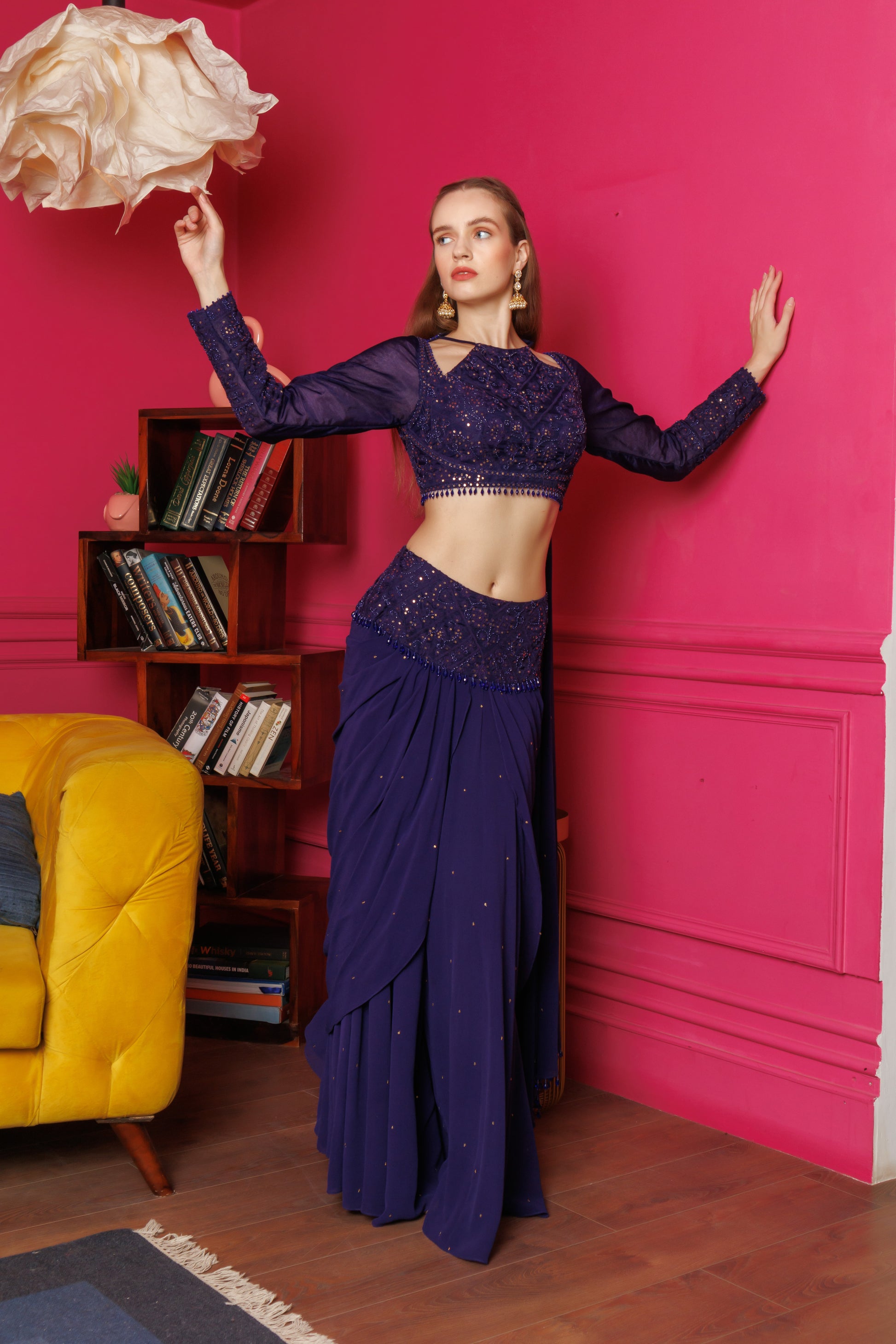 This midnight blue sequin drape skirt and top set is the perfect look for festive evenings, and cocktail nights! Finished with beaded tassels and zardozi work.