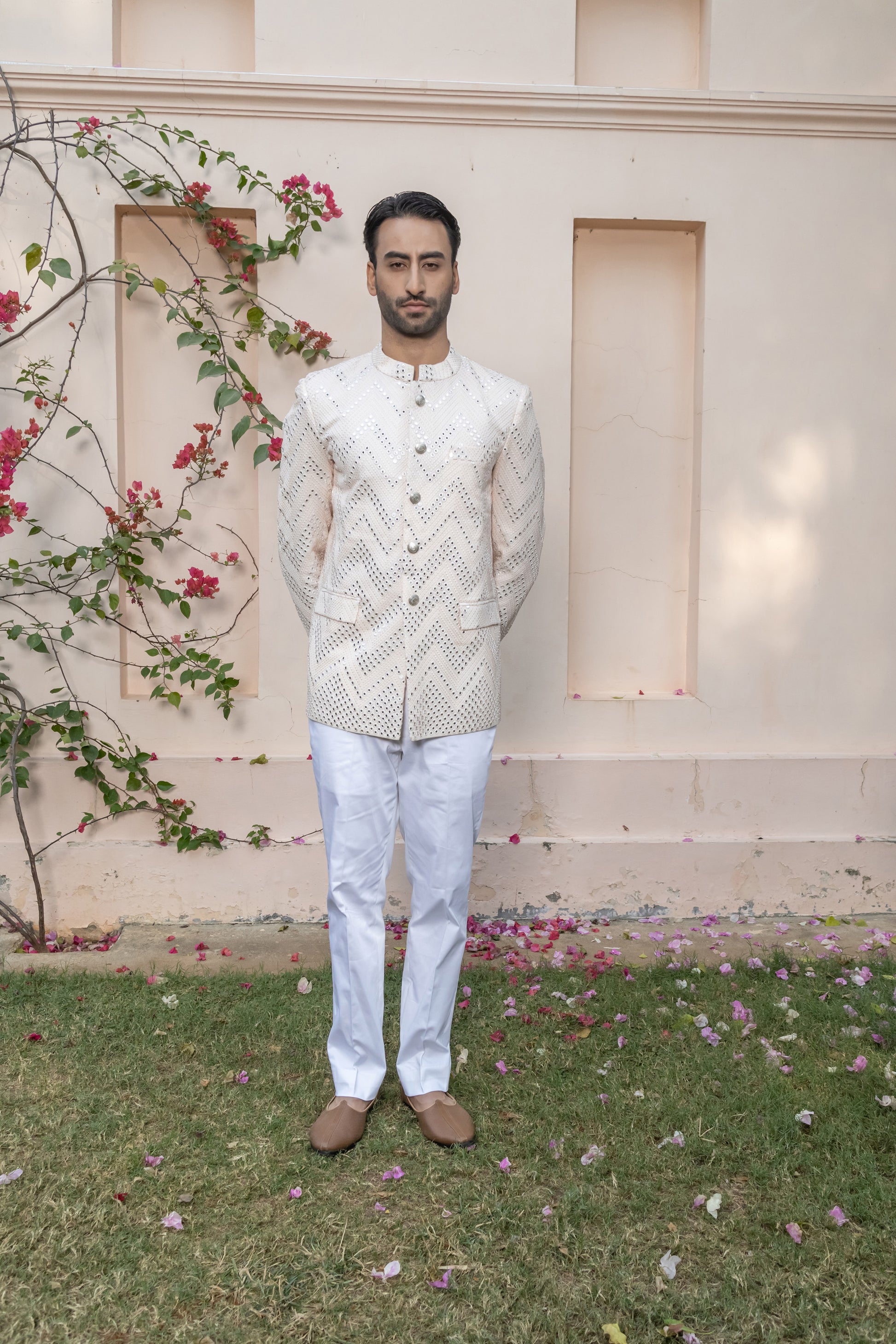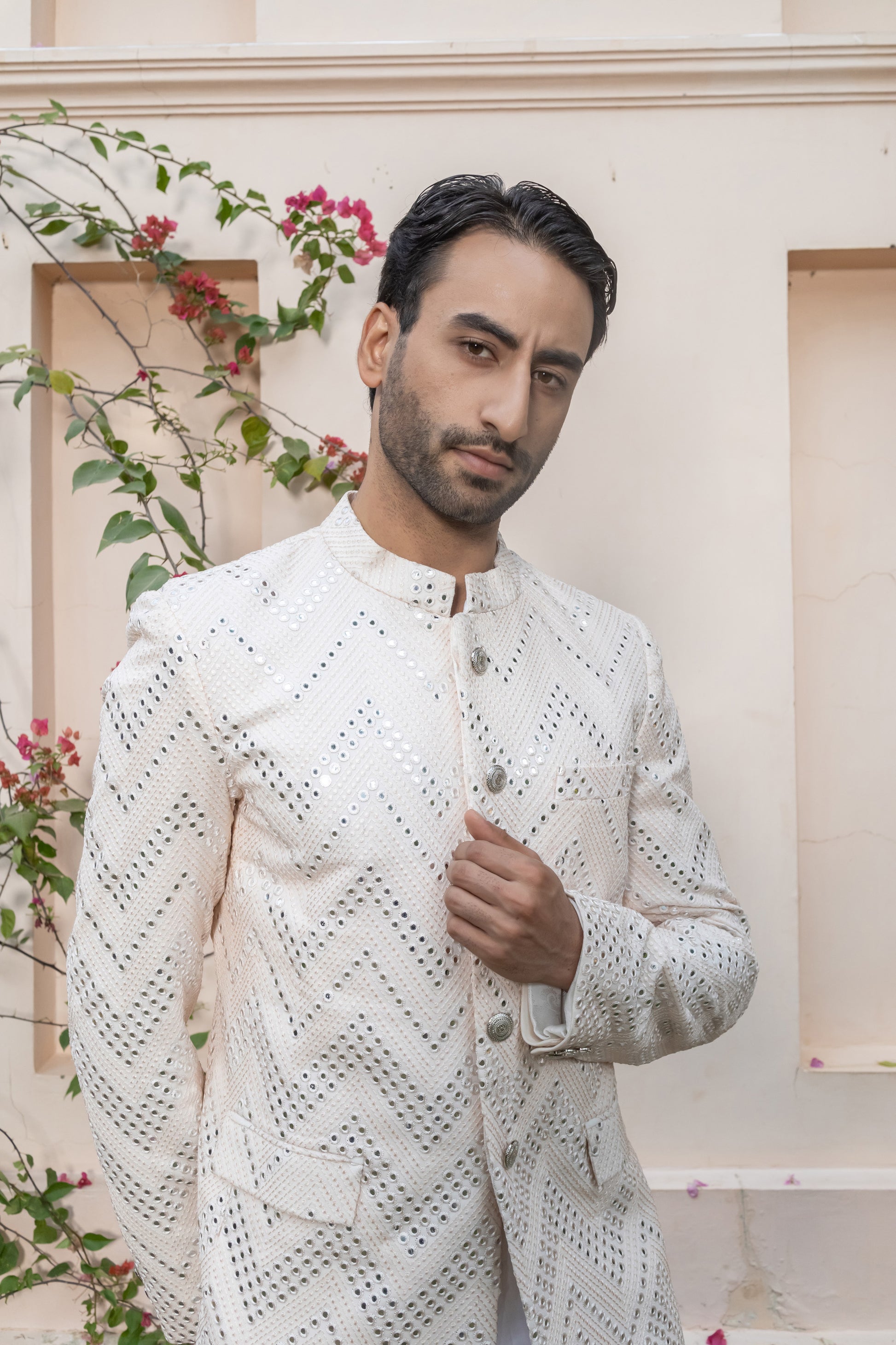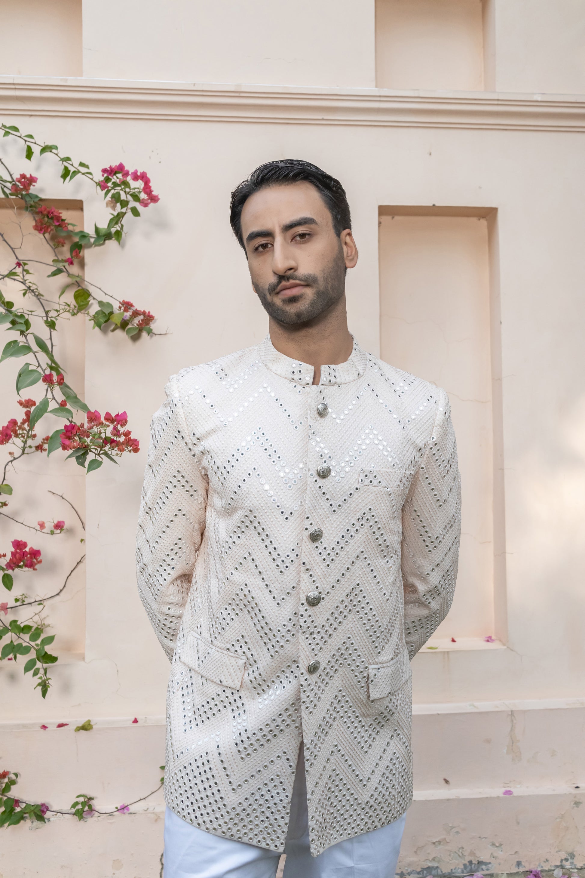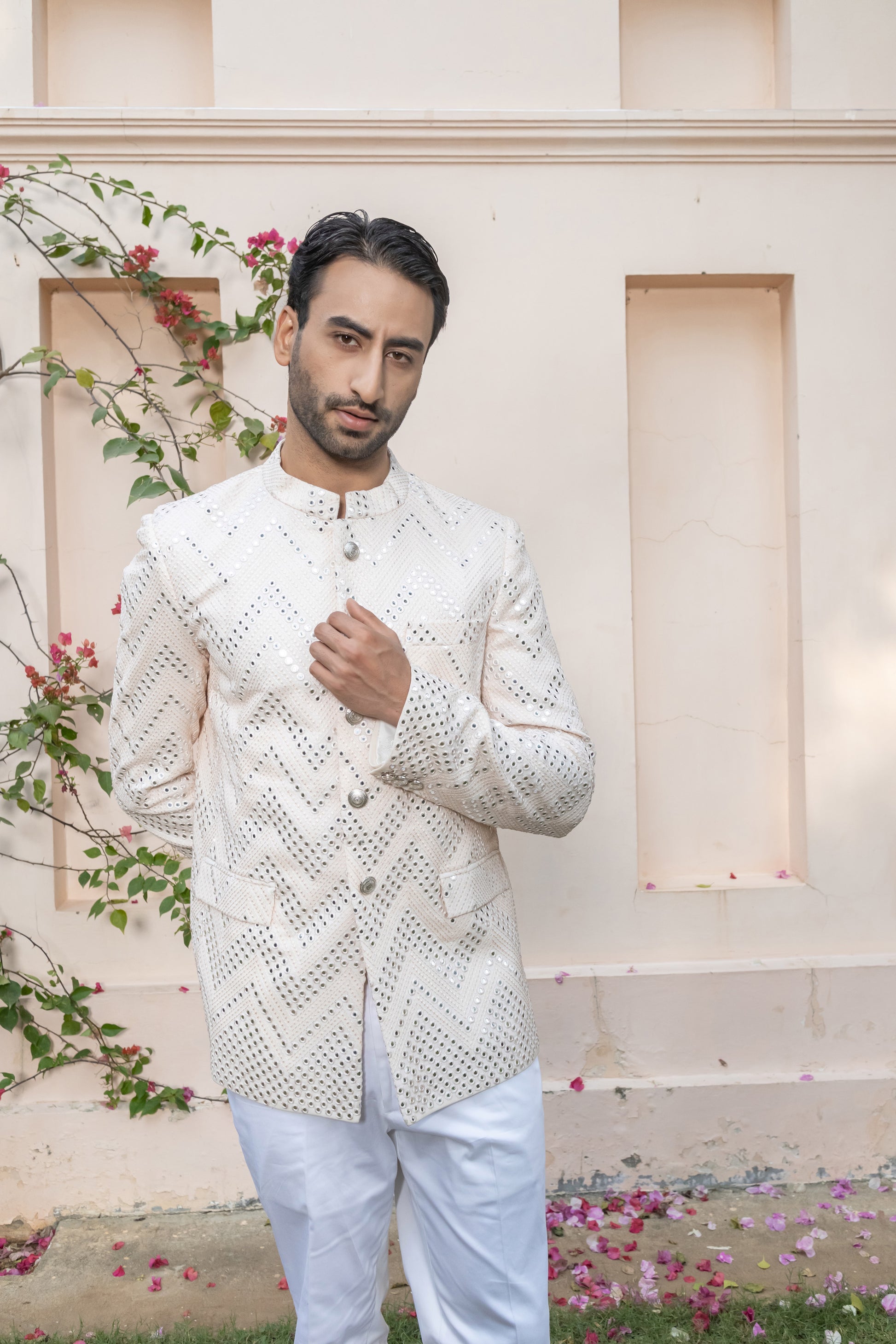 Tailored to perfection and paired with crisp white trousers, this ensemble makes an elegant statement for weddings, sangeet nights, or formal celebrations. It’s refined, celebratory, and crafted for the man who dresses with quiet confidence.